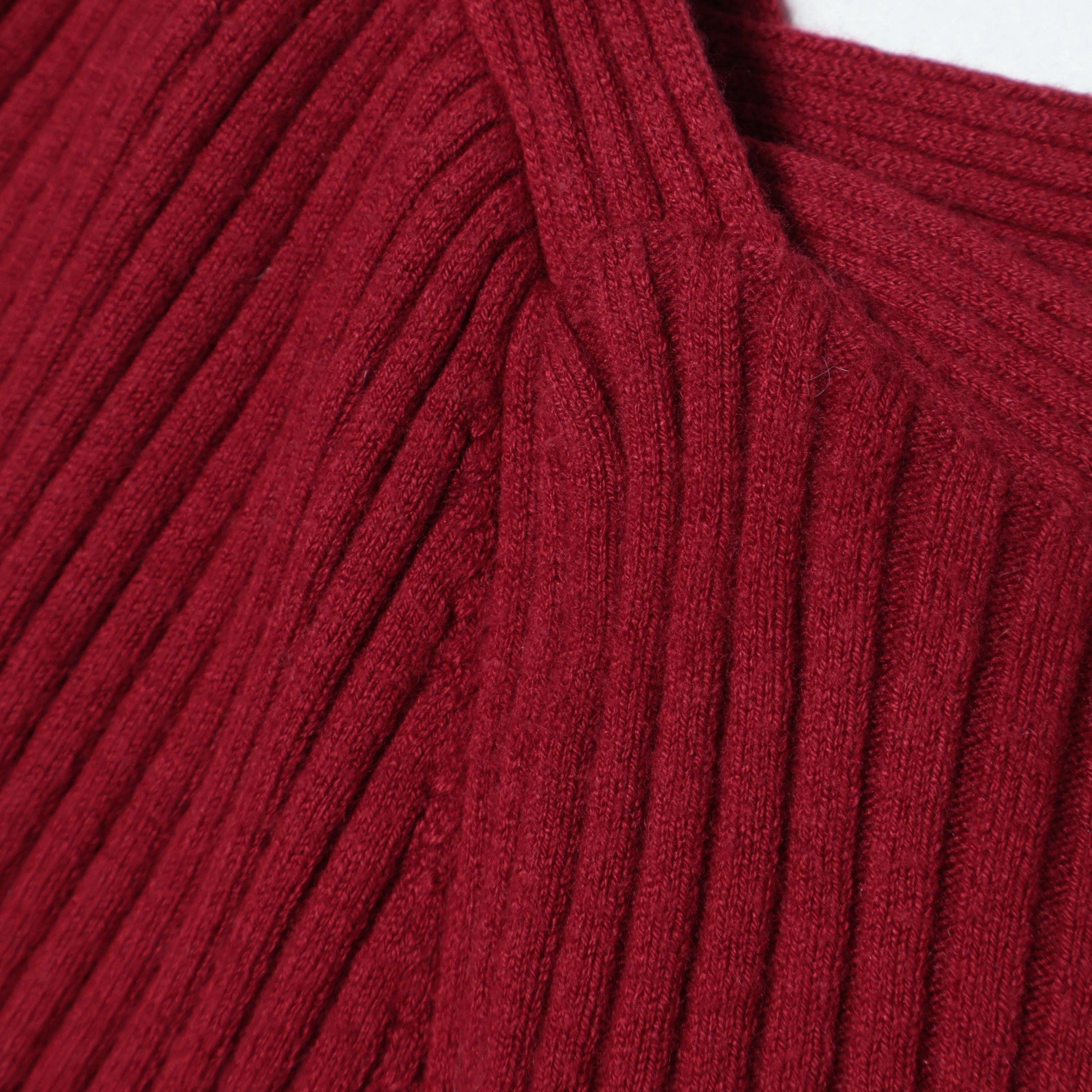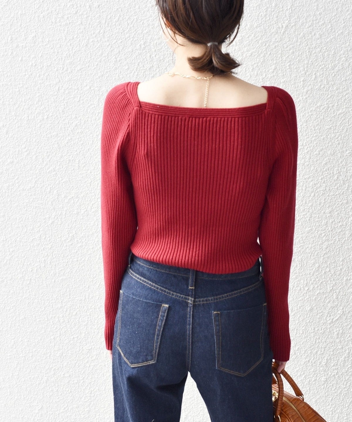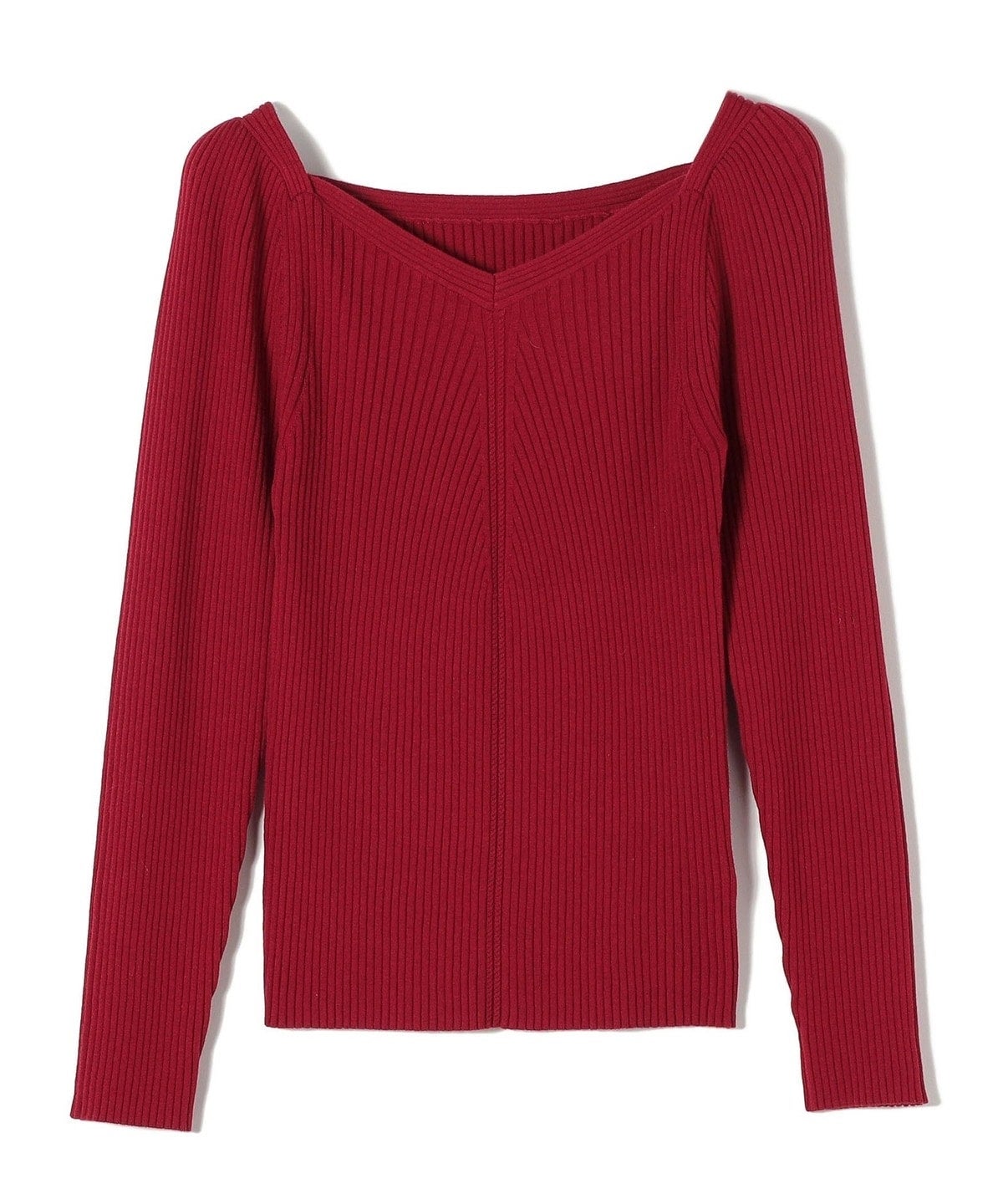 デコルテラインがきれいに見える、変形スクエアネックのリブニット。