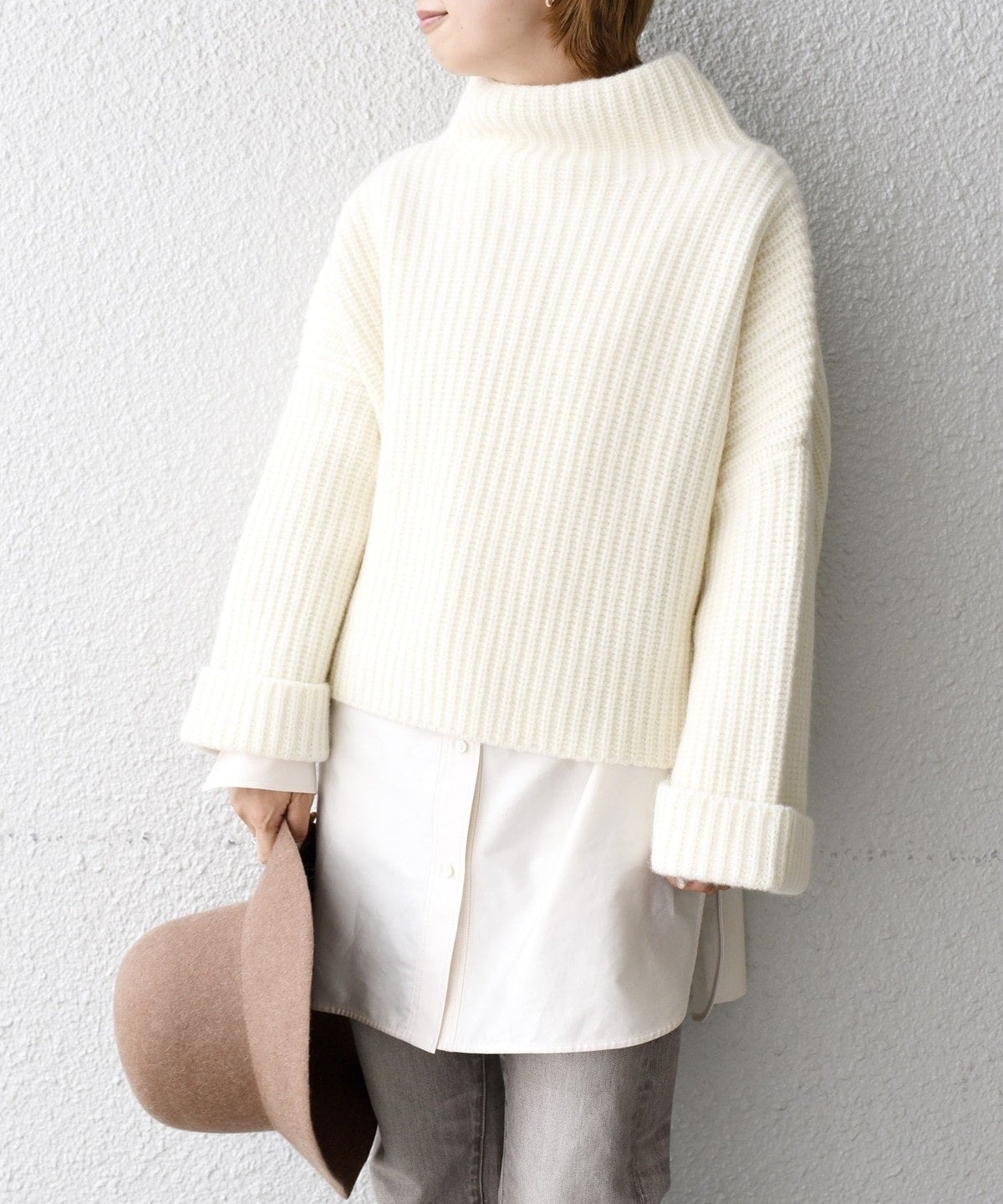 ハイネックな首元と袖の存在感がポイントのニット。