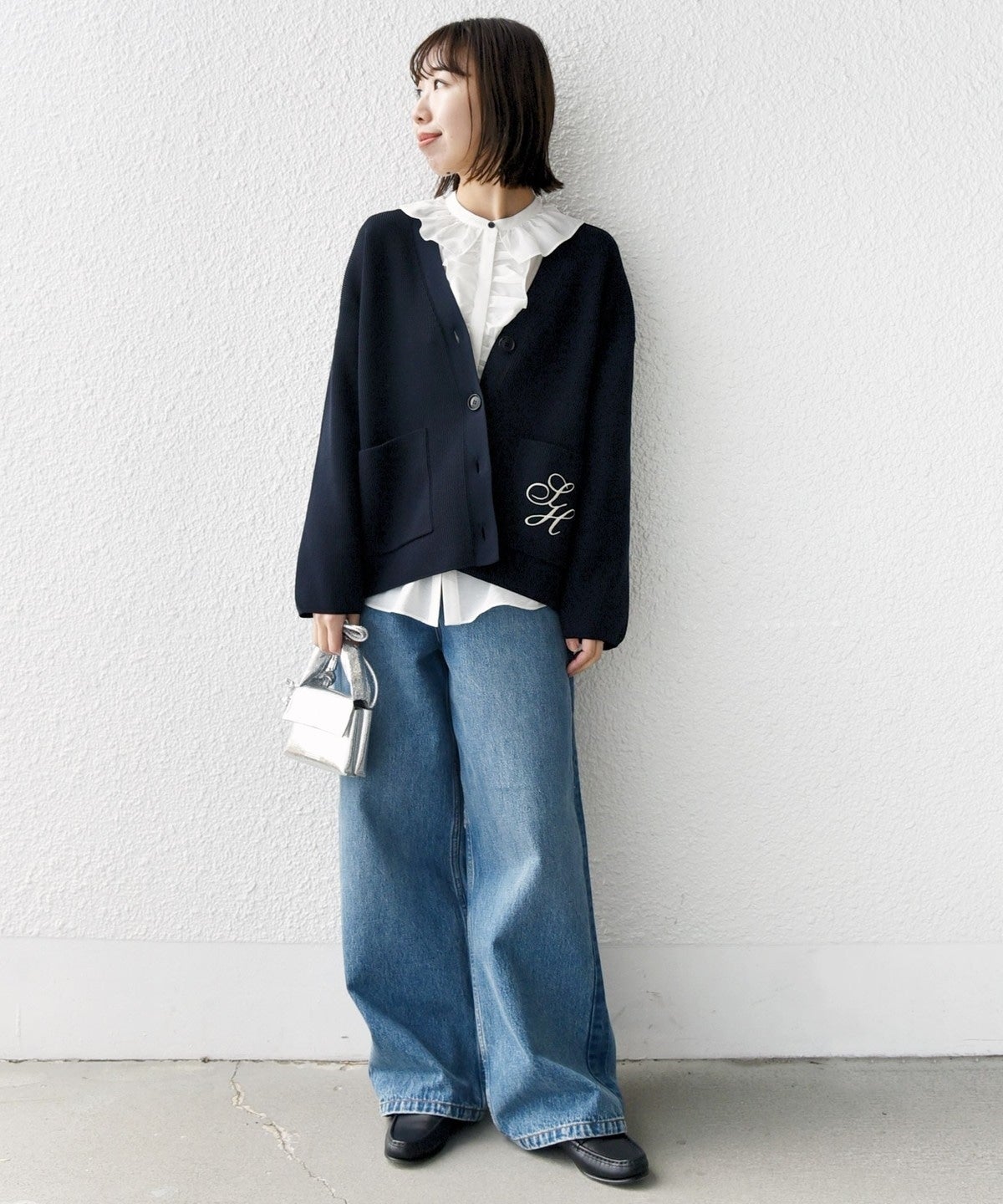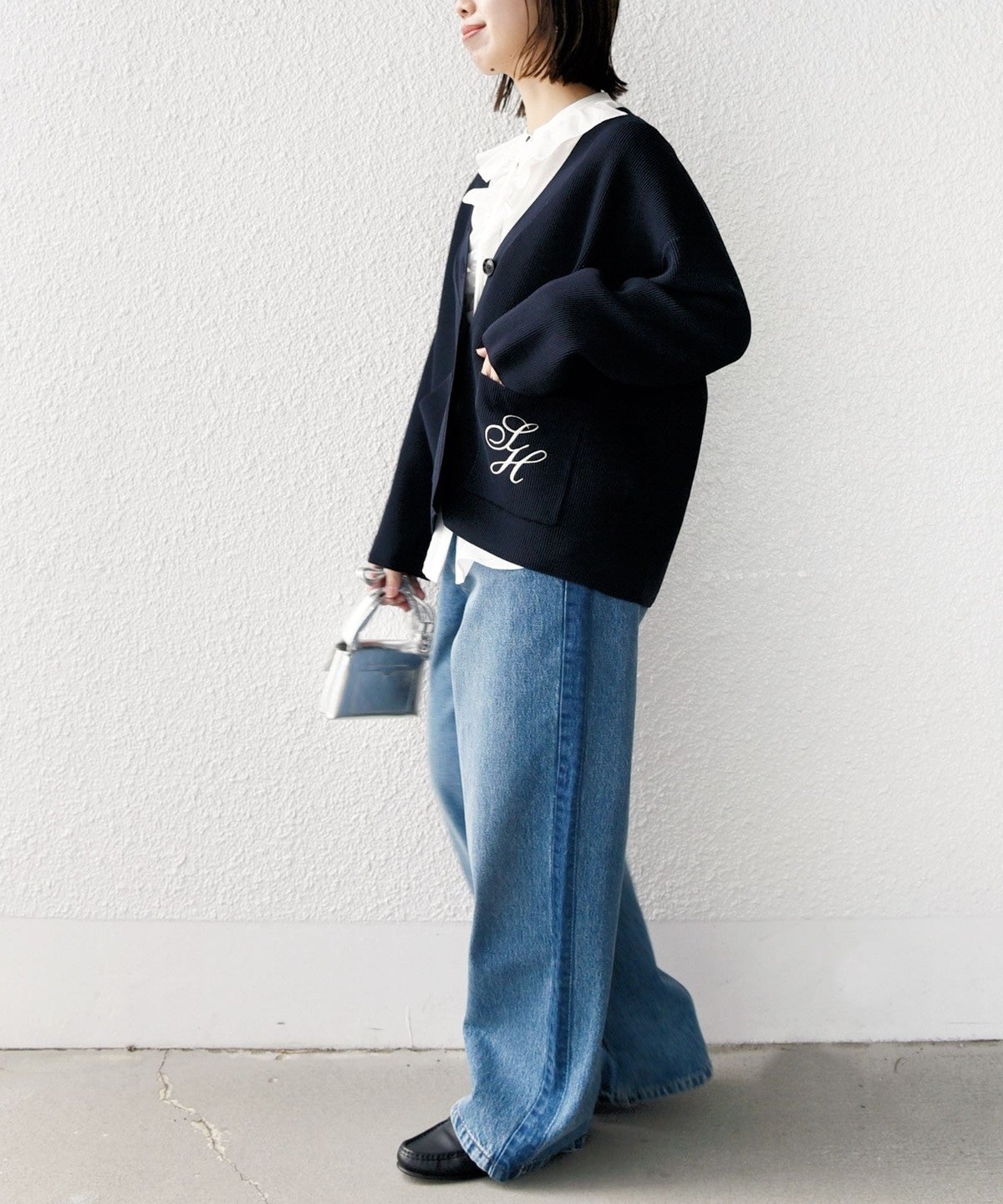 シャツやブラウス×ワイドシルエットのデニムなどと合わせて、トラッドなスタイルに仕上げるのも今っぽくて◎