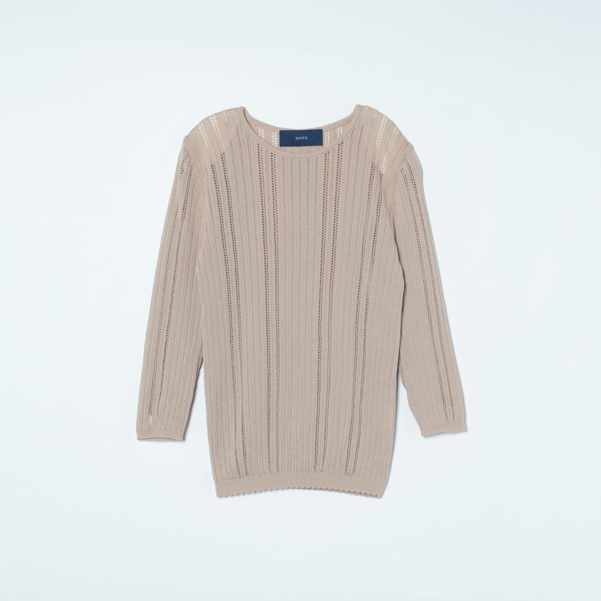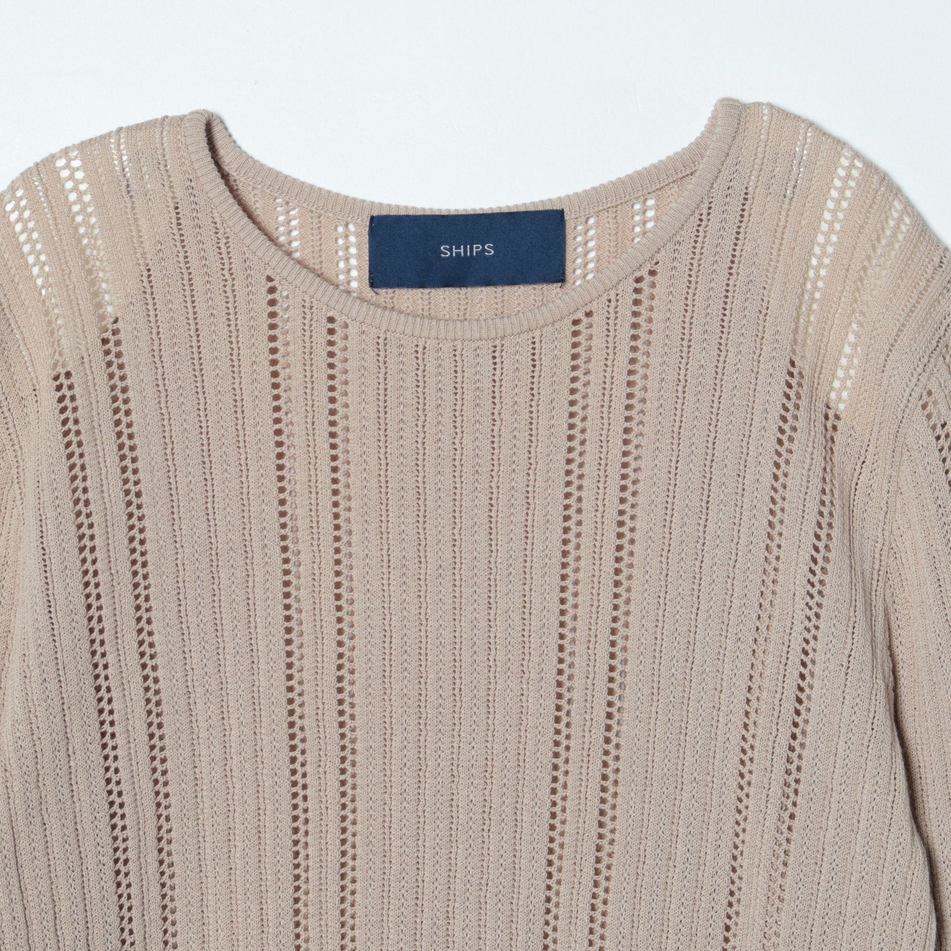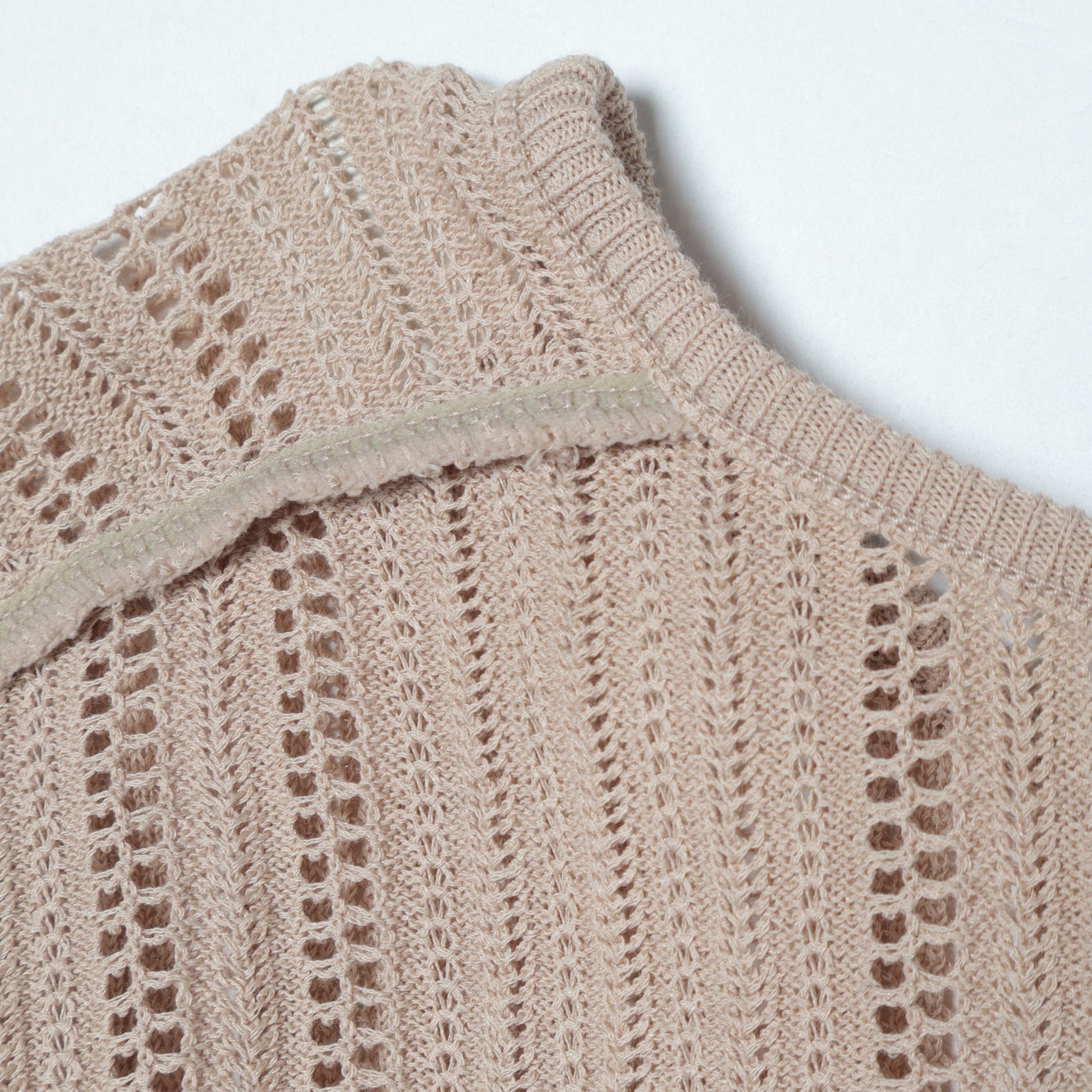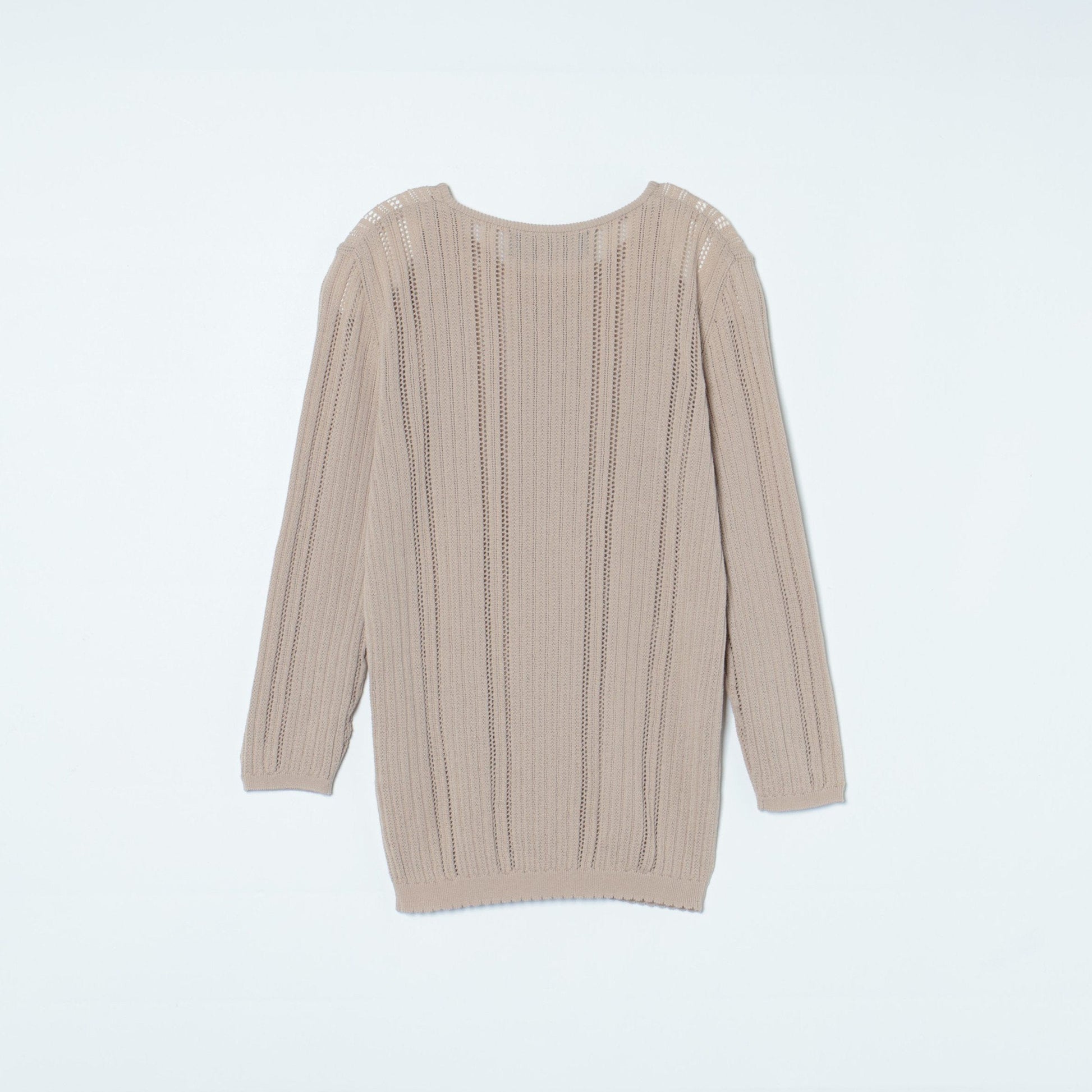 夏でも涼しく着ていただける透かし編みプルオーバーです。一枚はもちろん羽織り等のインナーにもおススメの一枚。
