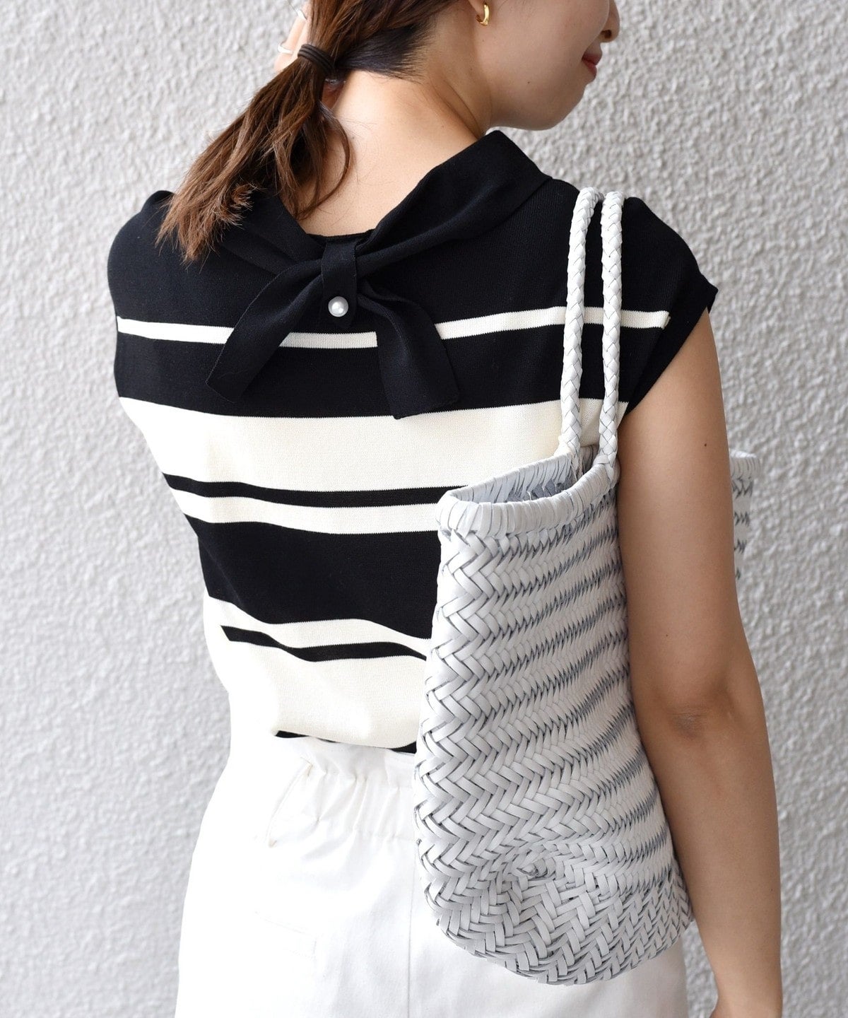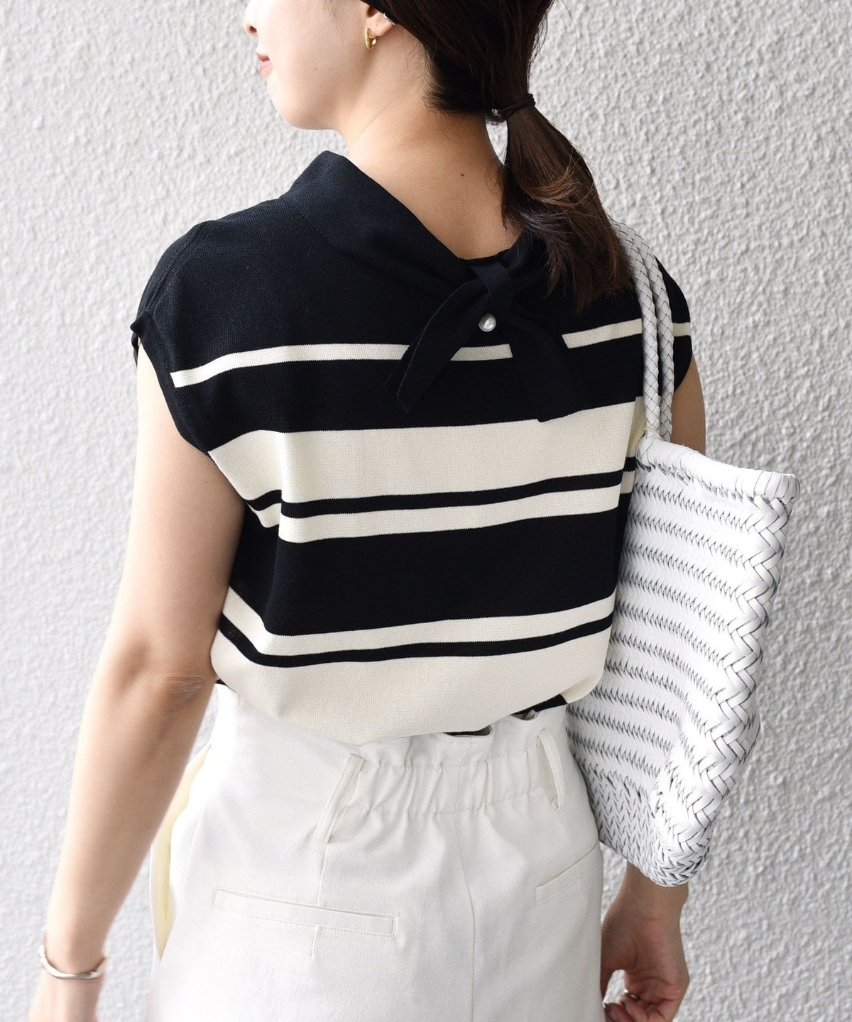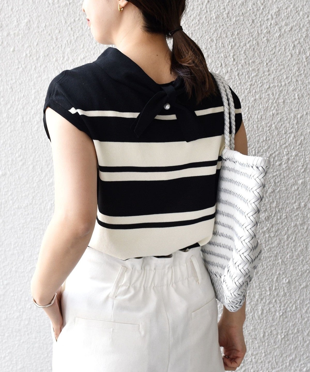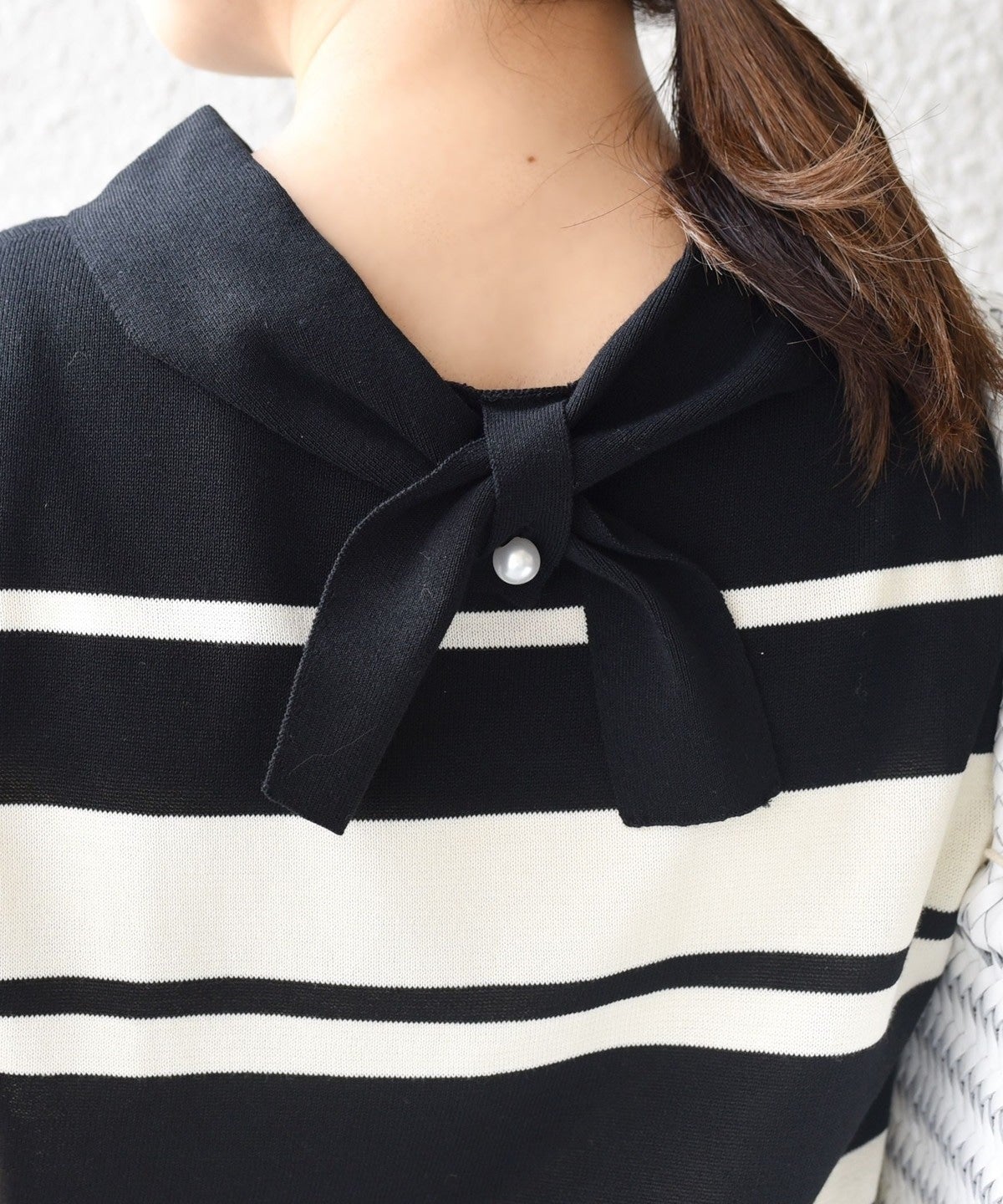 〈手洗い可能/UVカット/接触冷感〉パールモチーフボウタイニット ボーダー/ソリッド