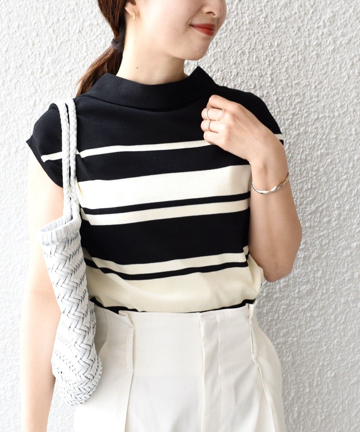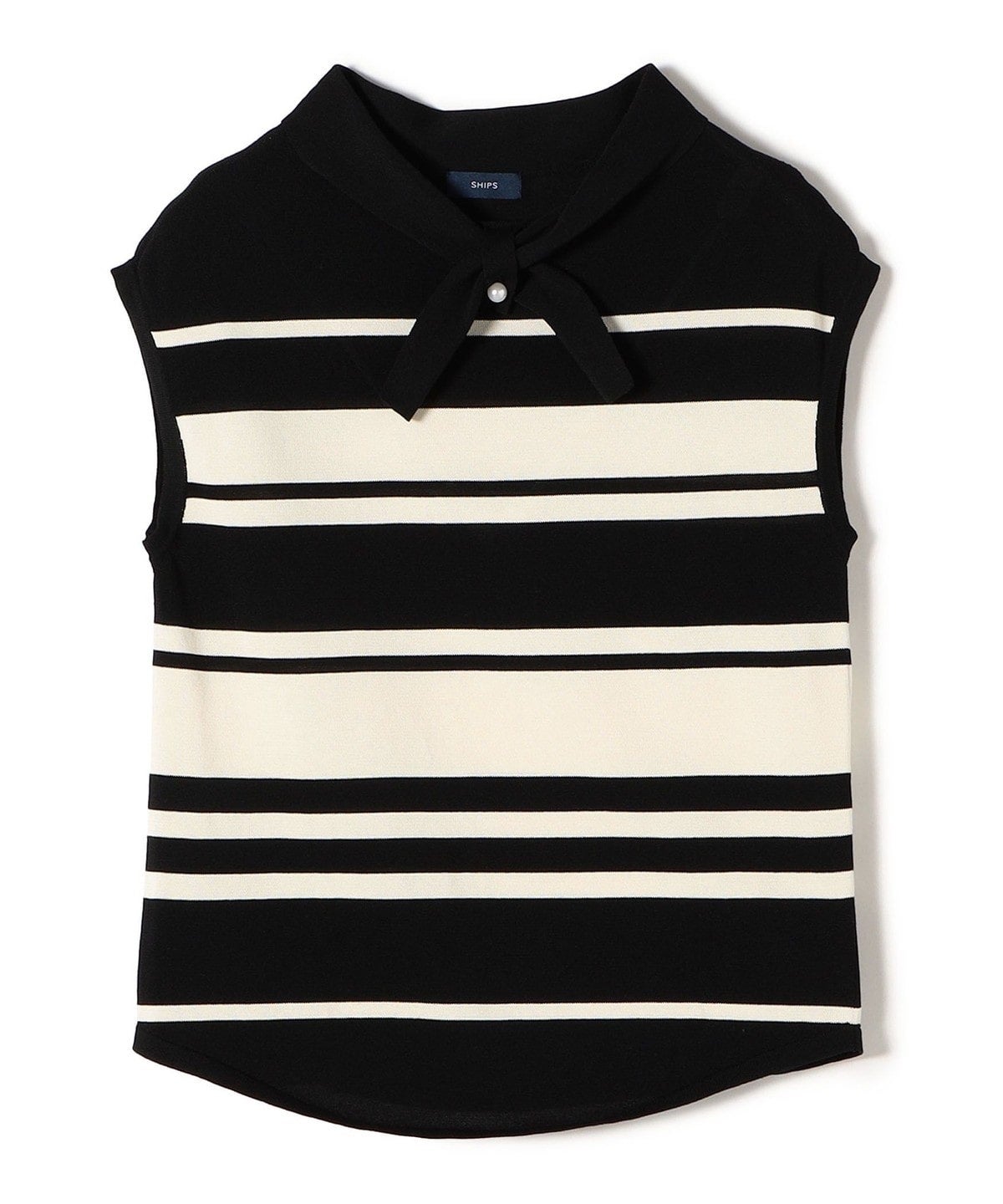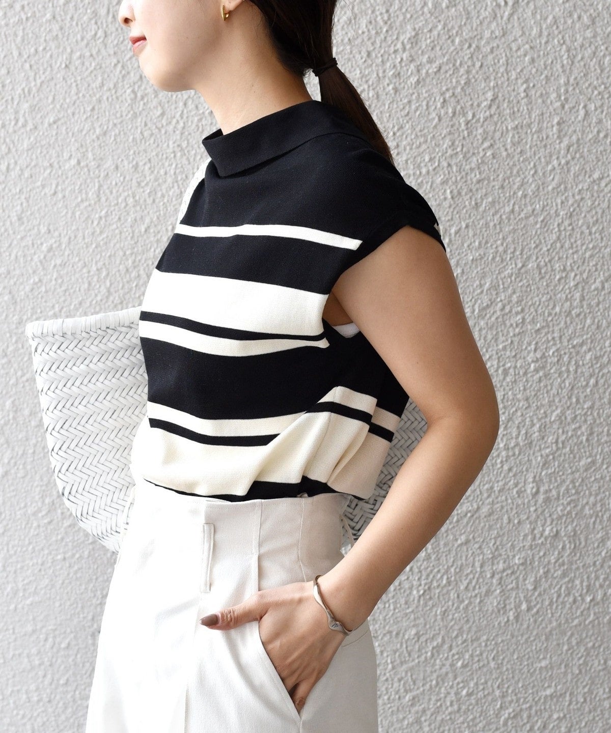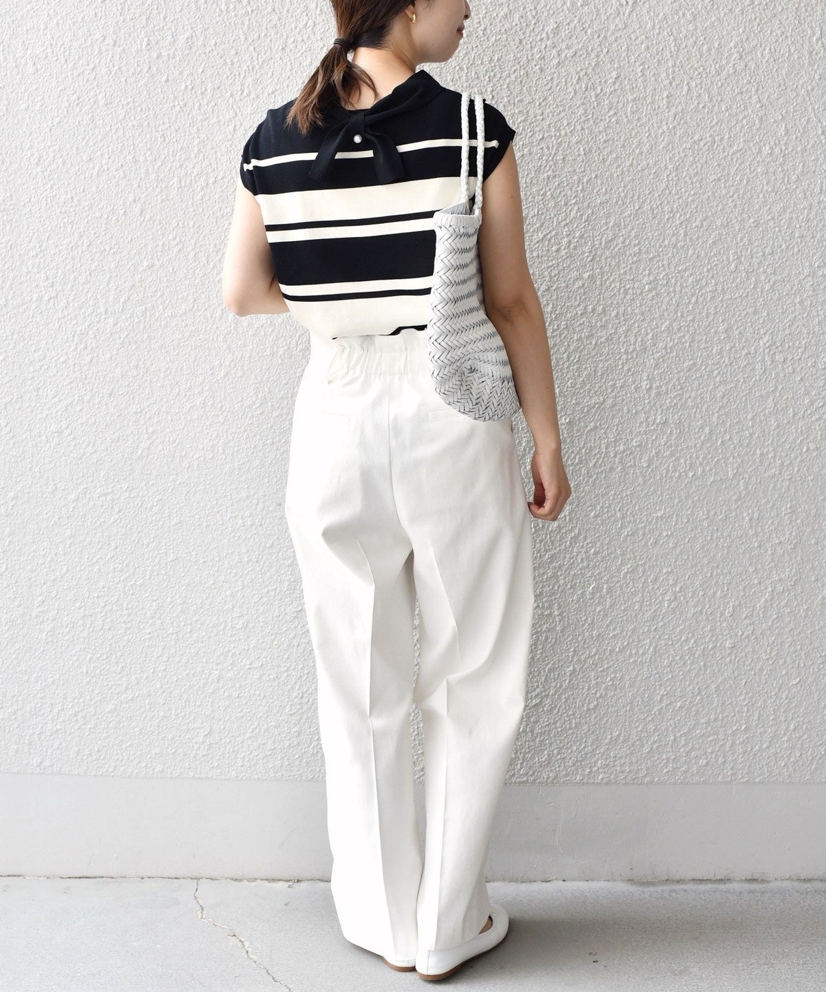 〈手洗い可能/UVカット/接触冷感〉パールモチーフボウタイニット ボーダー/ソリッド