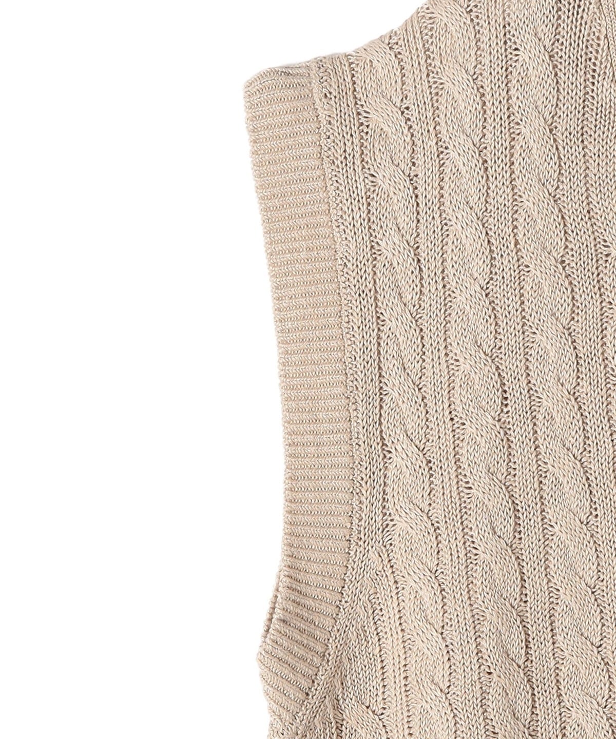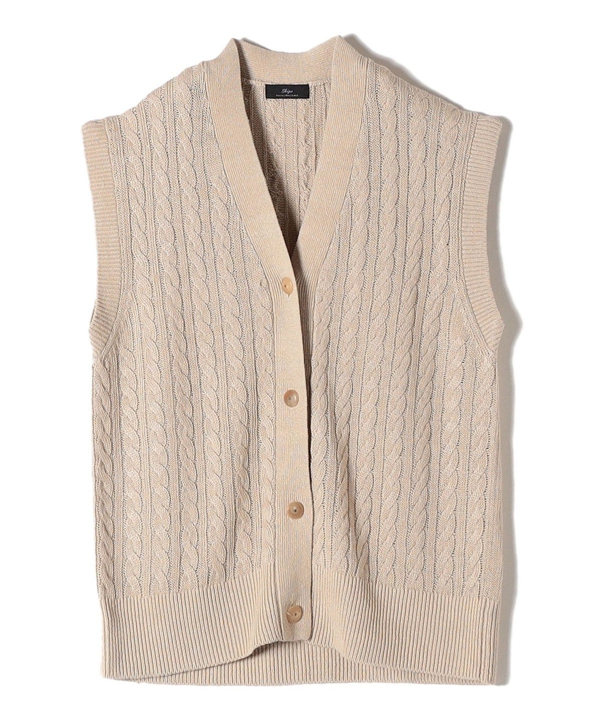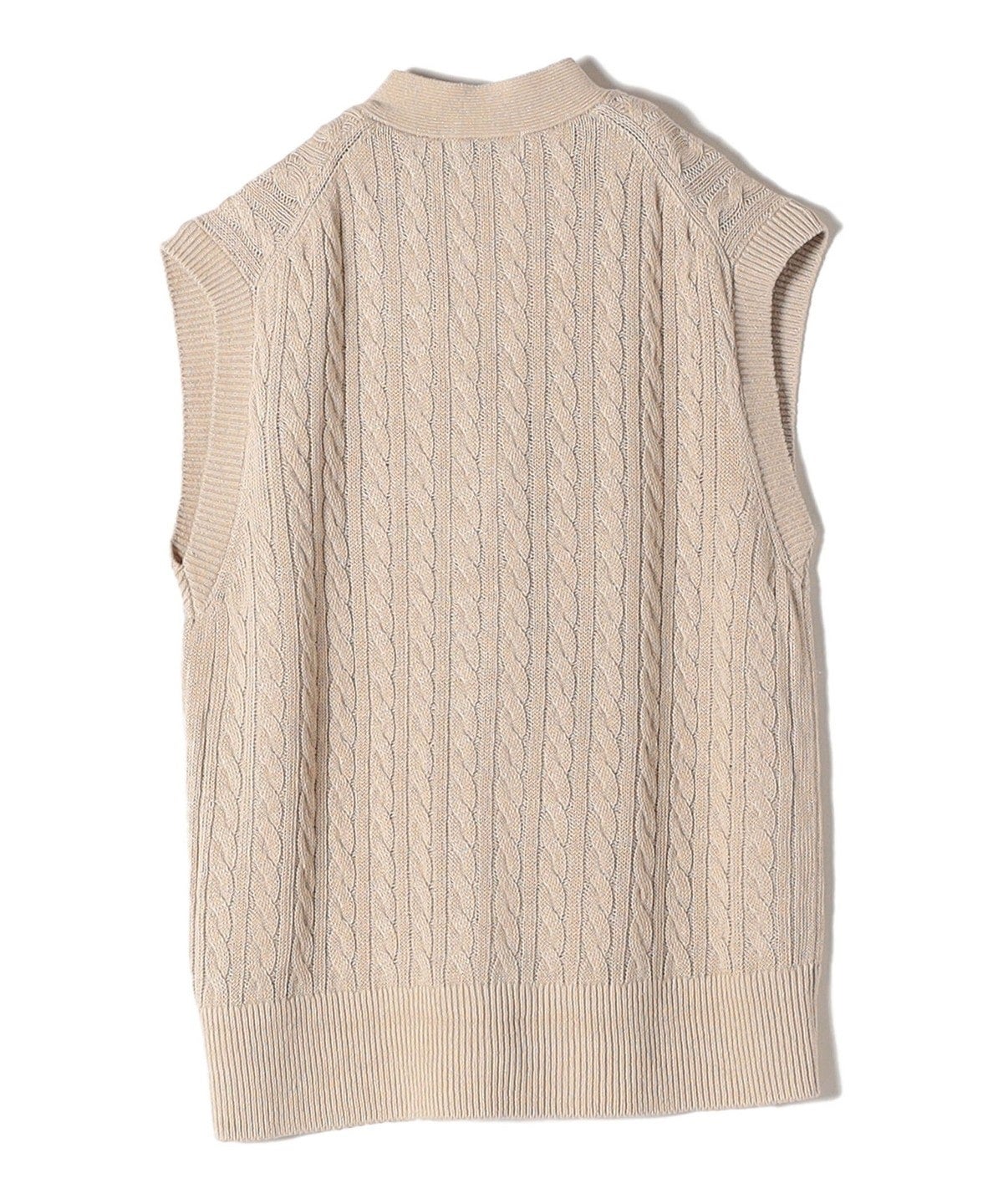 アイテム自体は素朴なケーブルベストですが、サイズ感を大き目にして着用すると肩がかぶるくらいのサイズ感になるように作っています。