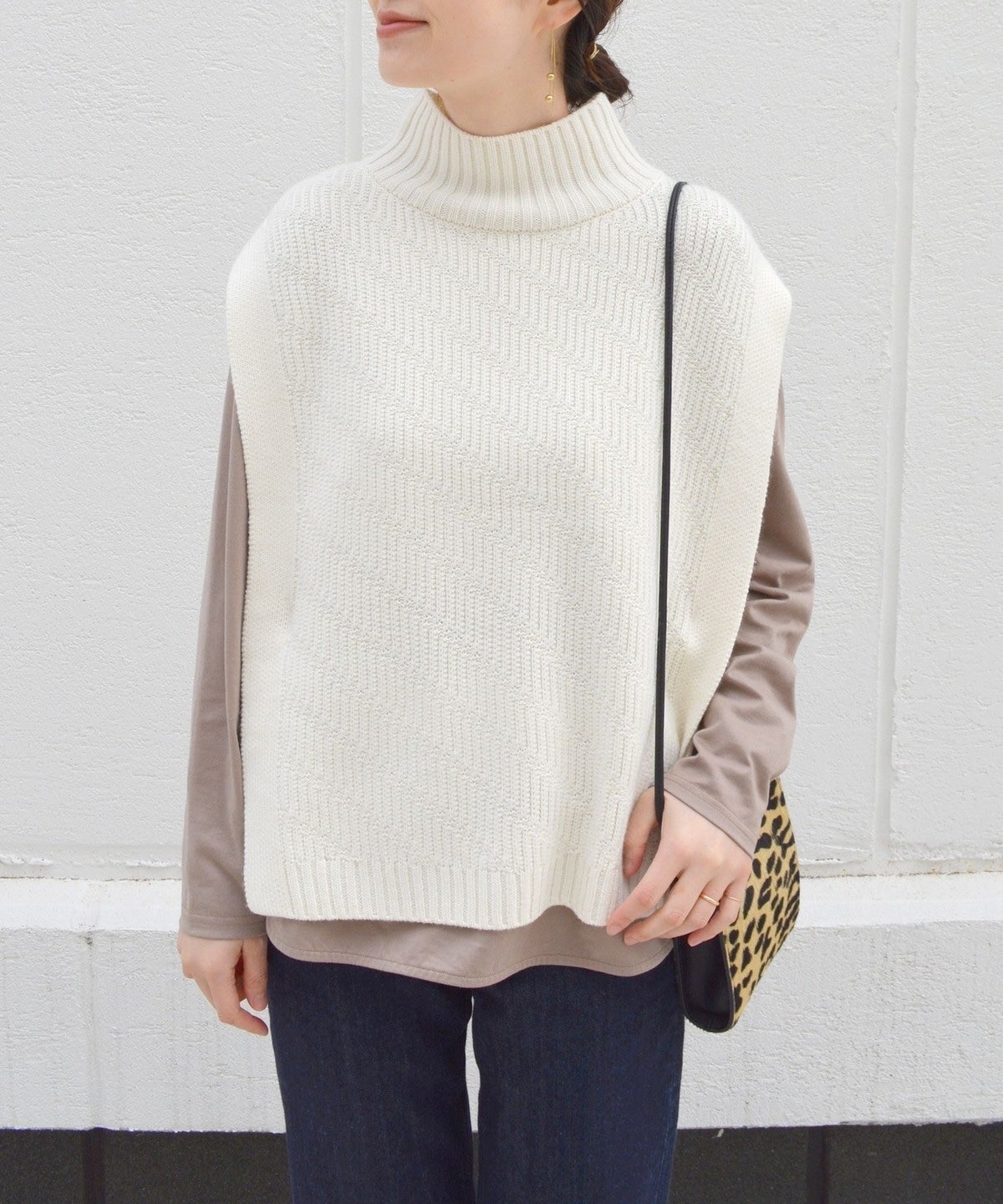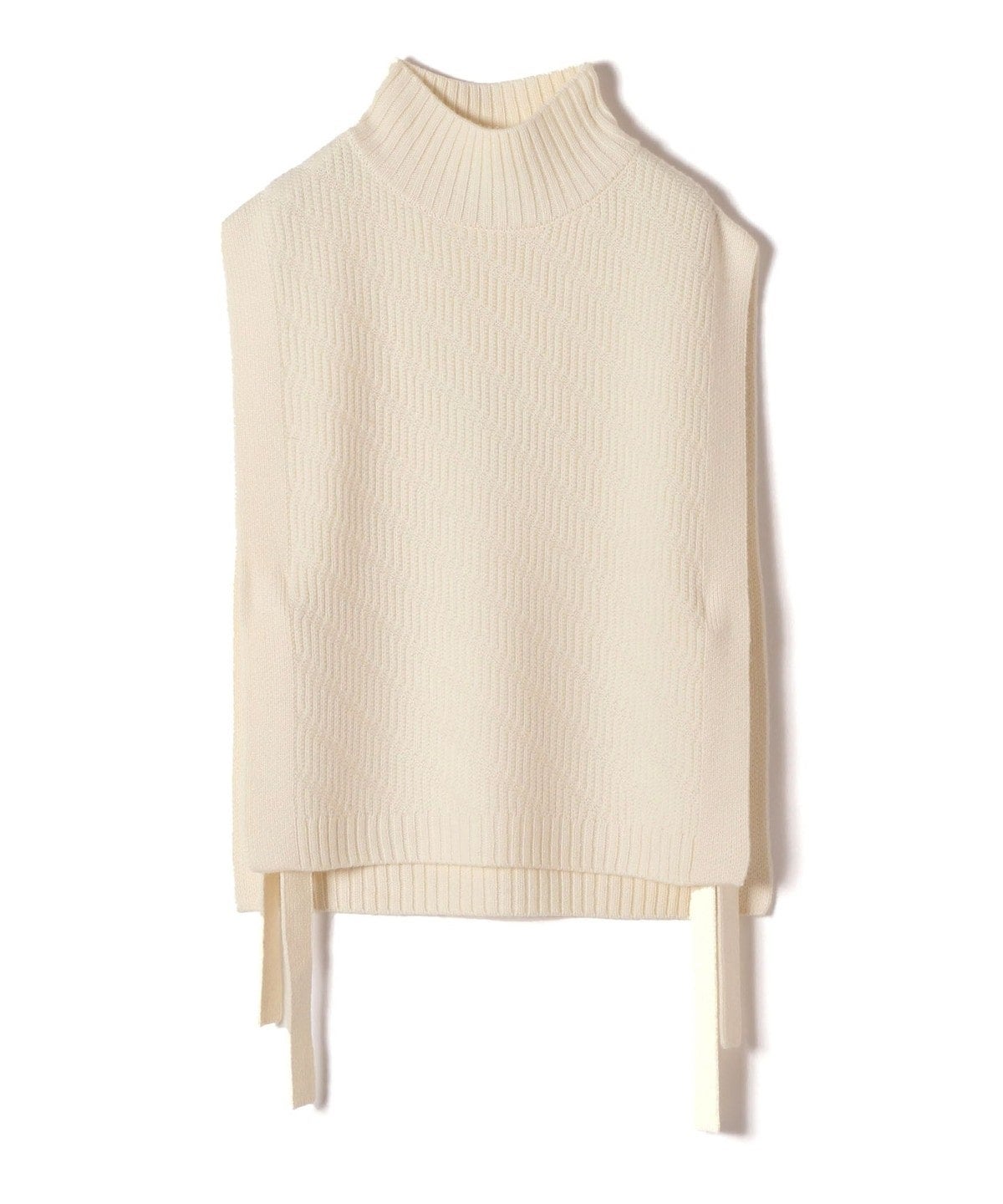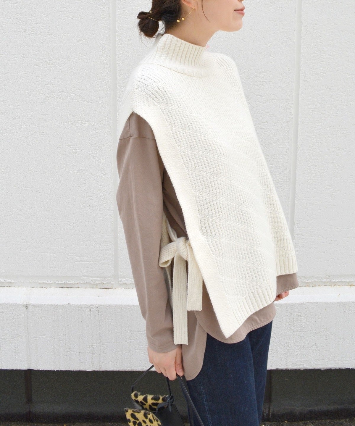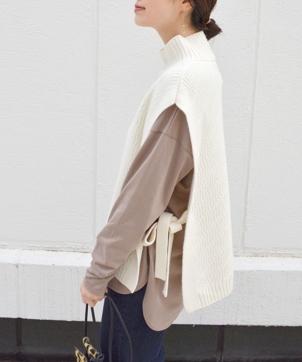 程よい落ち感と厚さでコートインしても着用できるサイドリボンの柄編みベストです。