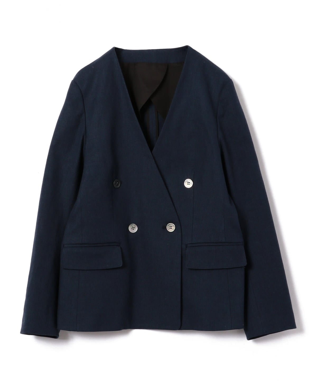 シンプルなデザインのダブルジャケットはノーカラーにする事でさり気ないトレンド感をプラス。