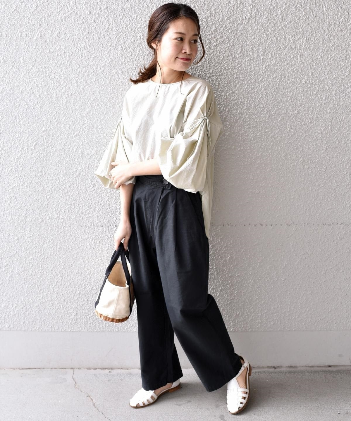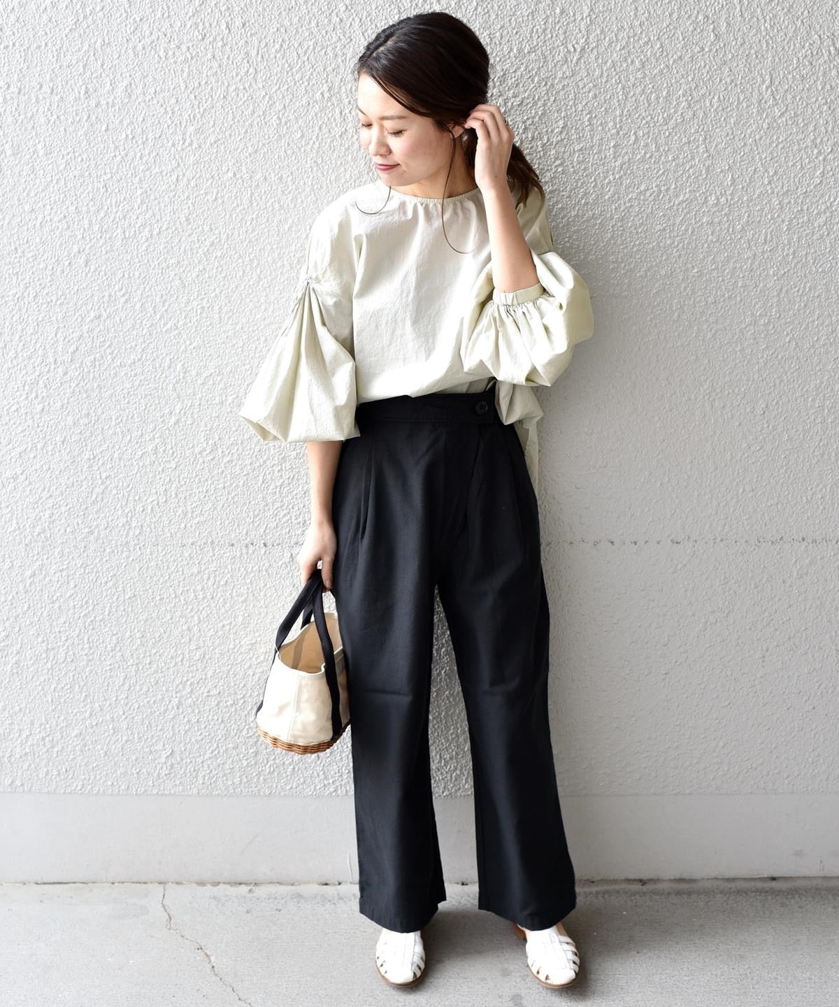 シンプルで着回し力抜群のバックサテンパンツ。後ろウエストはゴム仕様で、ストレスフリーな穿き心地が魅力的◎普段使いはもちろん、オフィスシーンにも活躍する一着です。