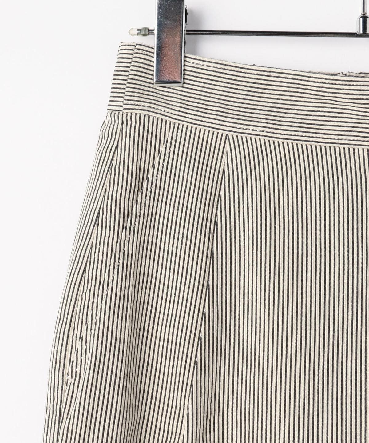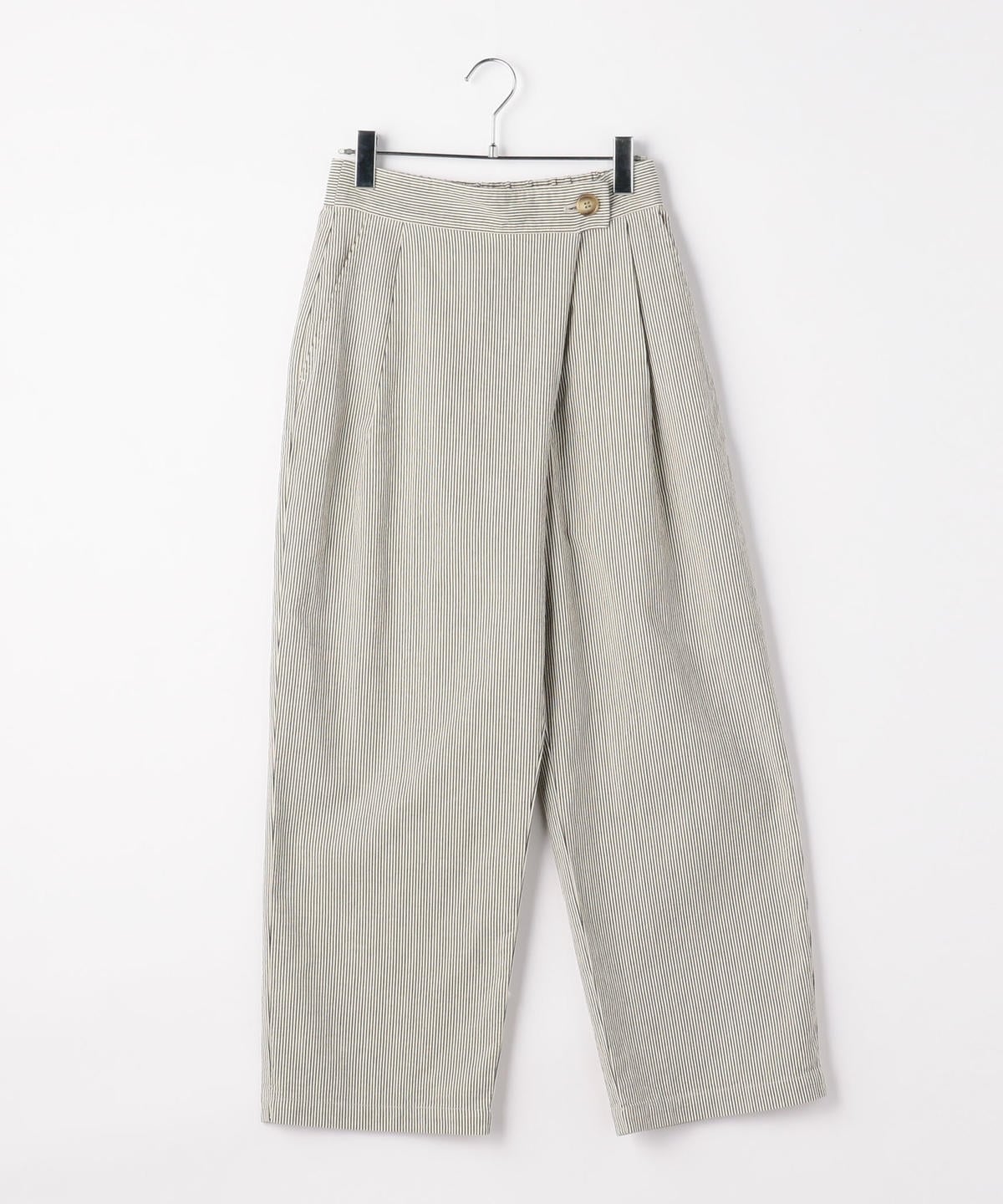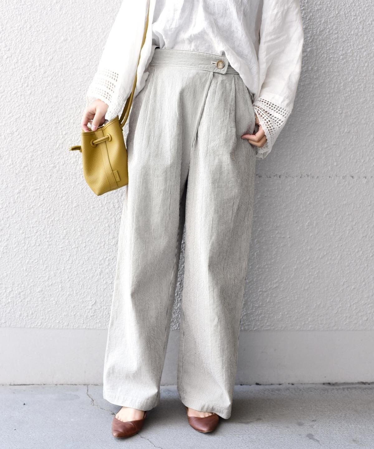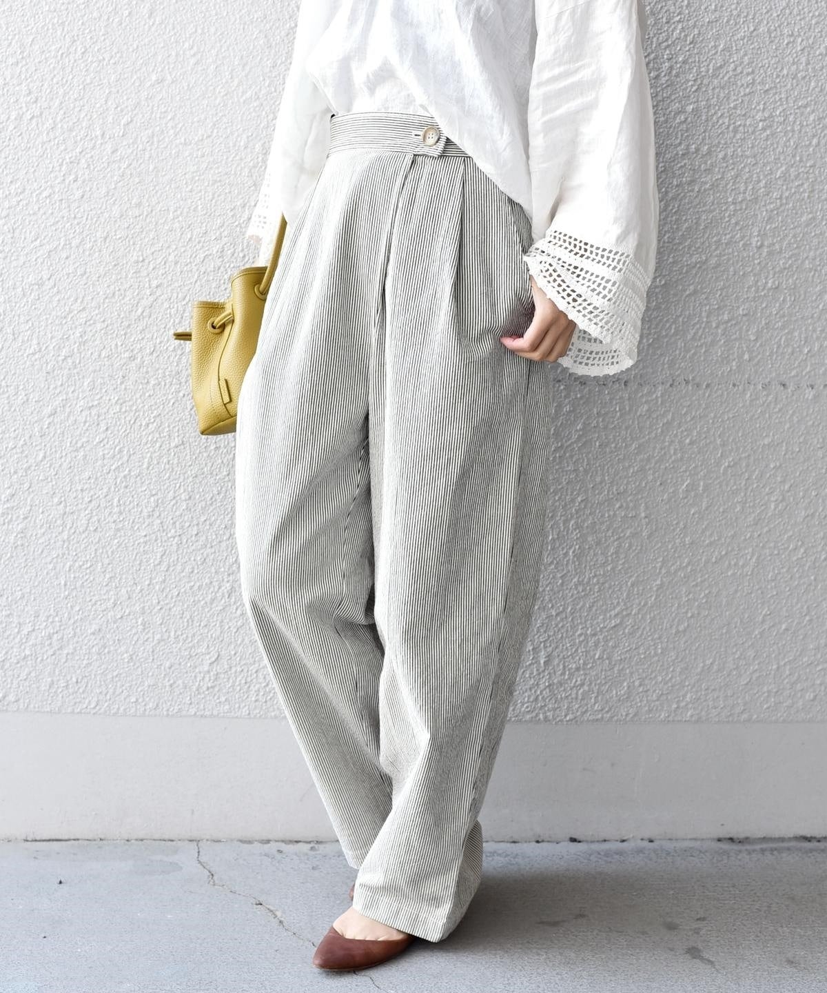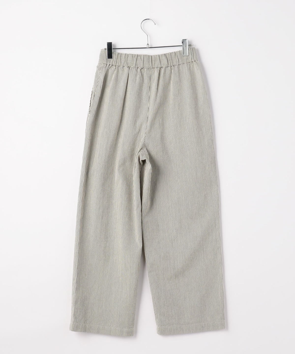 春夏にぴったりのストライプ柄が爽やかなスラントパンツ。ストレートシルエットでトップスを選ばず、幅広く着まわしの効く一着です。後ろウエストがゴム仕様なので着心地も抜群◎