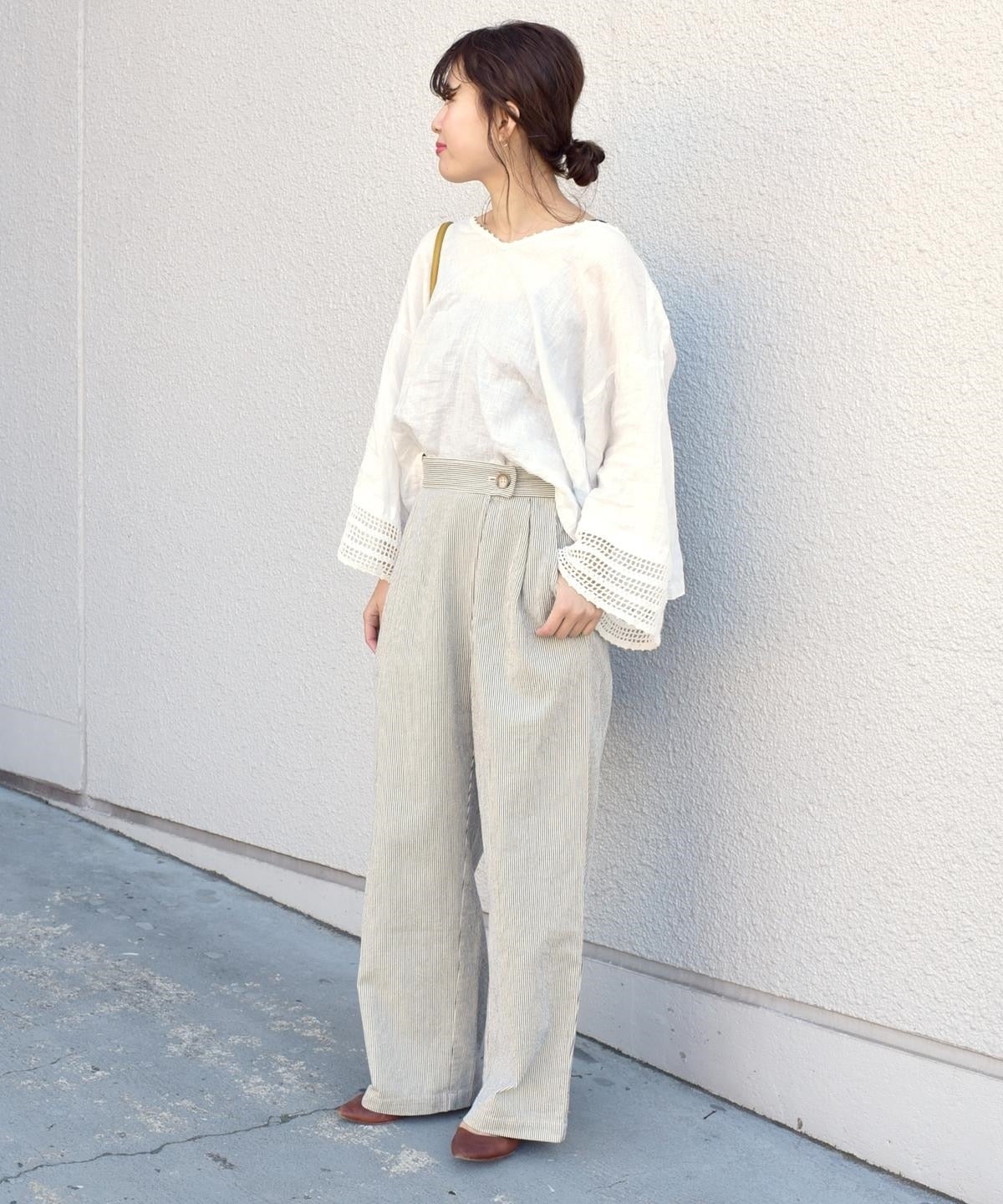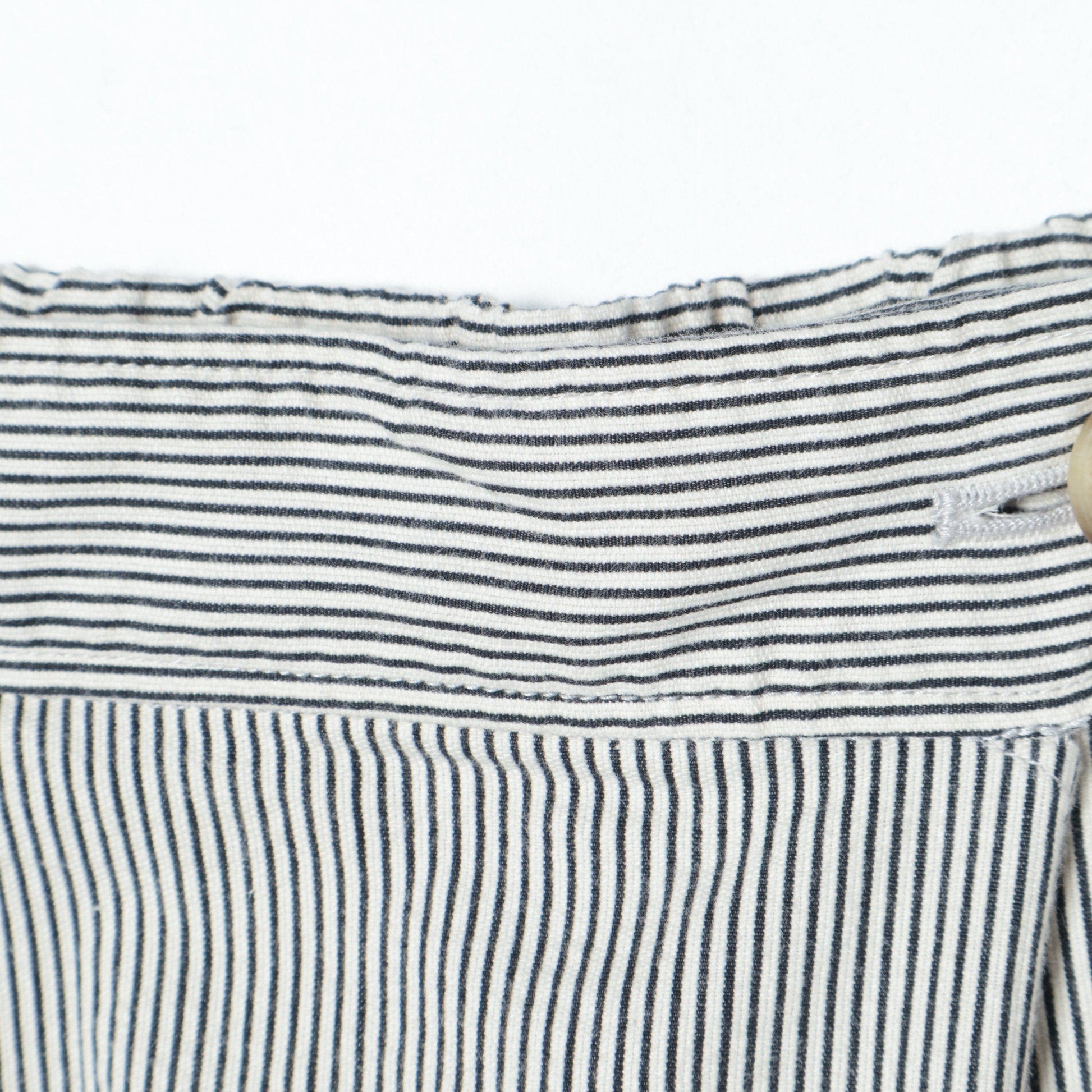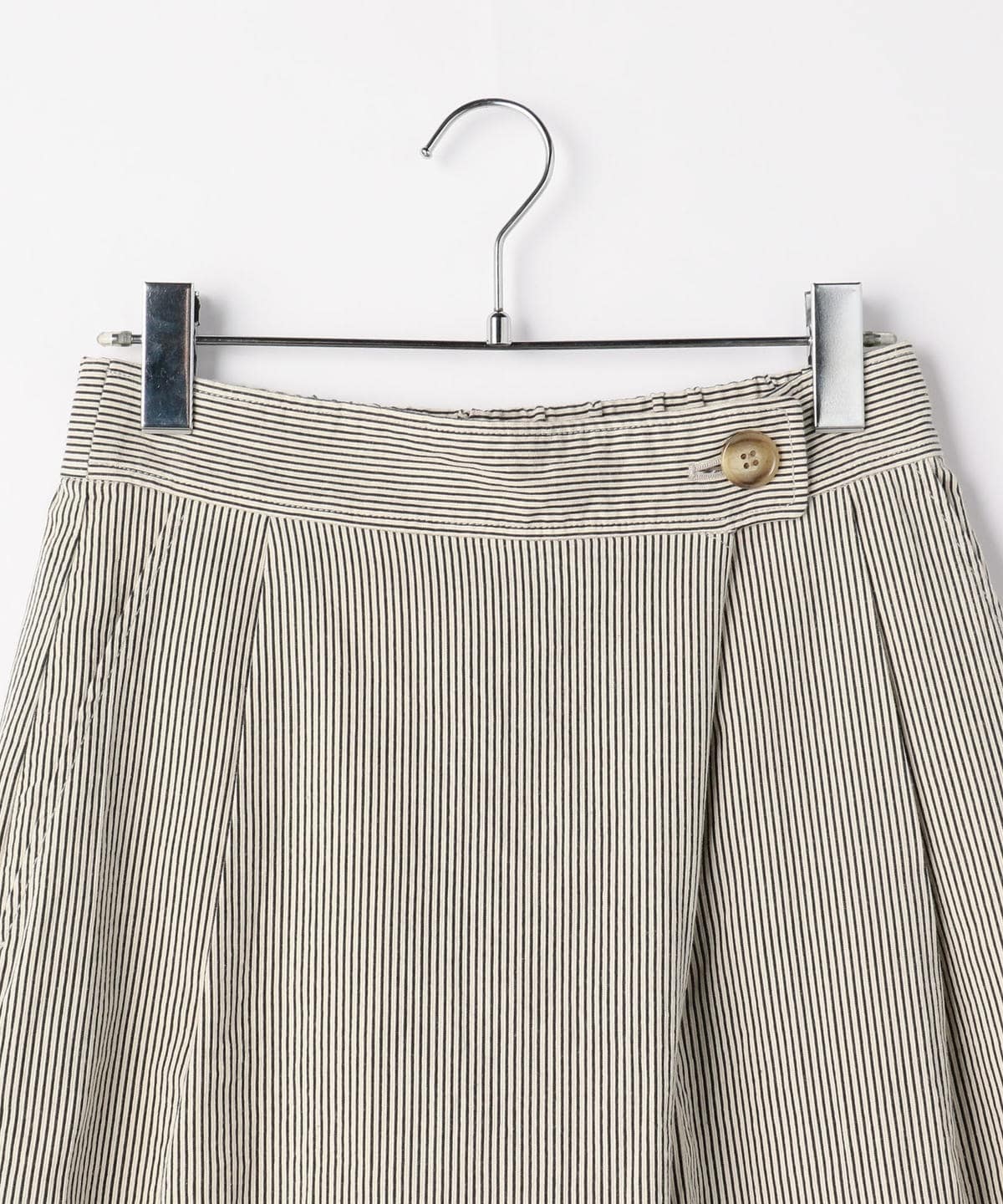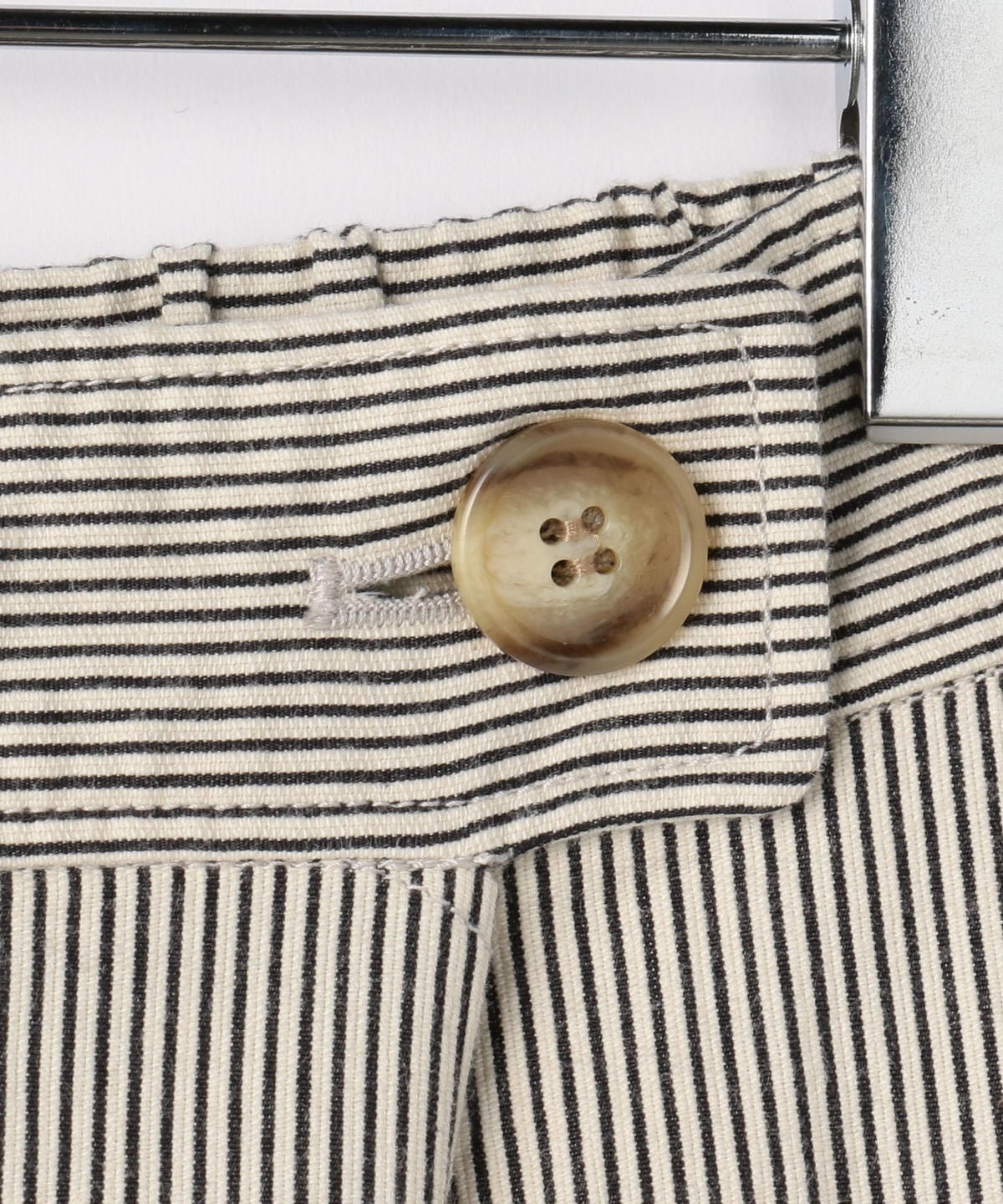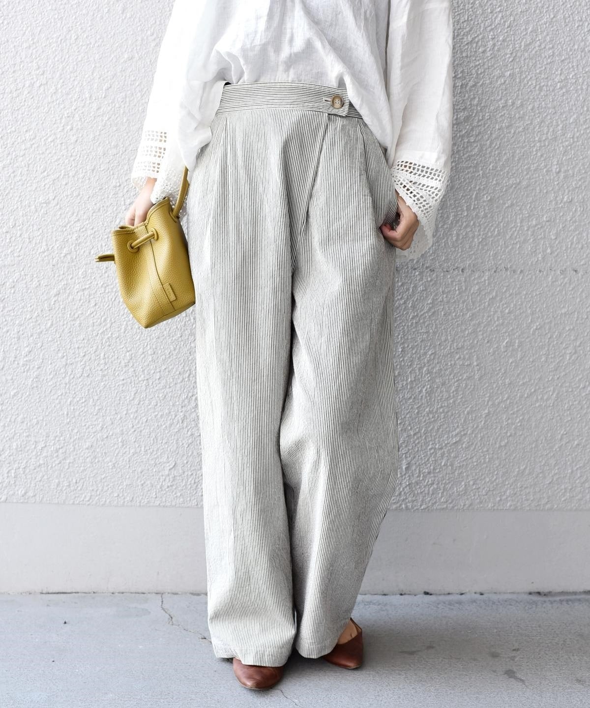 春夏にぴったりのストライプ柄が爽やかなスラントパンツ。ストレートシルエットでトップスを選ばず、幅広く着まわしの効く一着です。後ろウエストがゴム仕様なので着心地も抜群◎