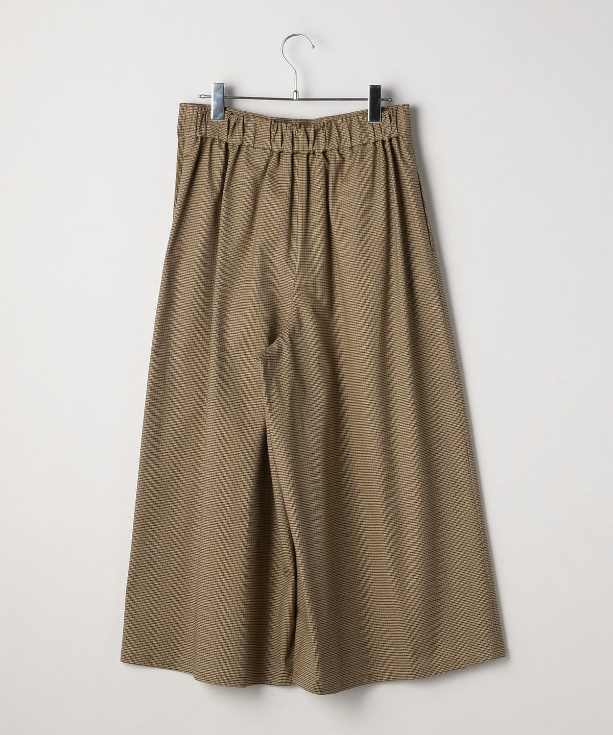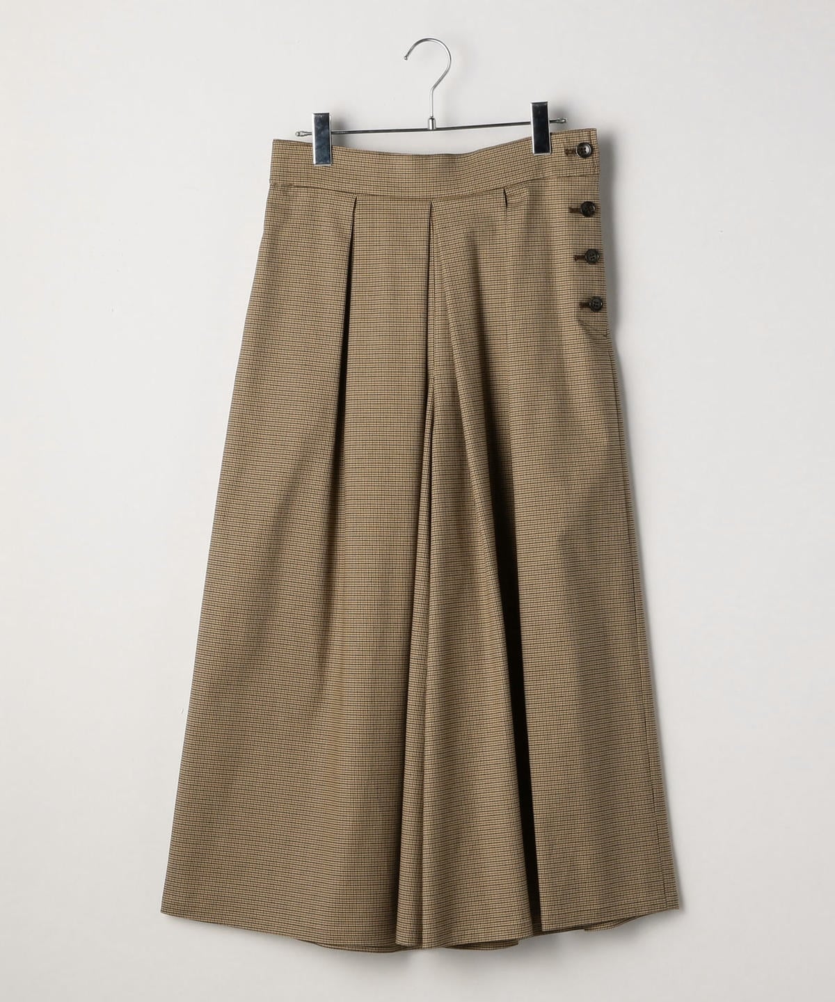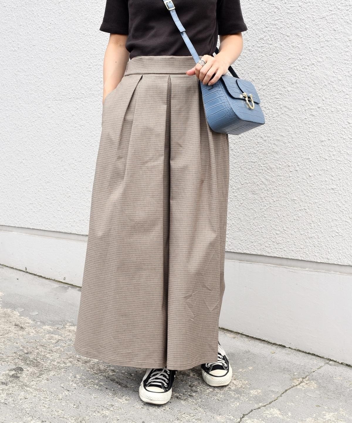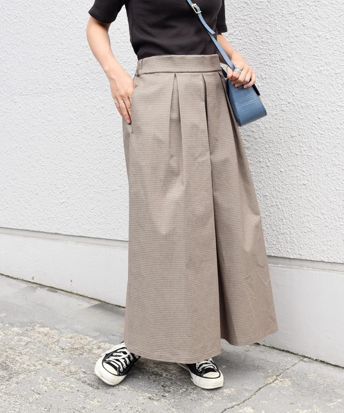 ハリのある素材を使用したロング丈キュロット。ボリューム感のあるワイドなシルエットながらも、ウエストのタックが腰周りをすっきりと見せてくれます。トップスを選ばず着回し力抜群の優秀アイテム。カジュアルになりすぎないグレンチェック柄のキュロットは、秋冬のシーズンムードを高めてくれます。オンオフ兼用として大活躍間違いなしの一品。