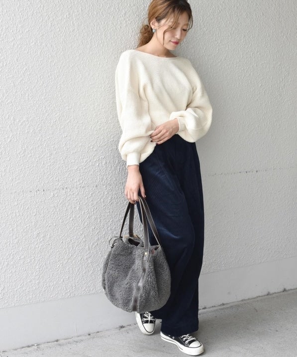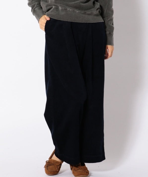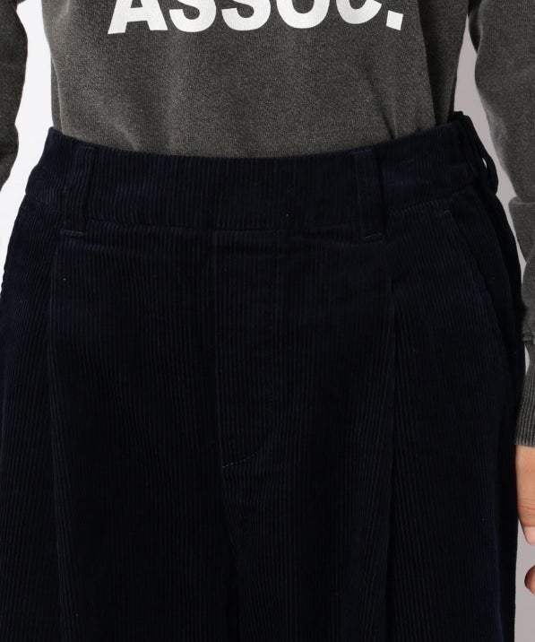 ゆったりとしたシルエットで、デイリー使いにピッタリのコーデュロイパンツ。後ろウエストはゴム仕様で履き心地抜群、前にはタックが入っていて腰周りもスッキリ!ウエストは紐で調整出来ます。秋冬の必須アイテム。