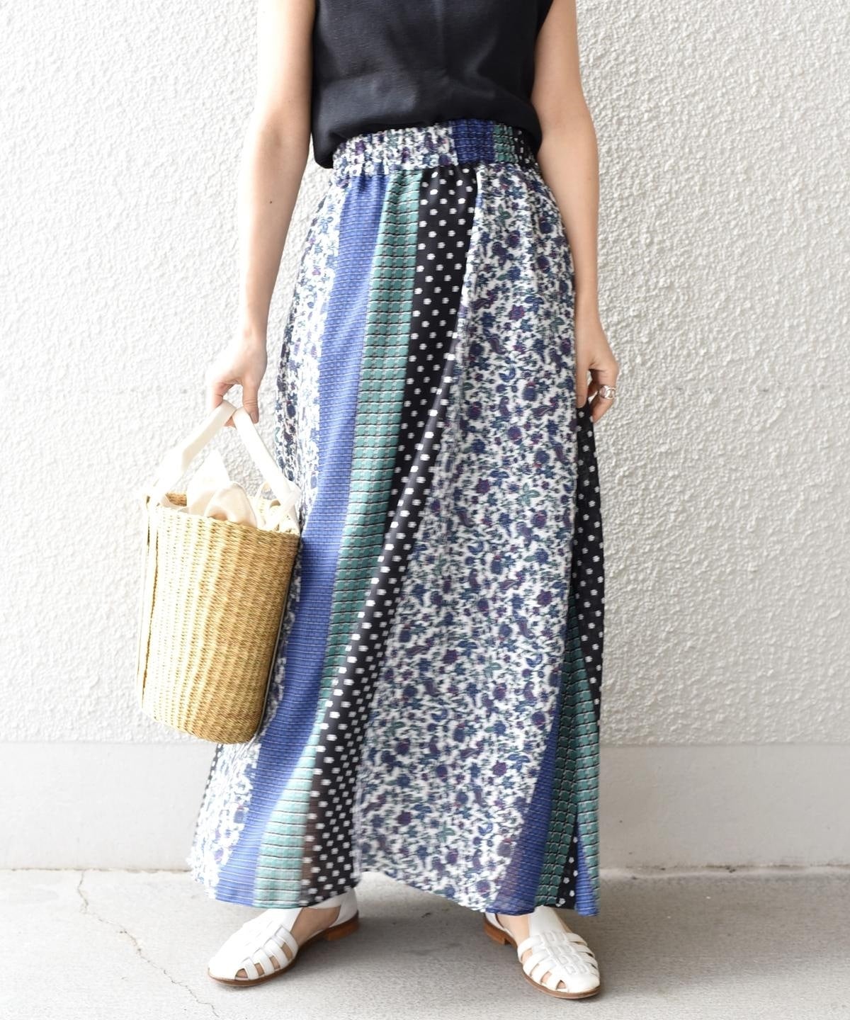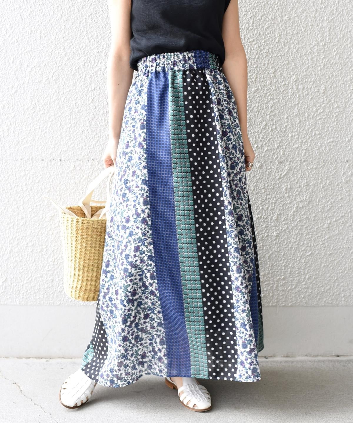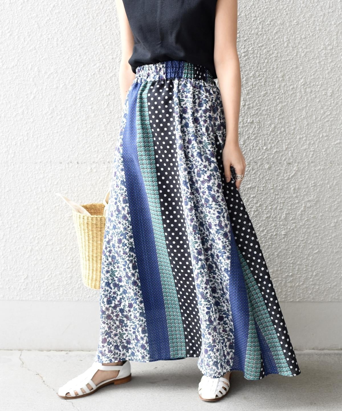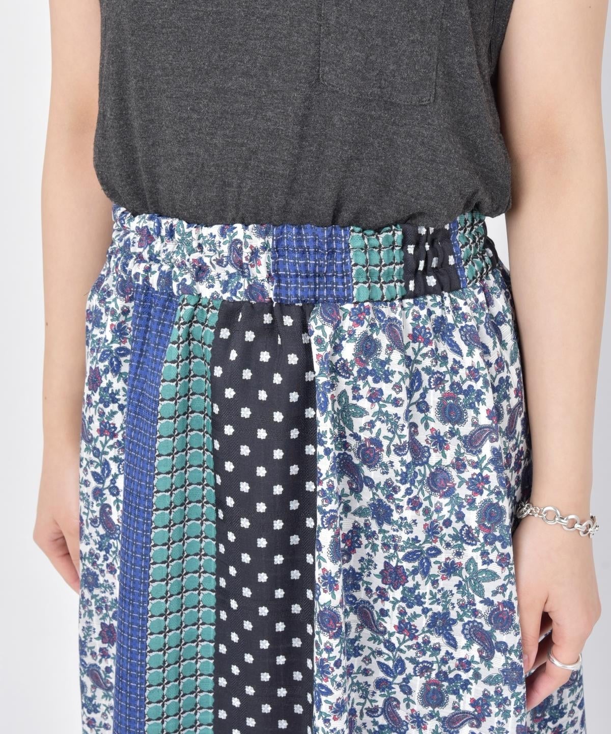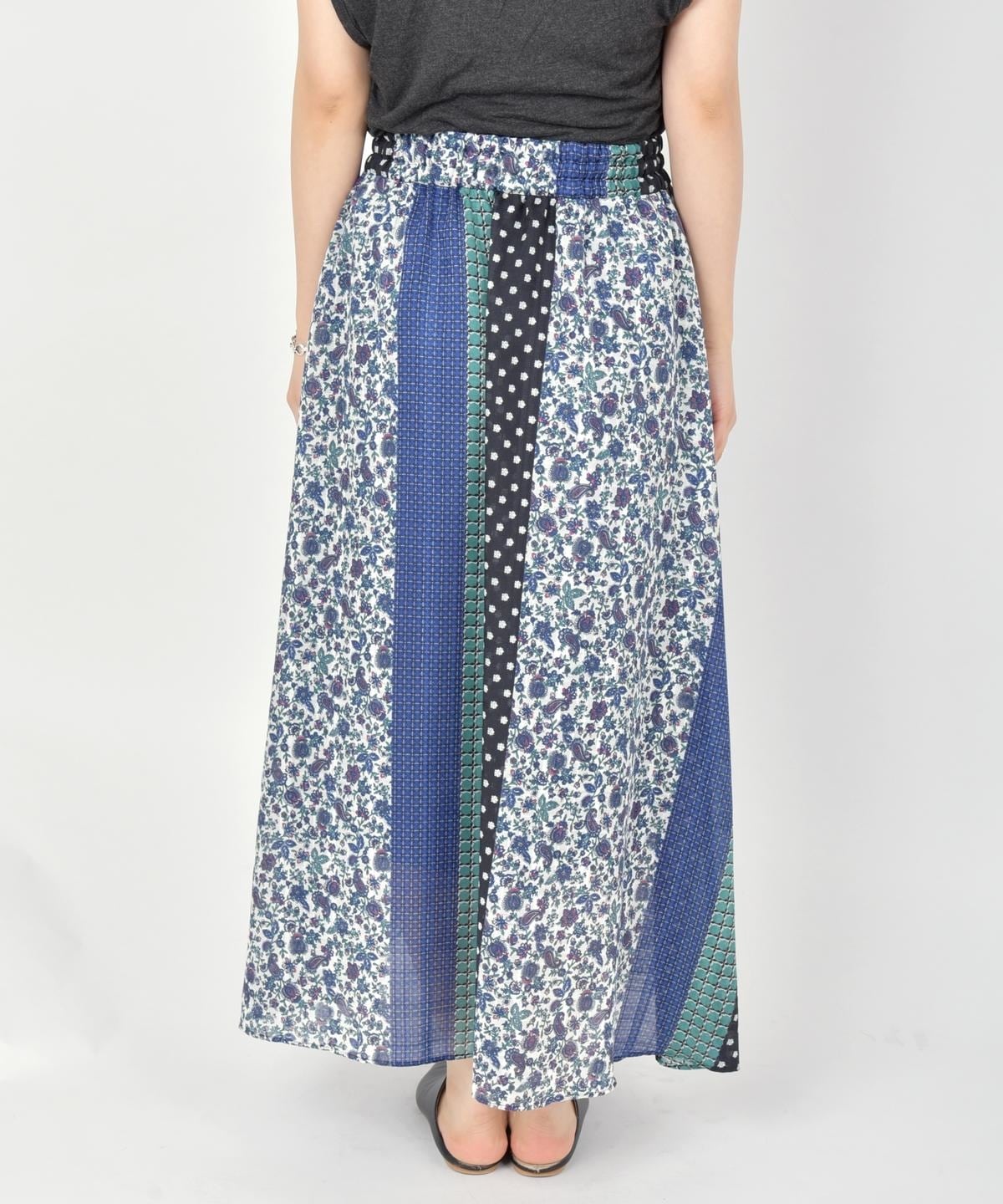 柄の組み合わせがお洒落なパッチワークデザインのスカート。存在感のある配色と柄が今の気分にぴったりな一着。春らしい華やかさが魅力です♪ウエストは総ゴム仕様で履き心地も抜群◎ペチコート付きなので透け感も気にせず、さらっとご着用いただけます。シンプルなトップスに合わせるだけでコーディネートが完成する主役アイテムです。