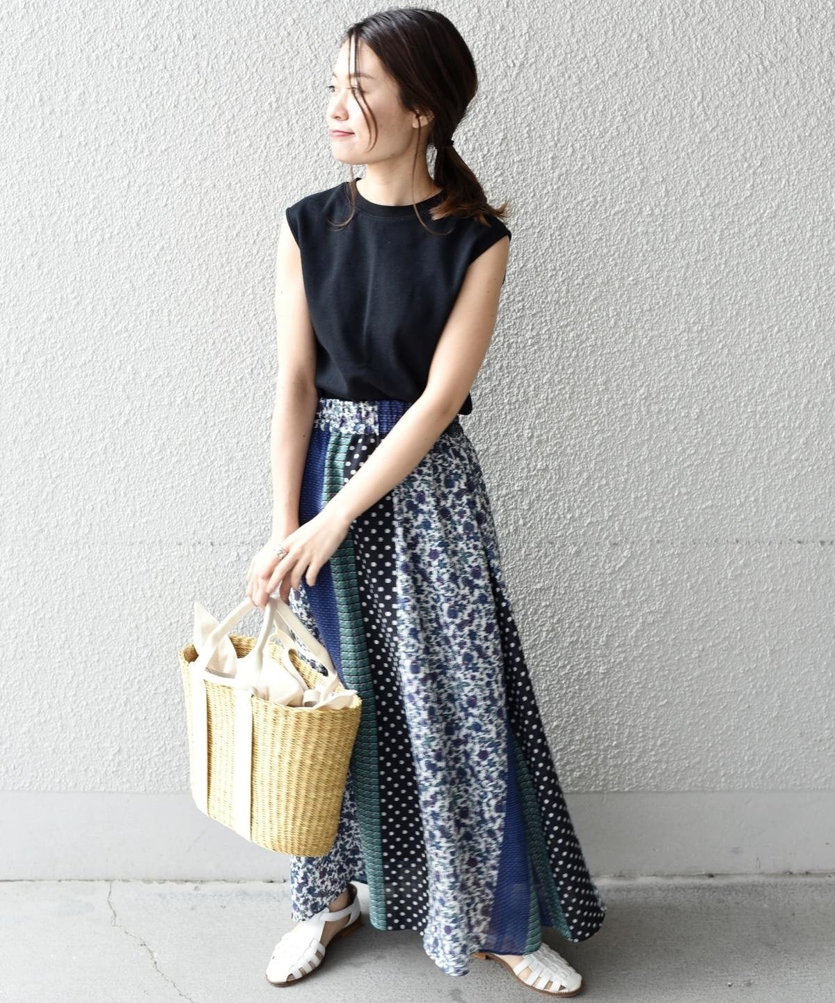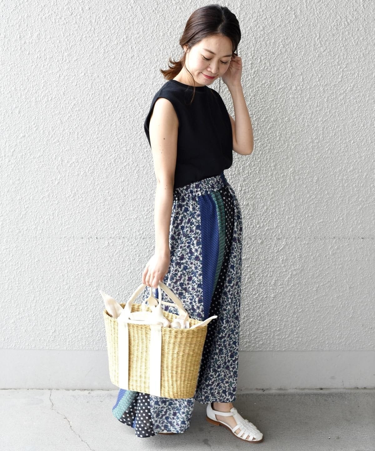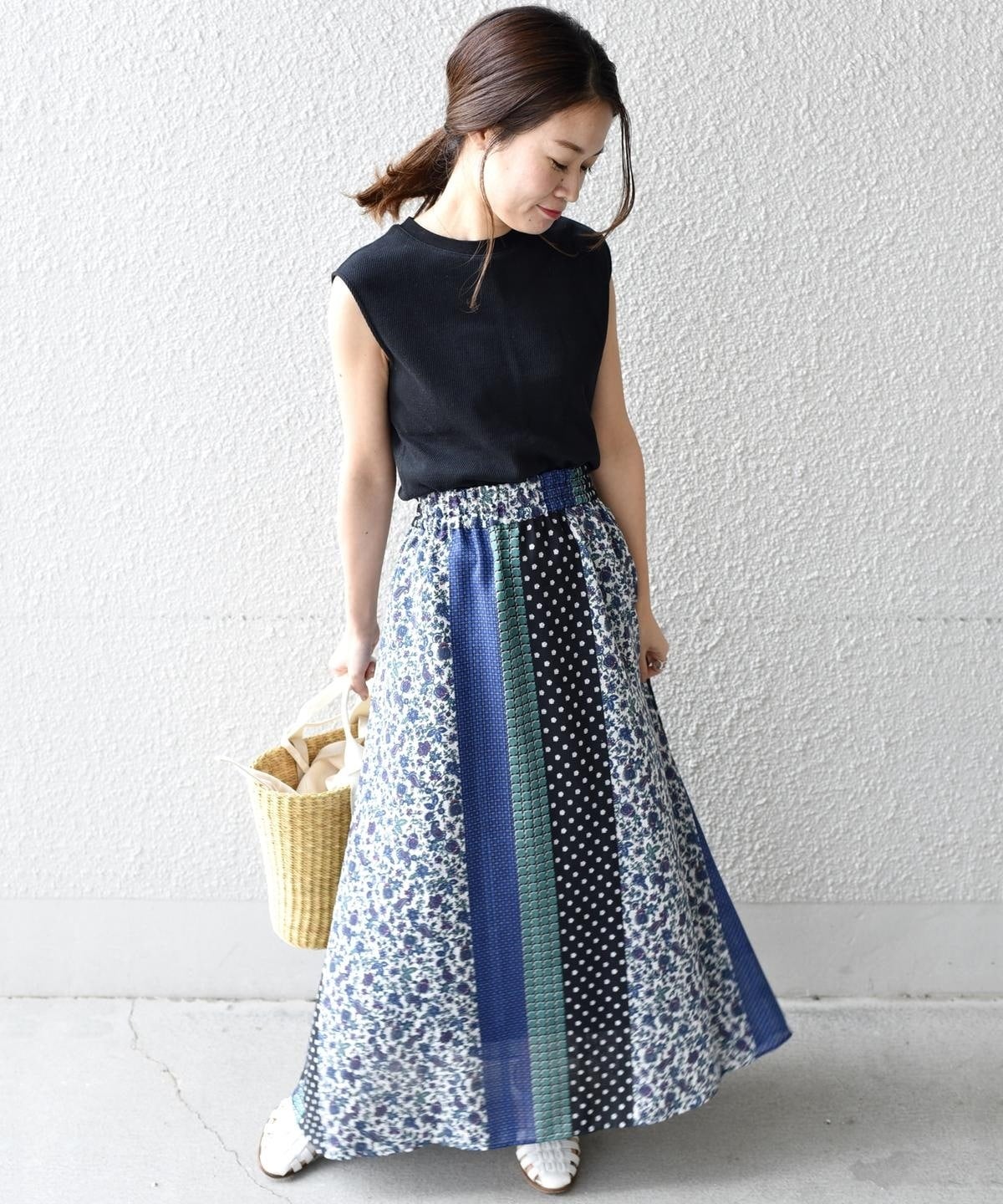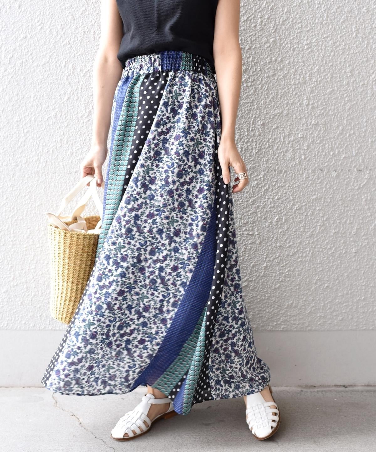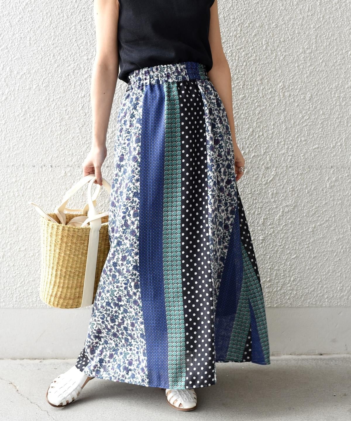 柄の組み合わせがお洒落なパッチワークデザインのスカート。存在感のある配色と柄が今の気分にぴったりな一着。春らしい華やかさが魅力です♪ウエストは総ゴム仕様で履き心地も抜群◎ペチコート付きなので透け感も気にせず、さらっとご着用いただけます。シンプルなトップスに合わせるだけでコーディネートが完成する主役アイテムです。