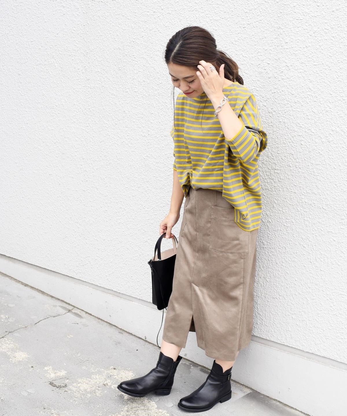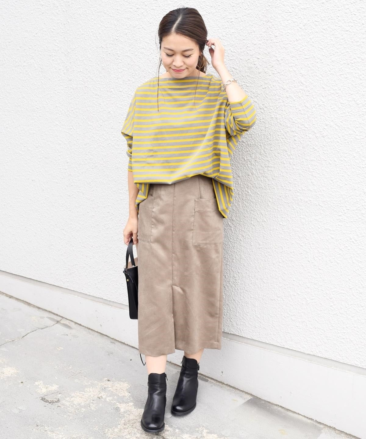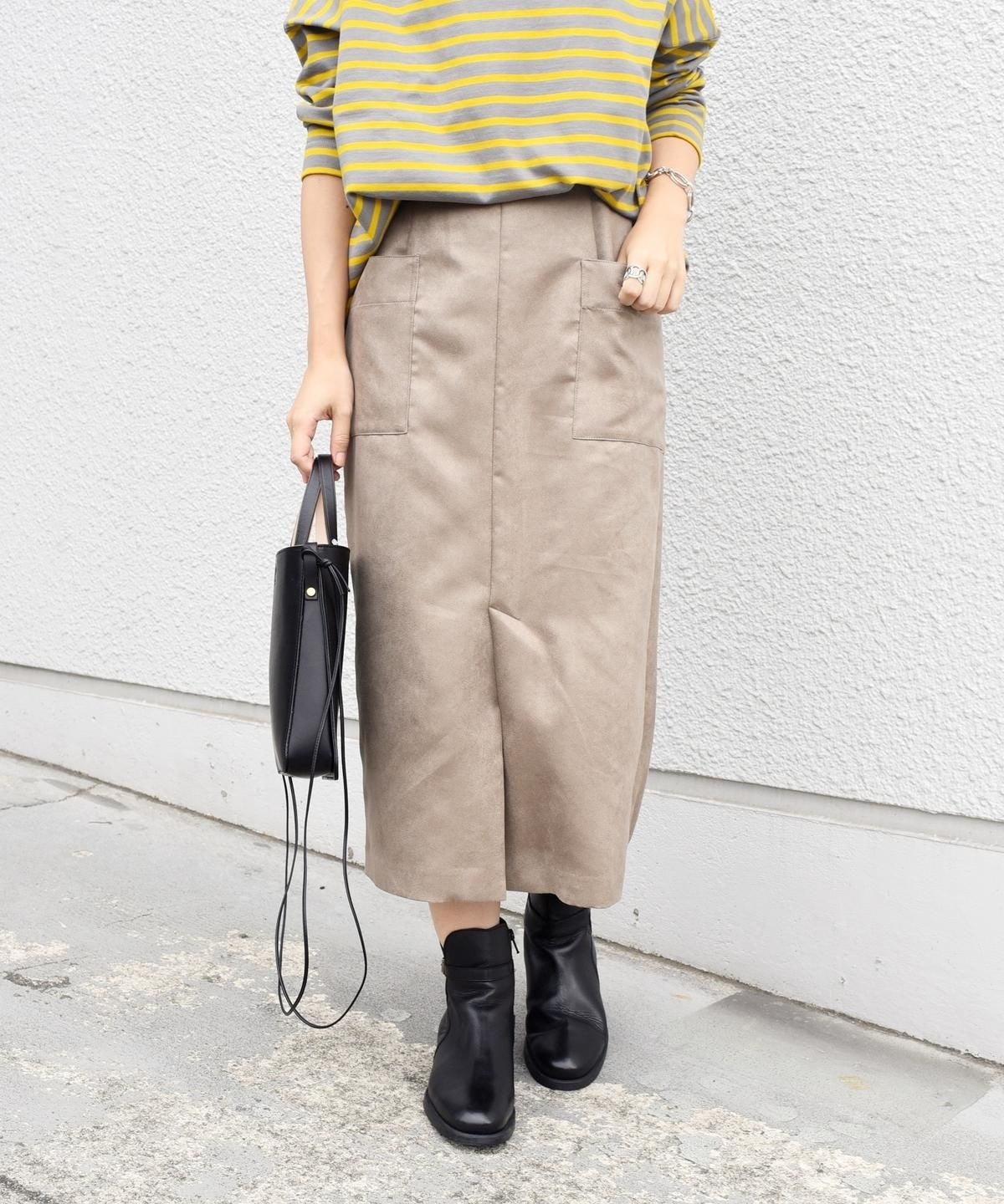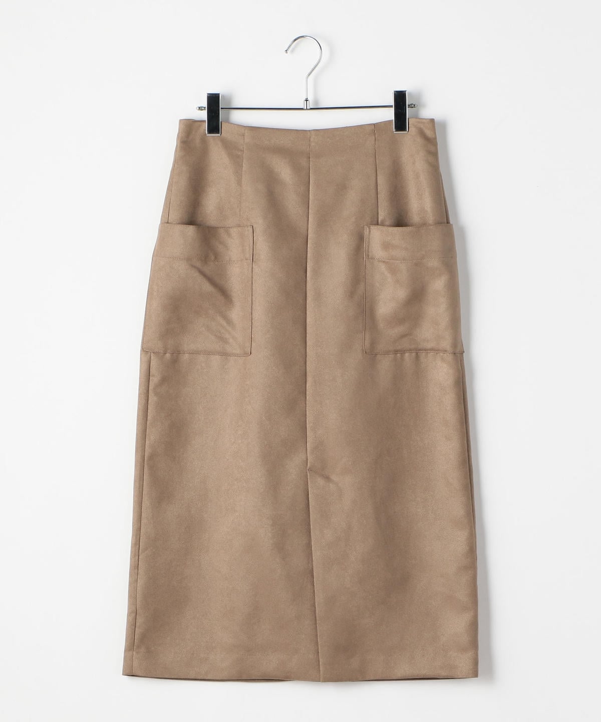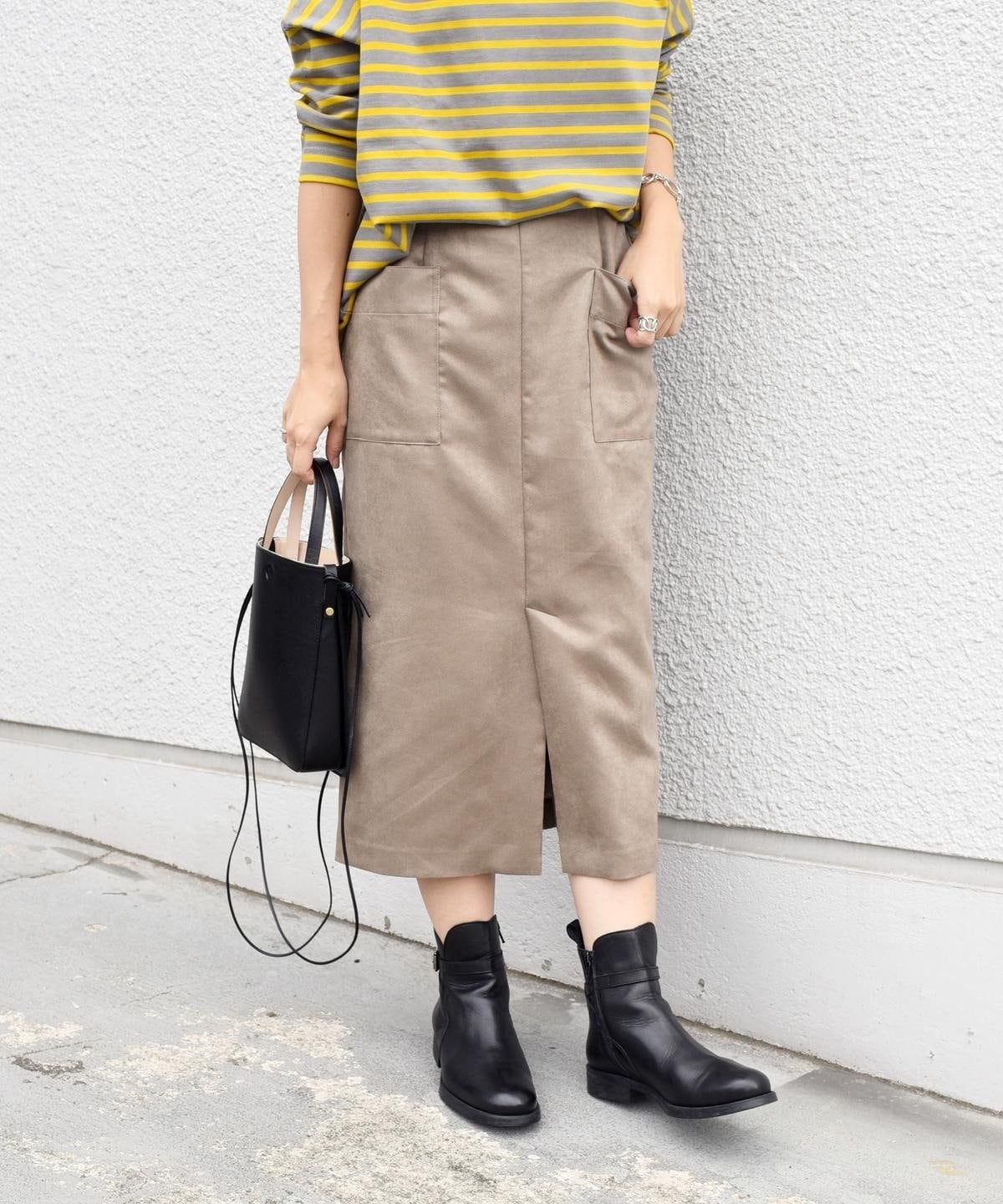 ほんのり起毛感のあるフェイクスエードを使用したストレートスカート。ボディに優しくフィットするシルエット&膝が隠れる位のミディレングスが、大人っぽさを後押ししてくれます。後ろウエストのゴムシャーリング加工で穿き心地抜群。フロントは深いスリット入りで、足さばきが良いのも魅力◎きれいめなトップスと合わせてオフィスシーンにも、カジュアルなスタイリングでデイリーにも活躍してくれる優秀アイテムです。