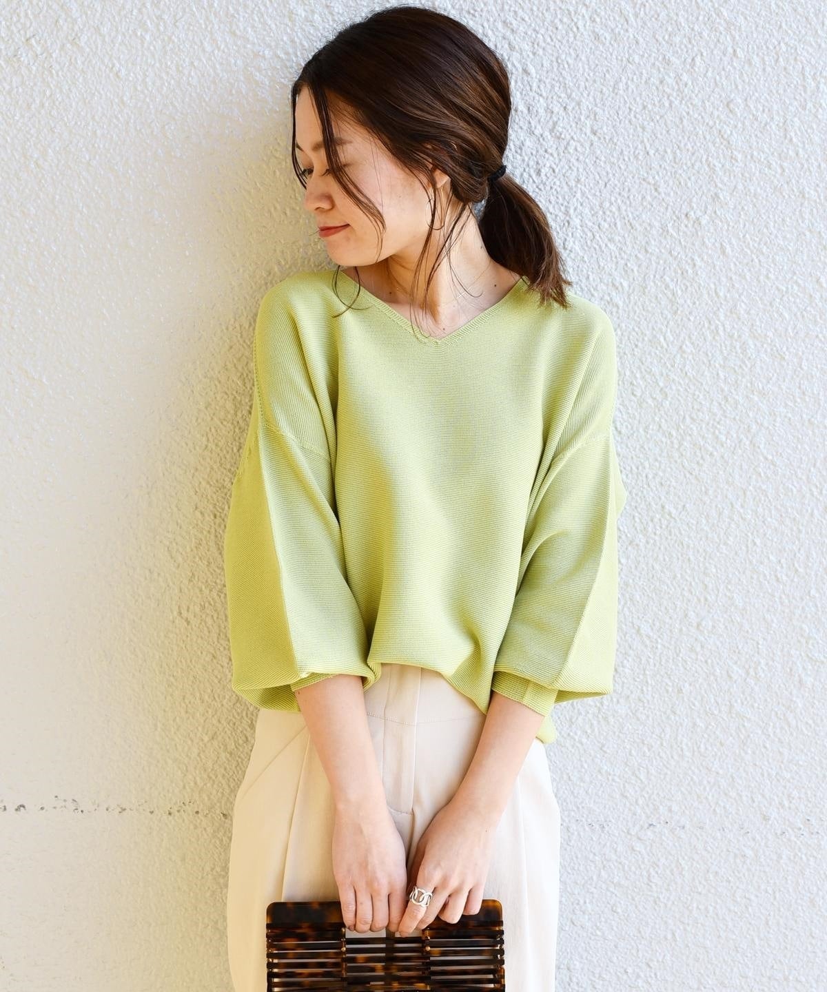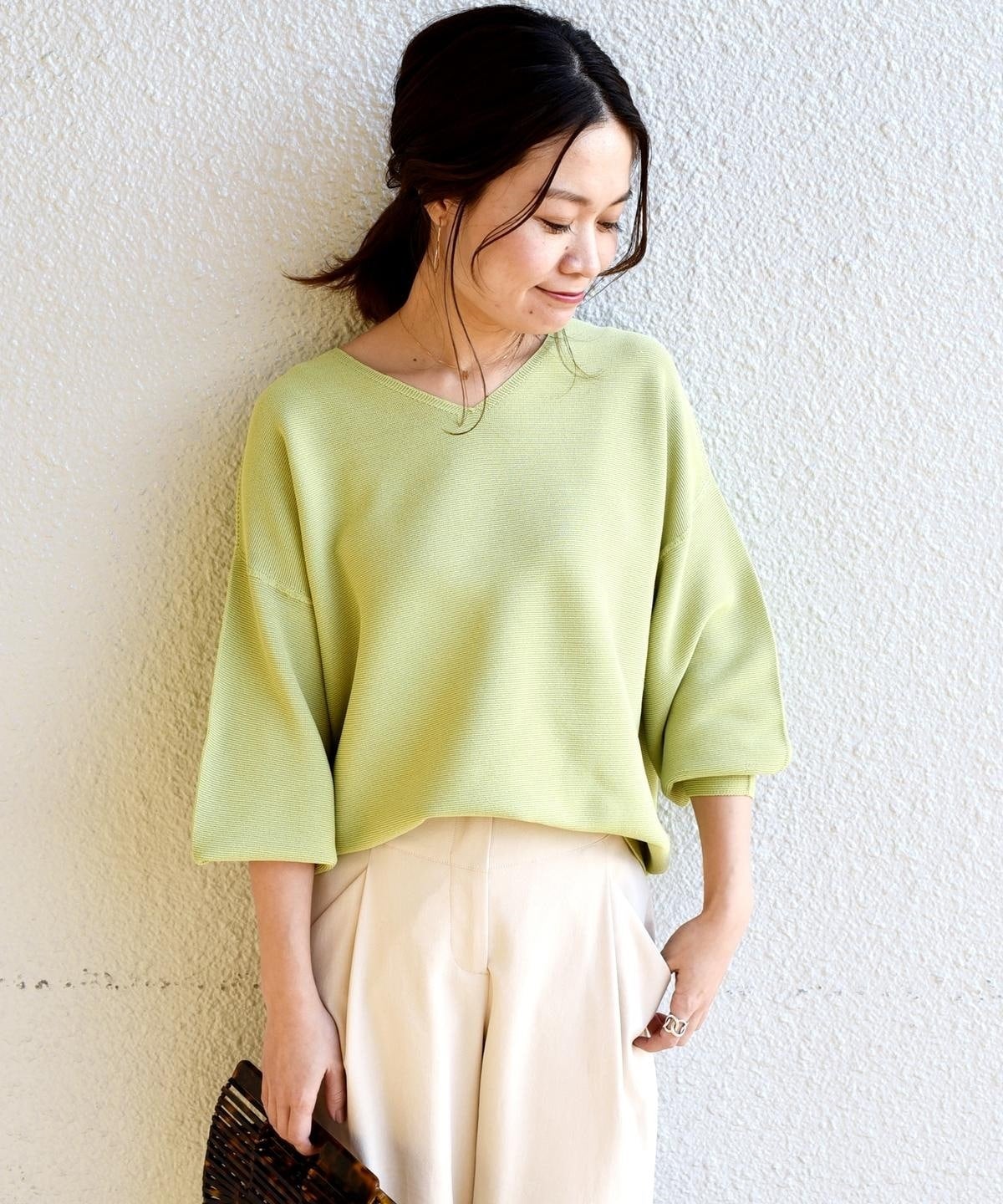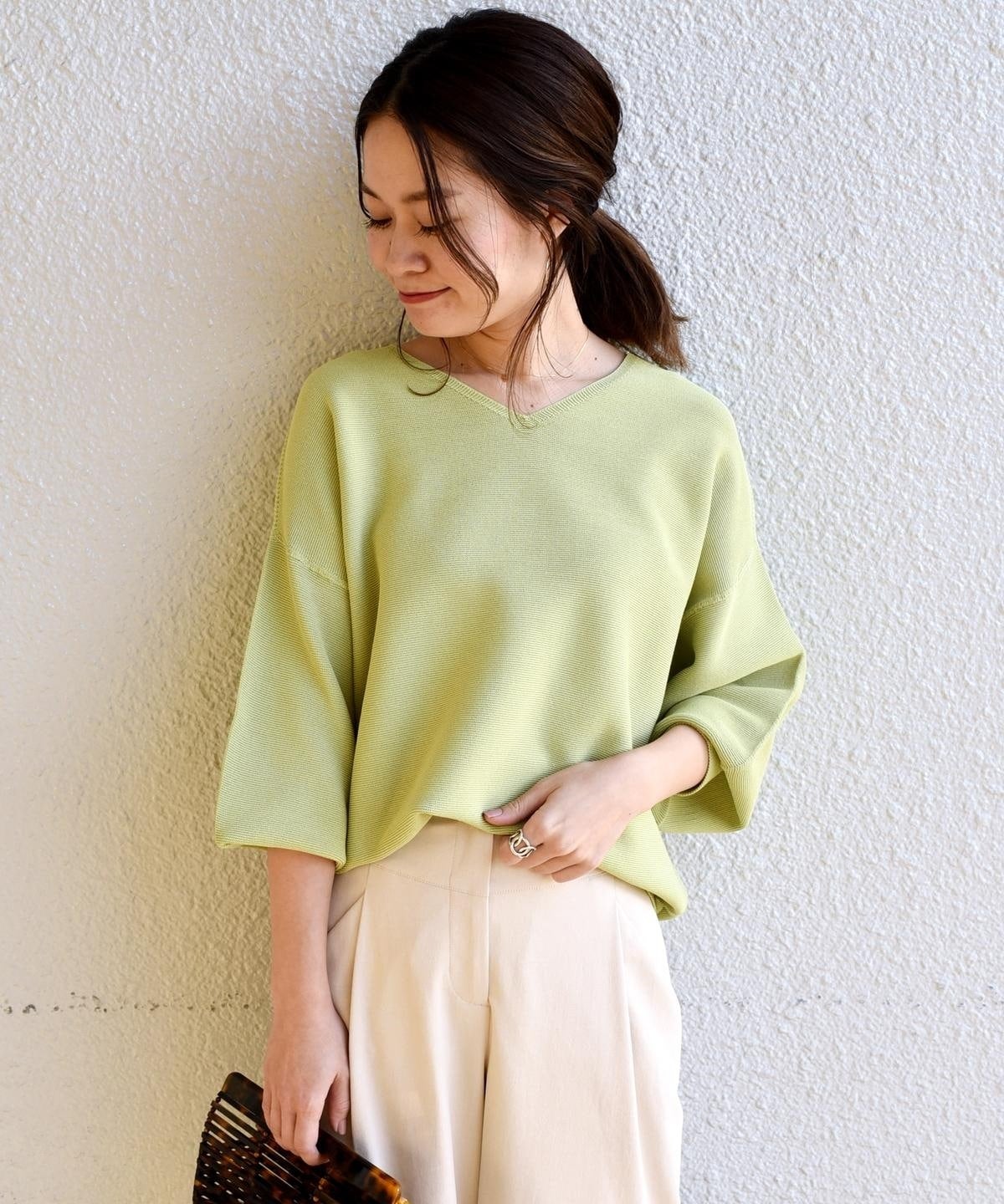 前後どちらもVネックになった2WAY仕様のニット。Vカットが浅めと深めのデザインになっているので、気分やシチュエーションによって着方を変えられます。春らしい爽やかなカラーリングと、さらっとした肌触りがポイント♪縫い継ぎがないホールガーメント仕様なので、ストレスなくご着用いただけます。ご自宅でお洗濯ができるイージーケアも魅力のひとつ◎。