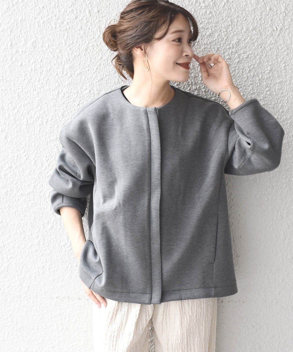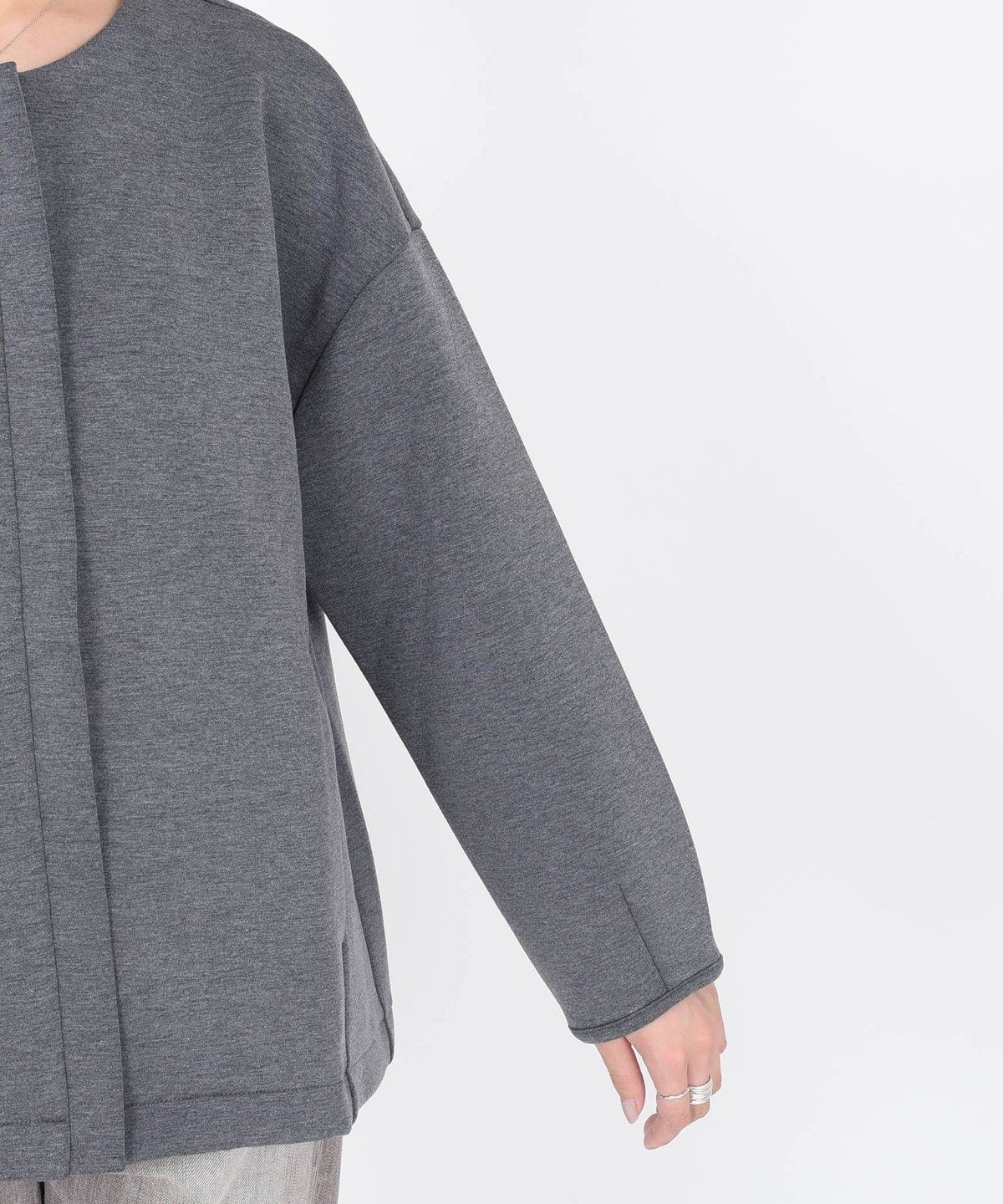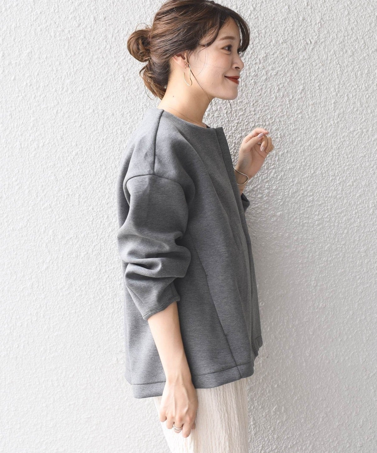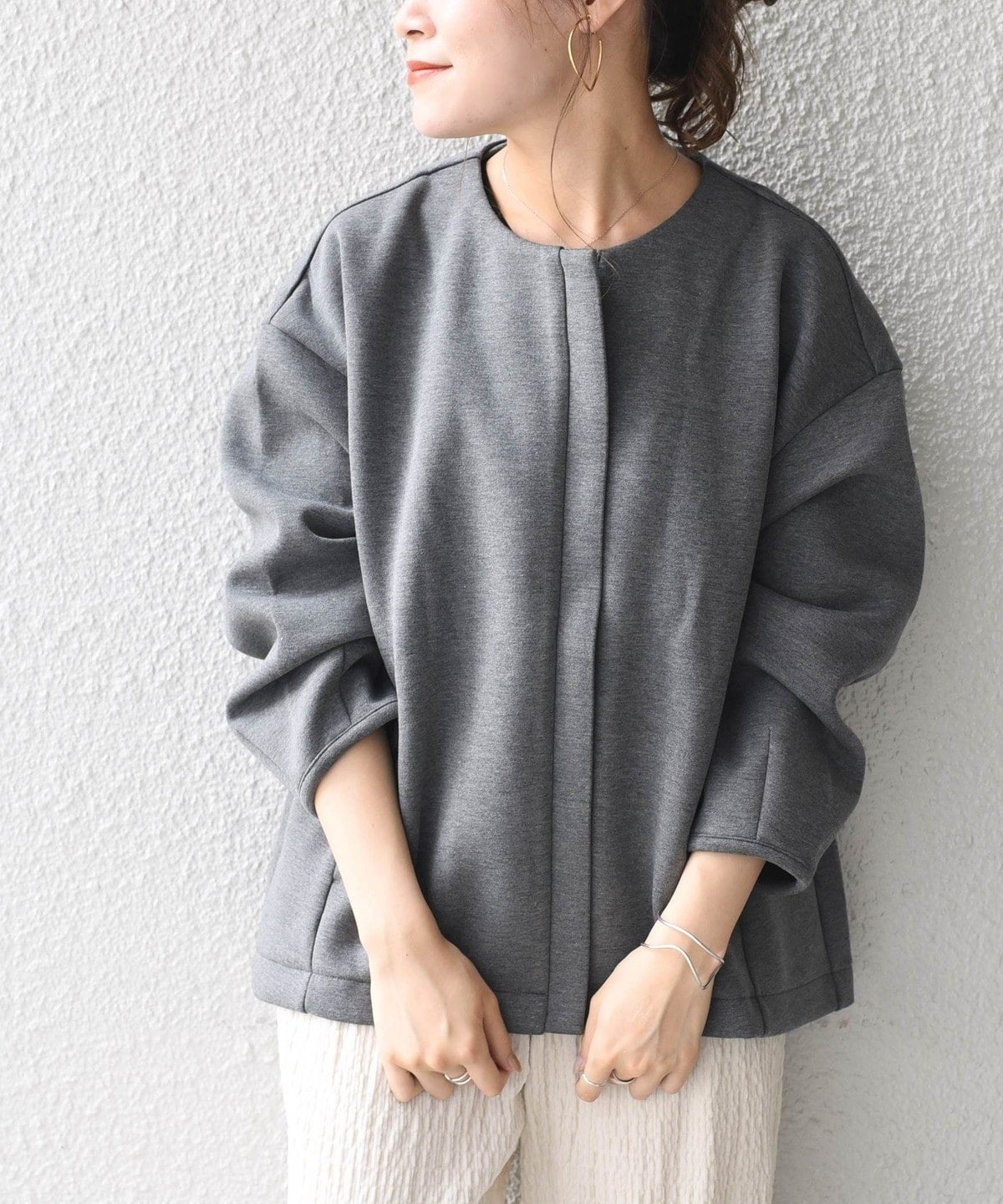 袖口にタックを入れ、ドロップショルダーに仕立て丸みを帯びたフォルムが可愛らしく、すっきりとしたノーカラーで女性らしさを演出したブルゾン。