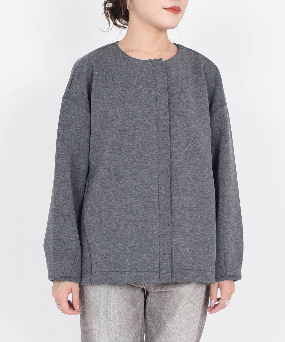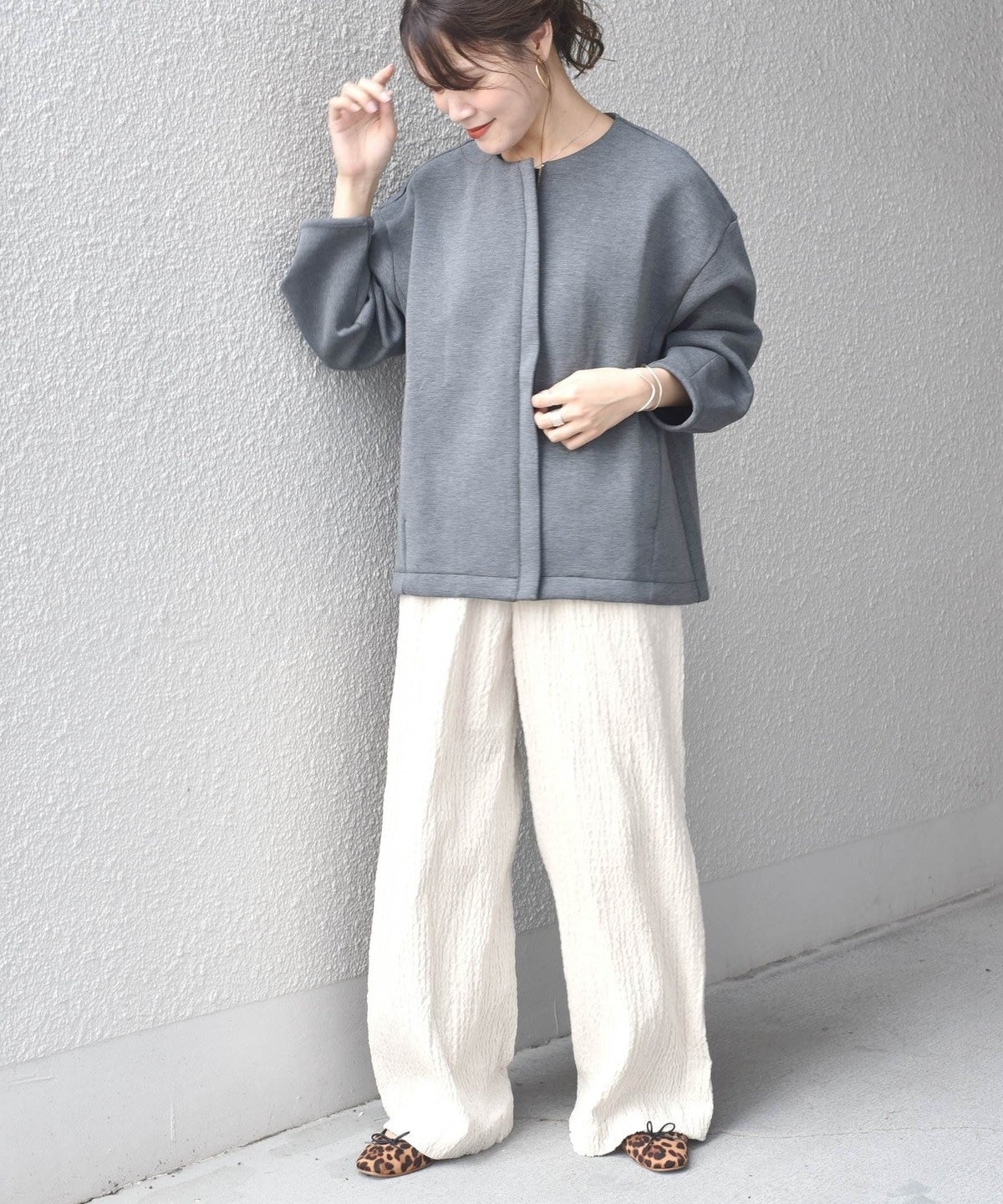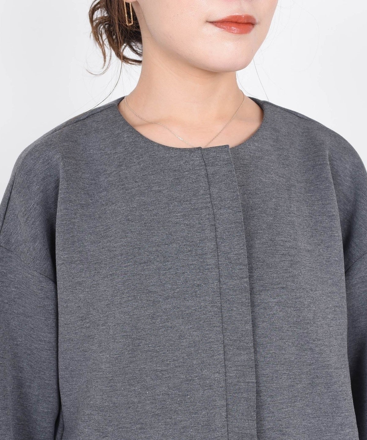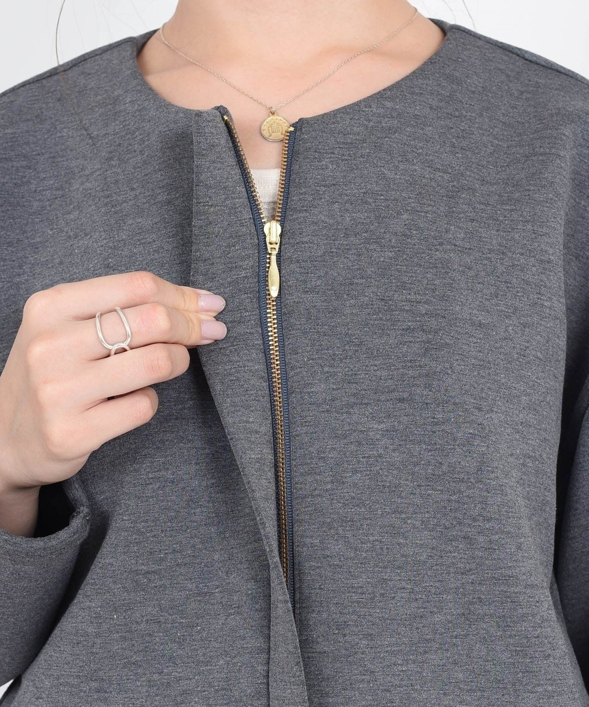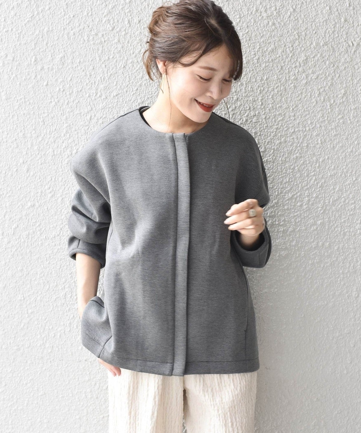 袖口にタックを入れ、ドロップショルダーに仕立て丸みを帯びたフォルムが可愛らしく、すっきりとしたノーカラーで女性らしさを演出したブルゾン。