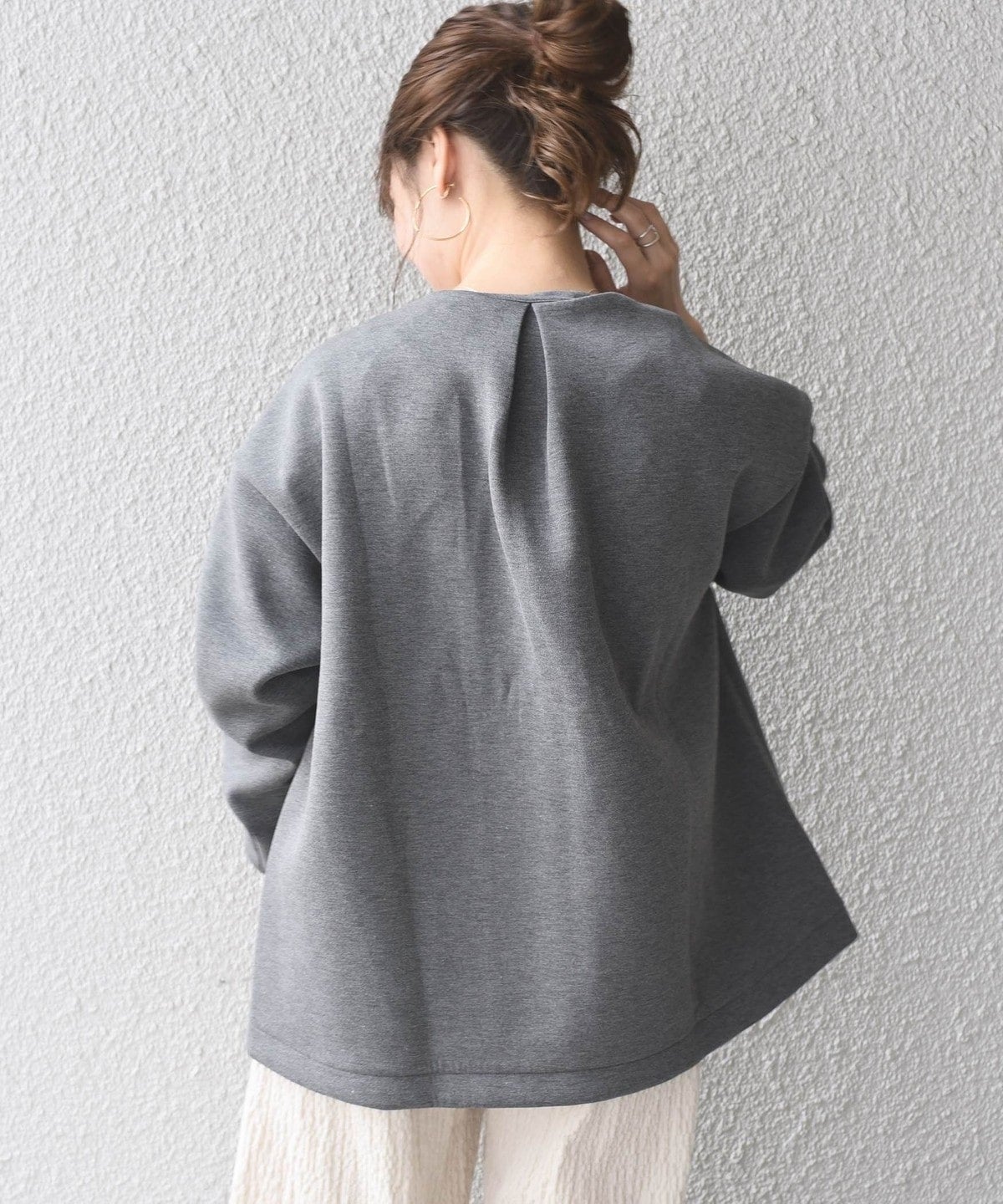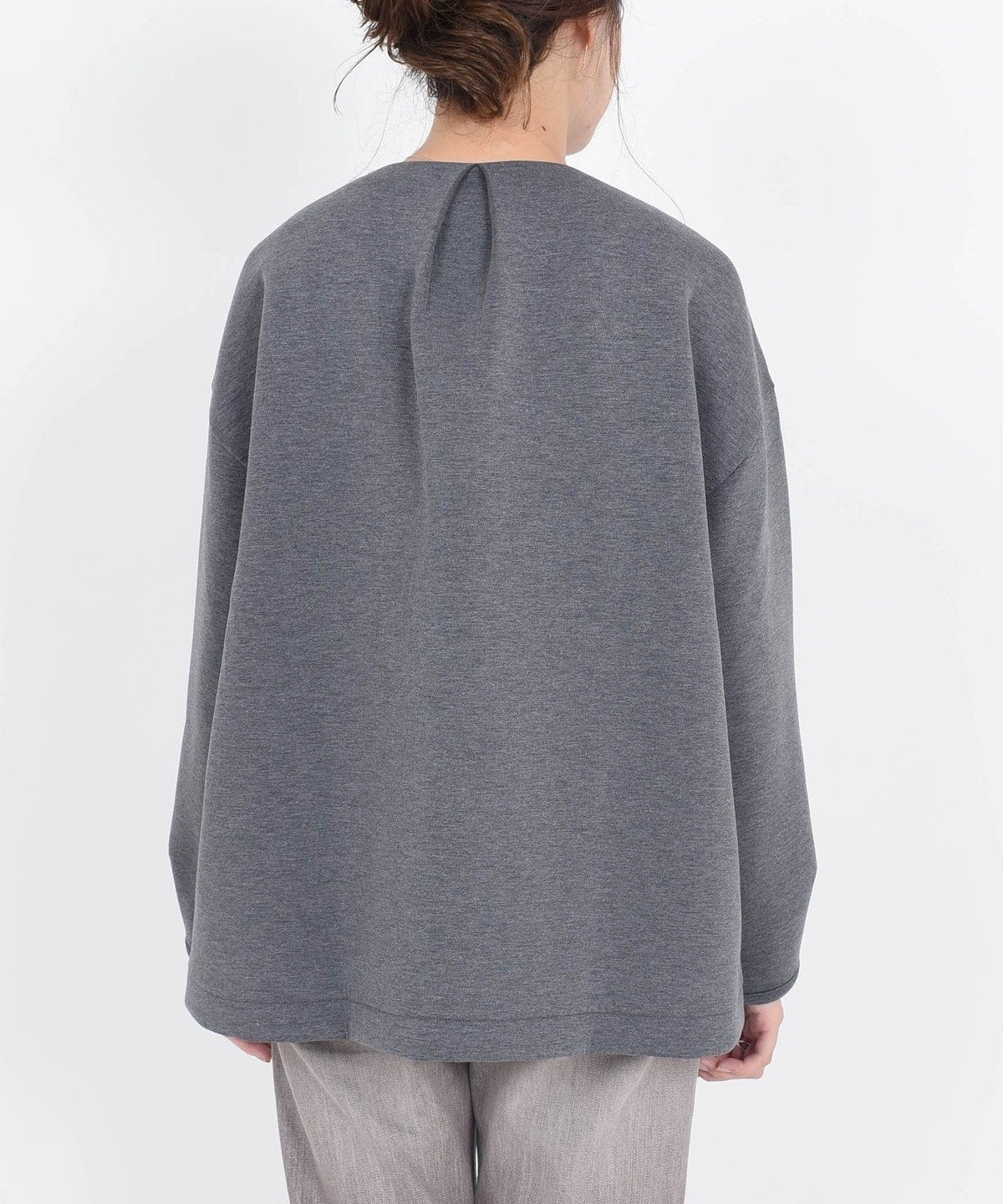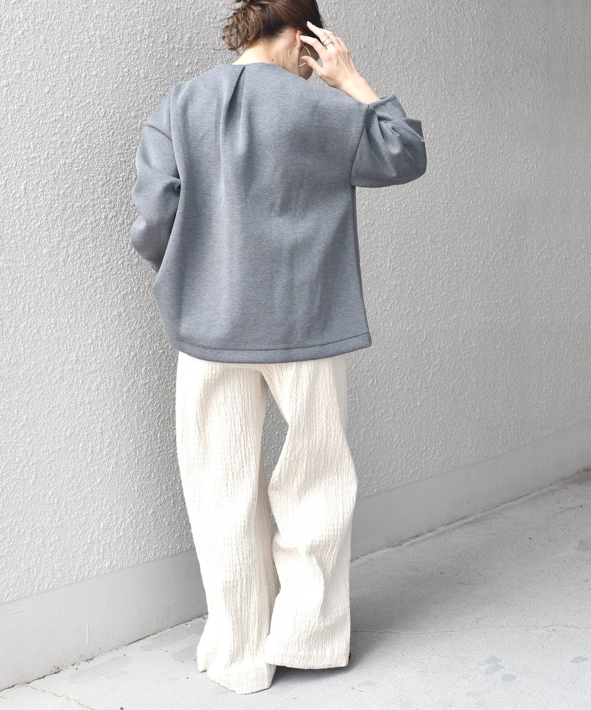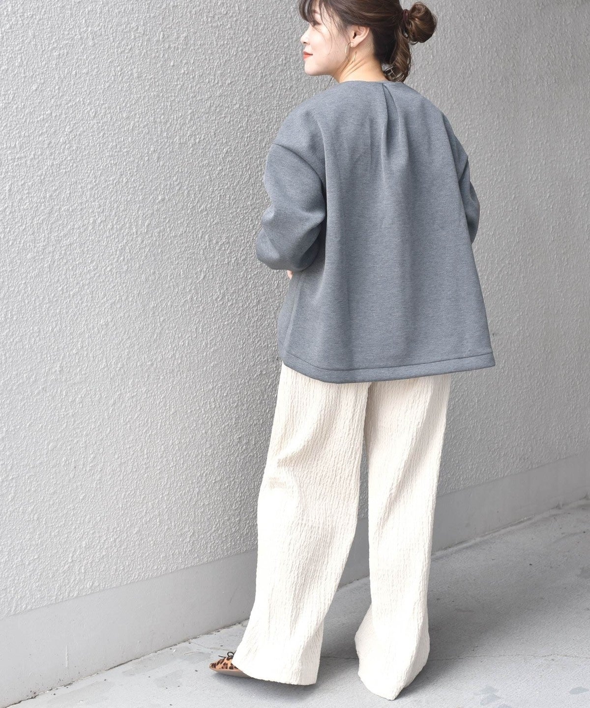 袖口にタックを入れ、ドロップショルダーに仕立て丸みを帯びたフォルムが可愛らしく、すっきりとしたノーカラーで女性らしさを演出したブルゾン。