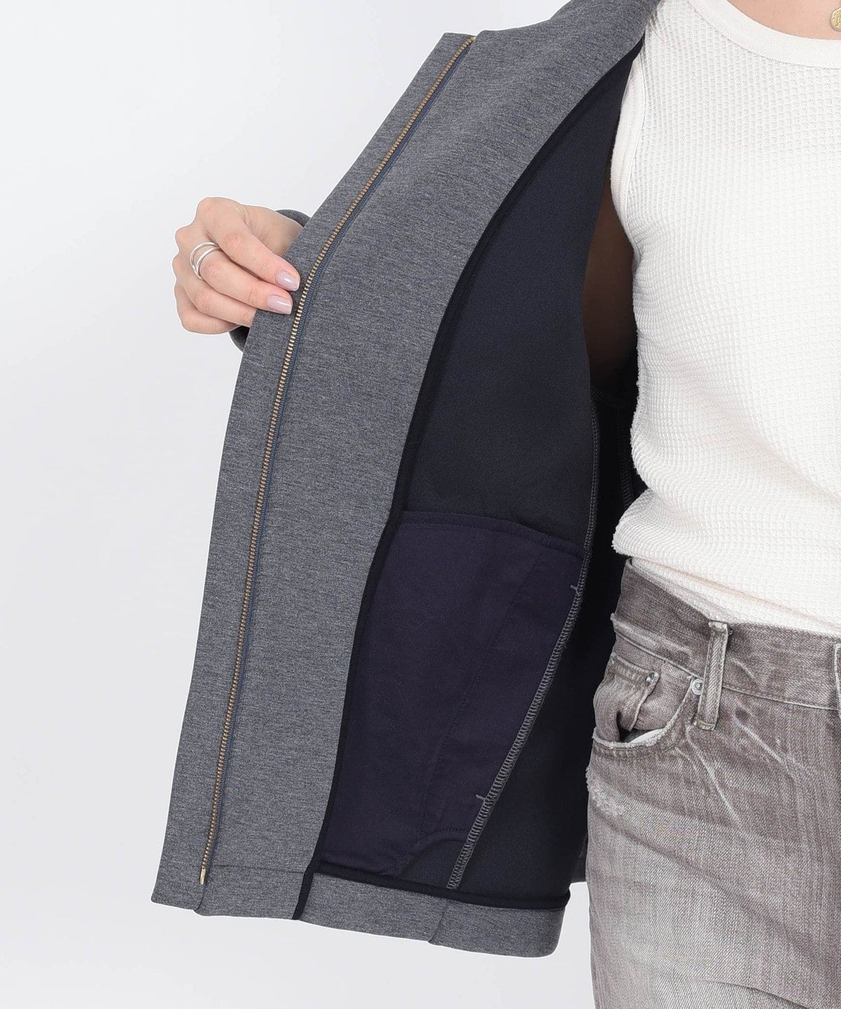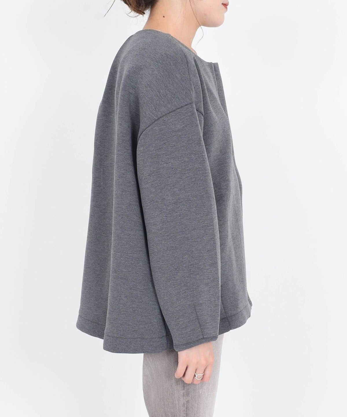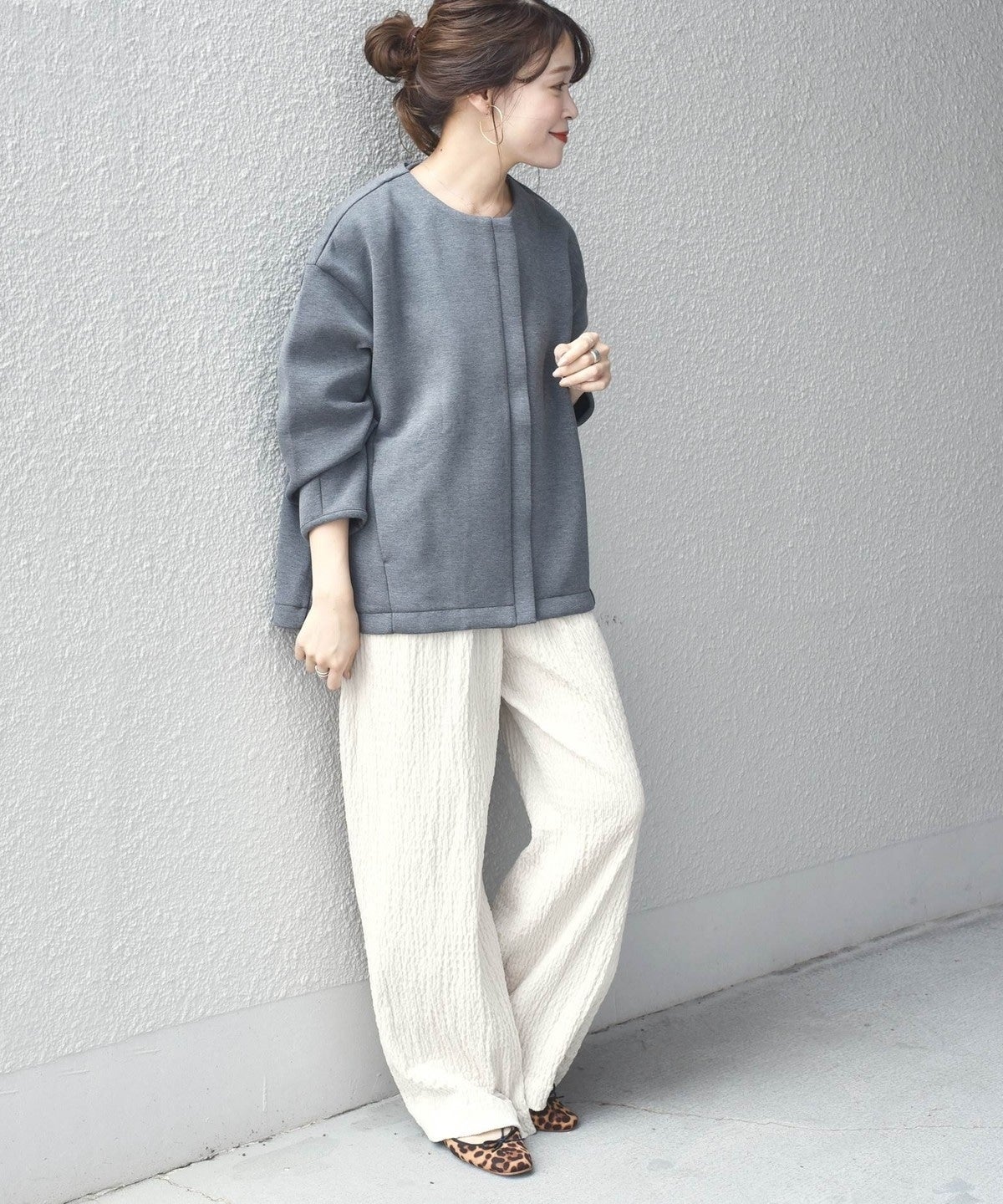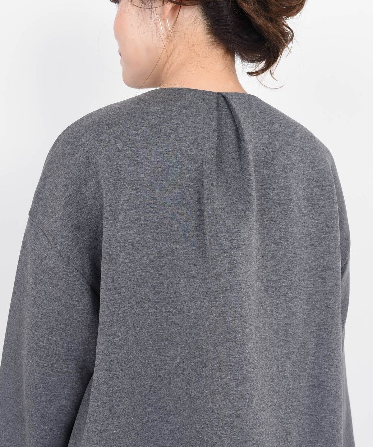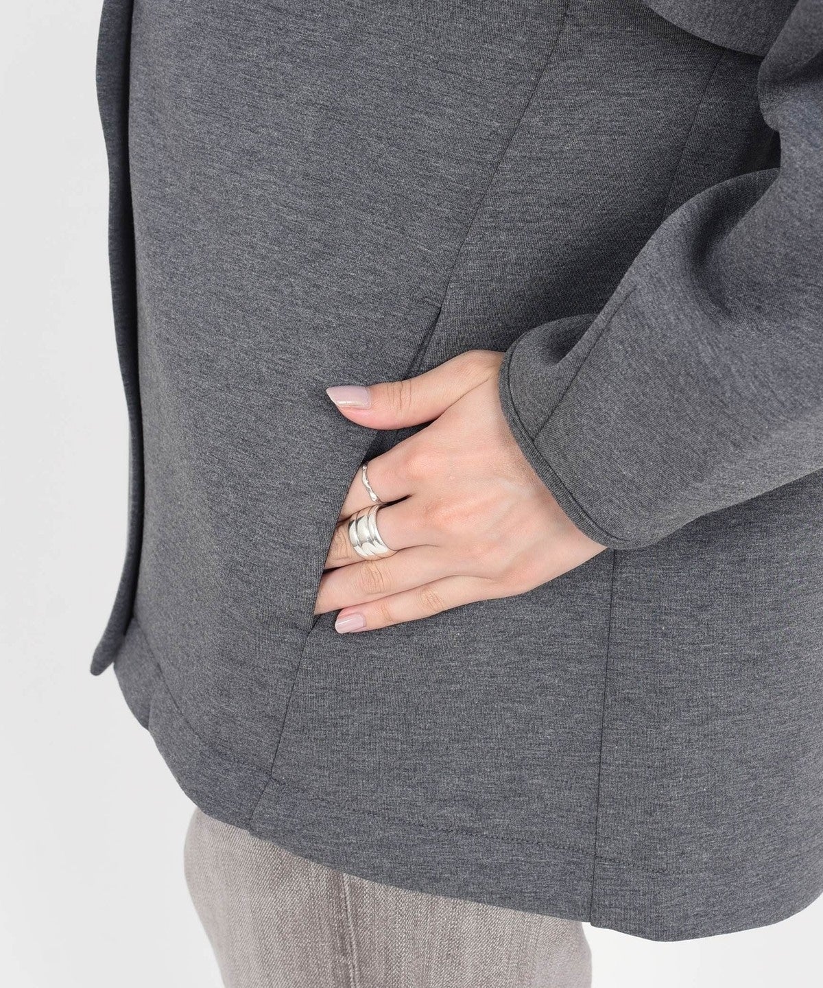 袖口にタックを入れ、ドロップショルダーに仕立て丸みを帯びたフォルムが可愛らしく、すっきりとしたノーカラーで女性らしさを演出したブルゾン。