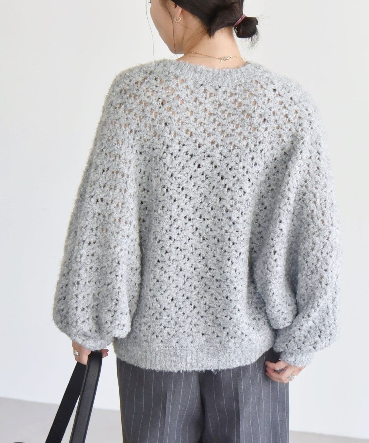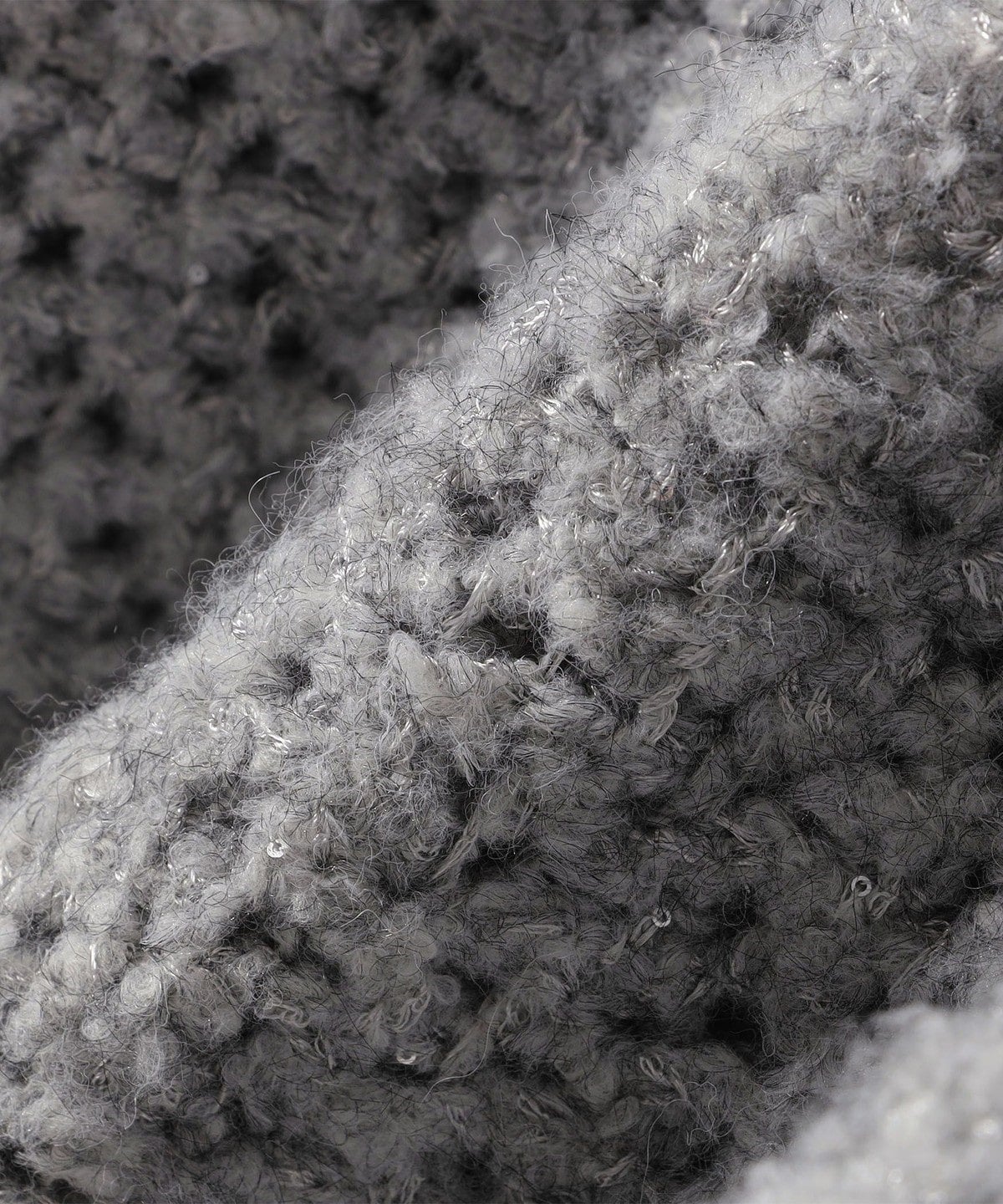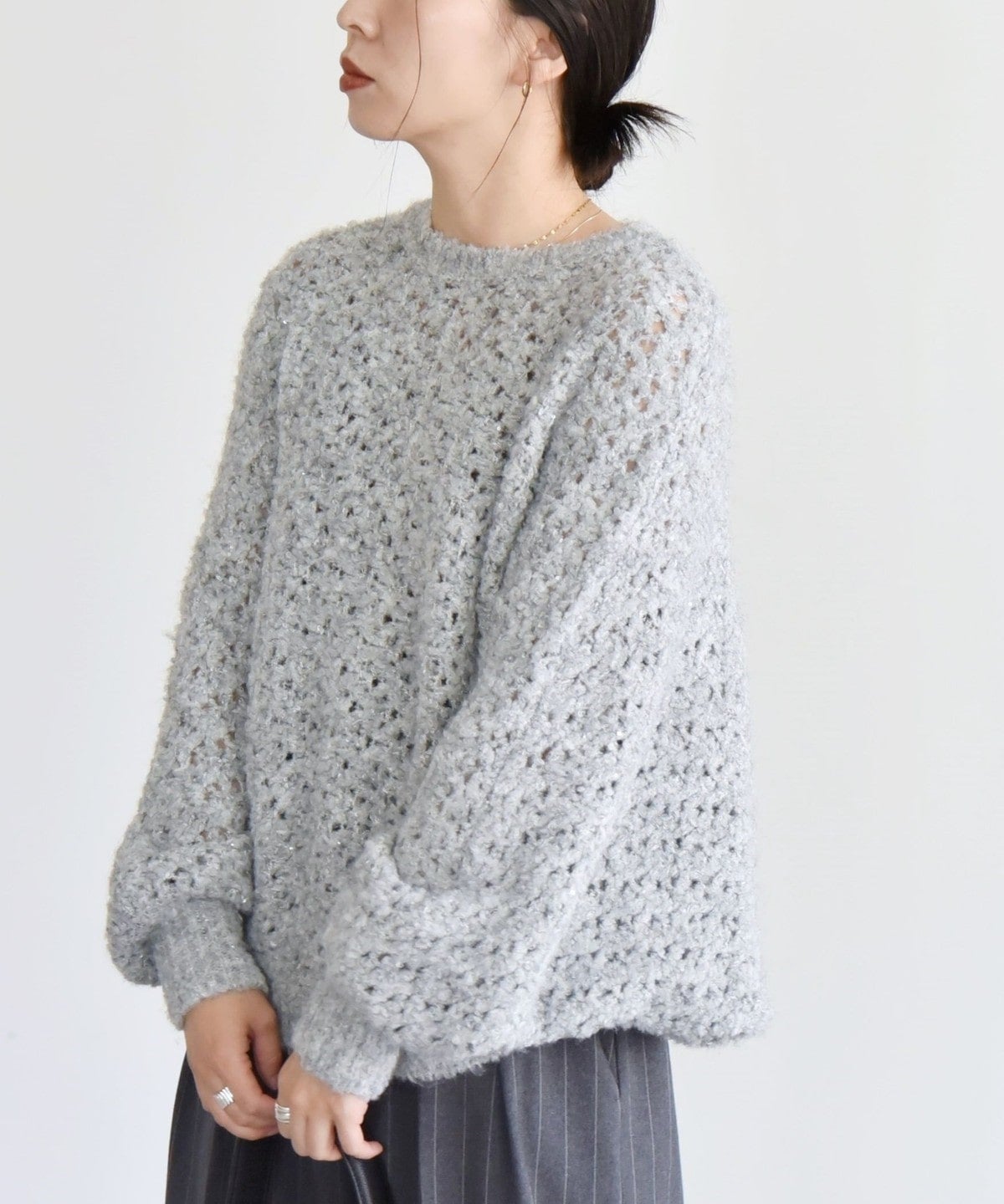 小さなスパンコールと、編み込まれた光沢のある糸がきらっと上品に輝くざっくりニット。