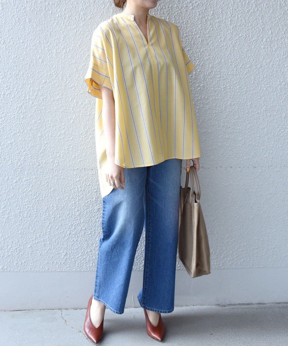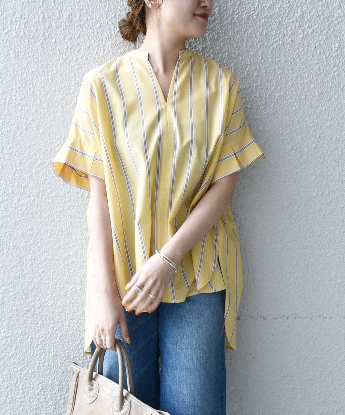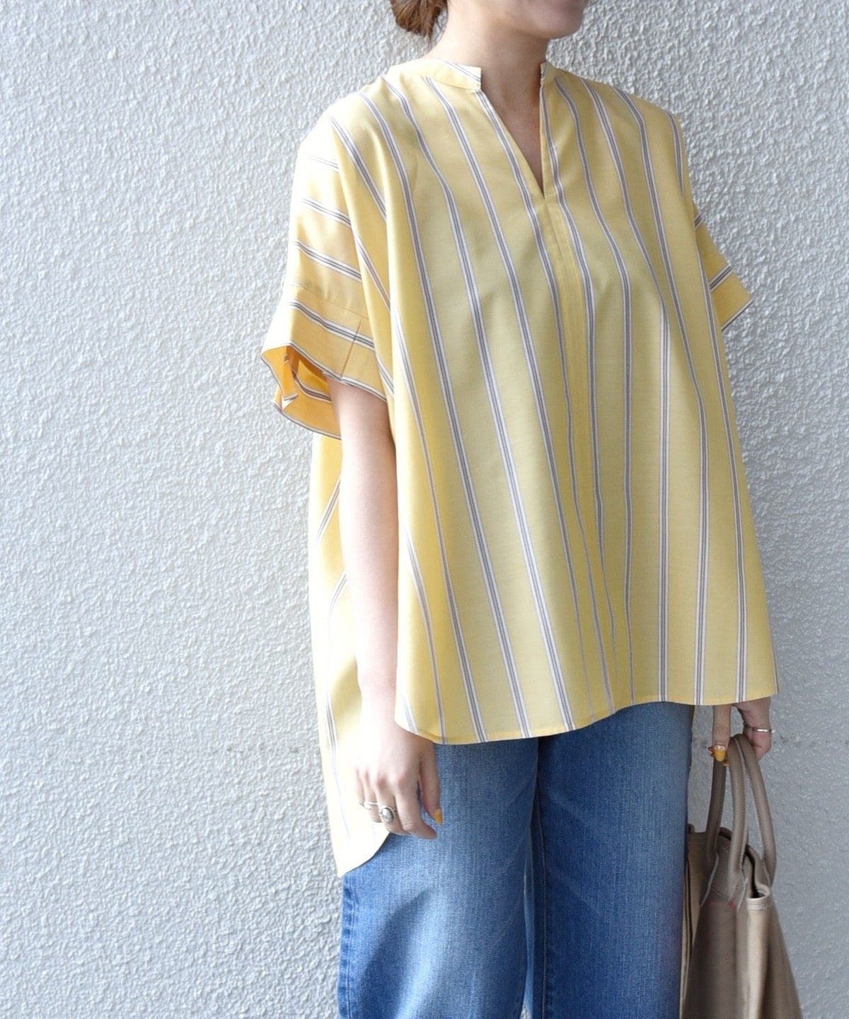 マルチストライプが爽やかな印象を与えてくれるスキッパーブラウス。