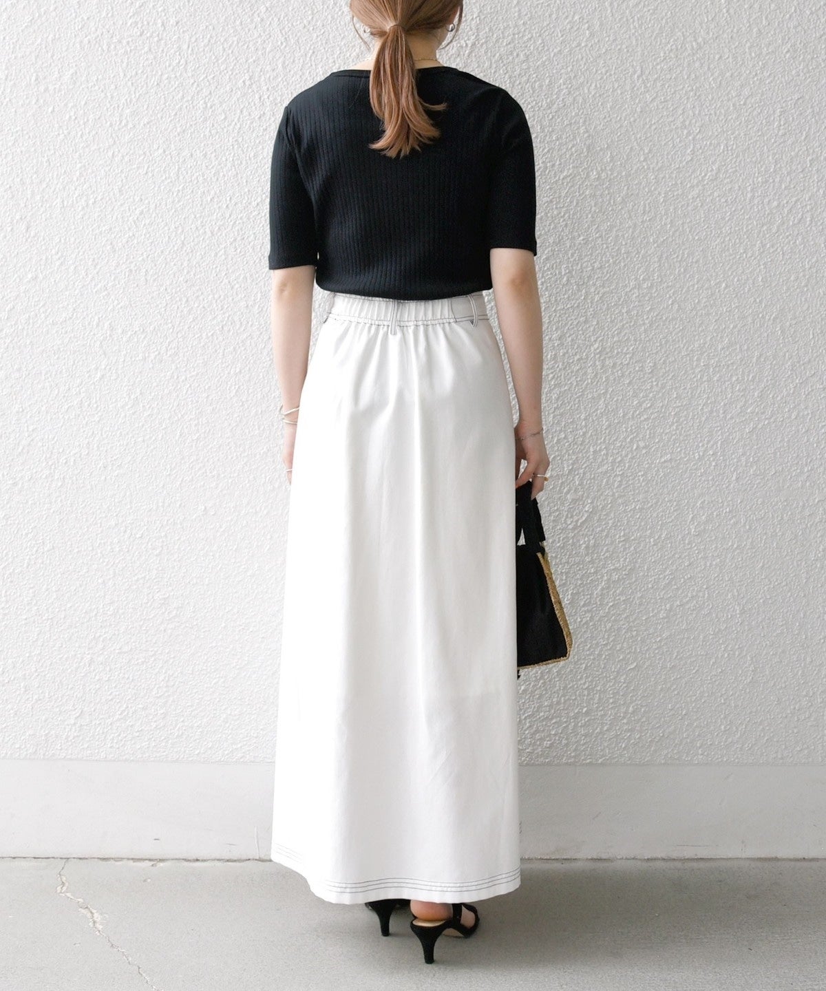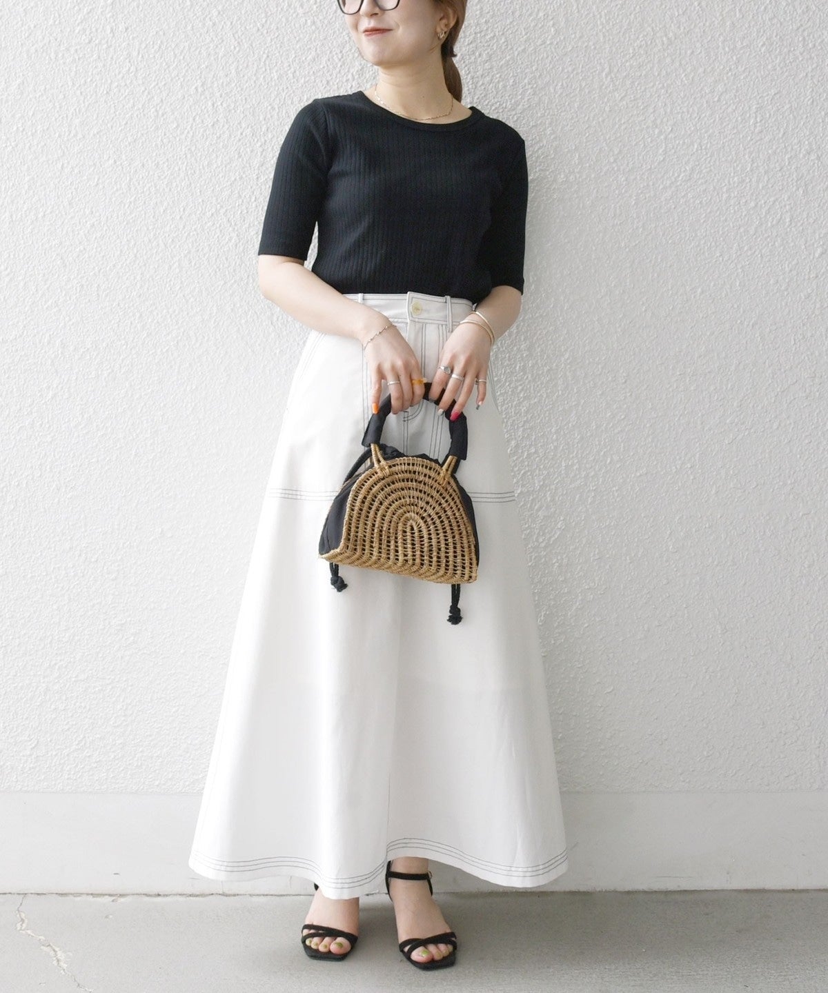 デコルテラインがすっきりと見えるクルーネックをセレクト。