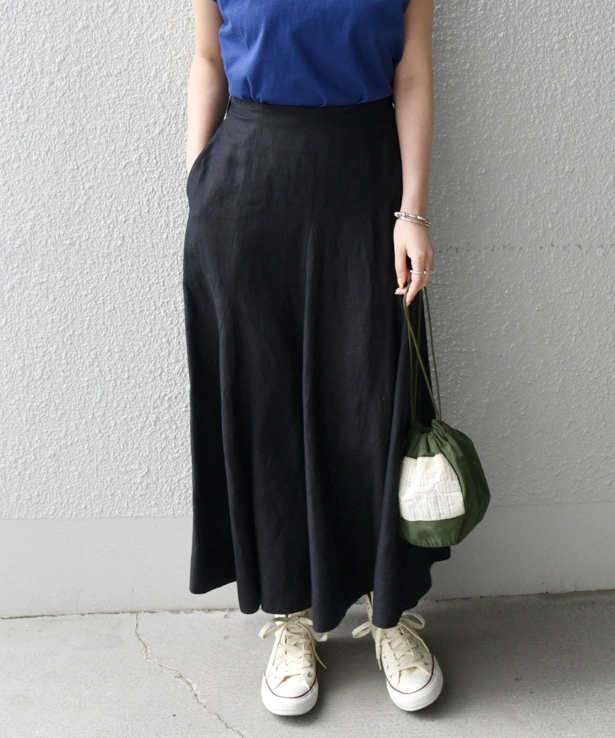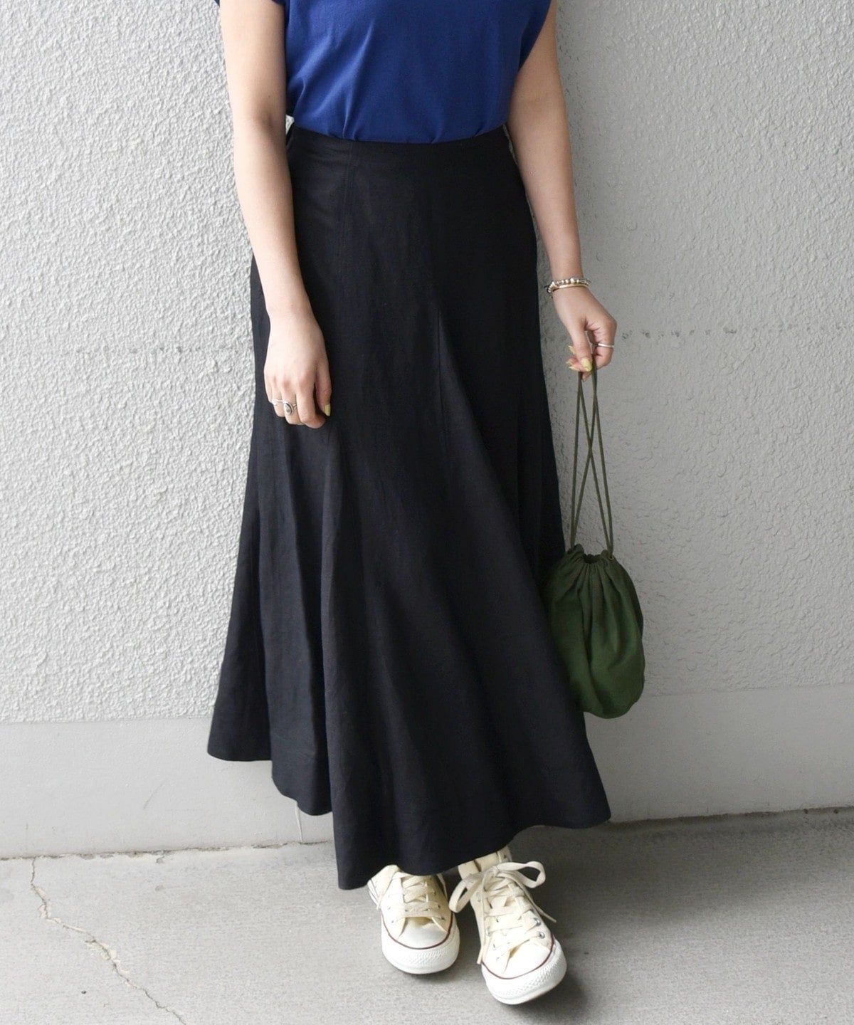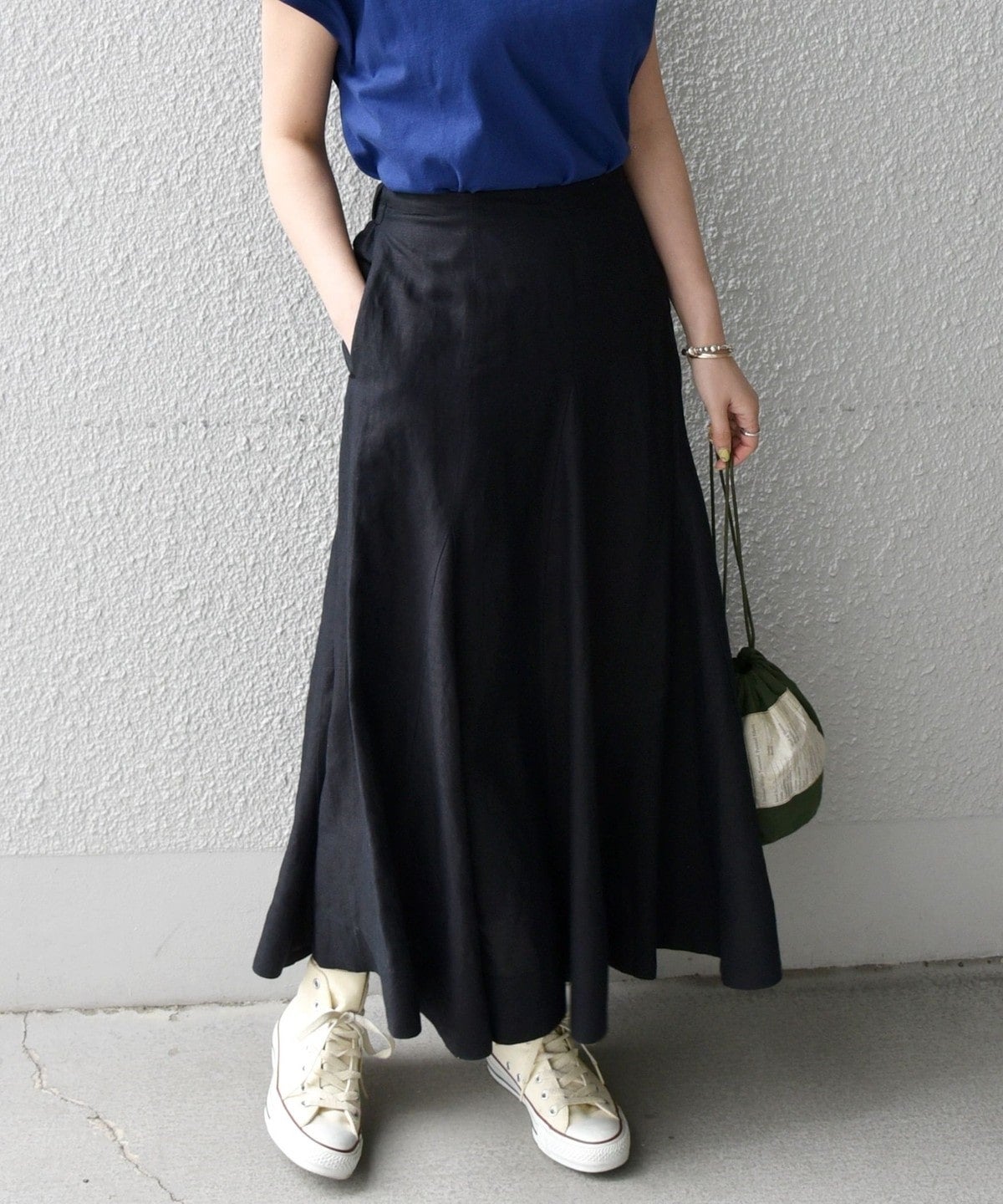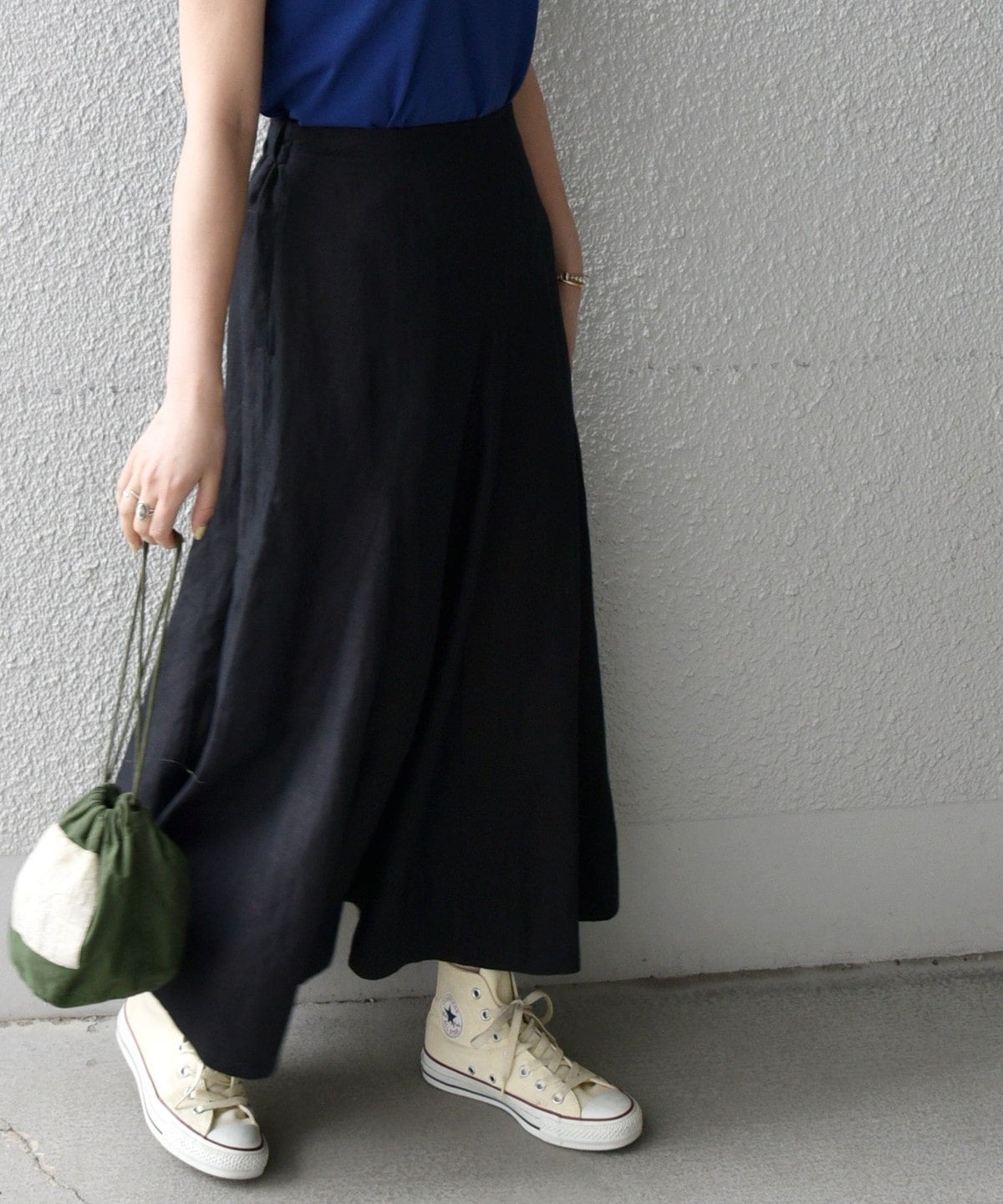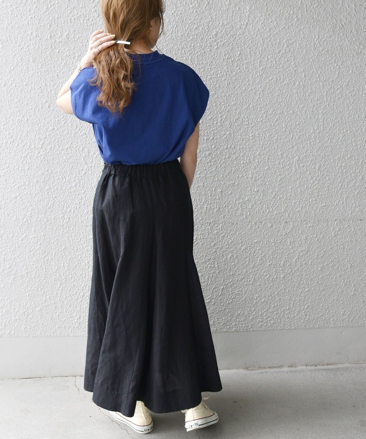 サイズ感:後ろウエストゴムなので、カットソーやブラウスをインしても余裕があります。やや大きめに感じました。着丈はすねが隠れる長さです。トップスとのバランスもとりやすいアイテム。