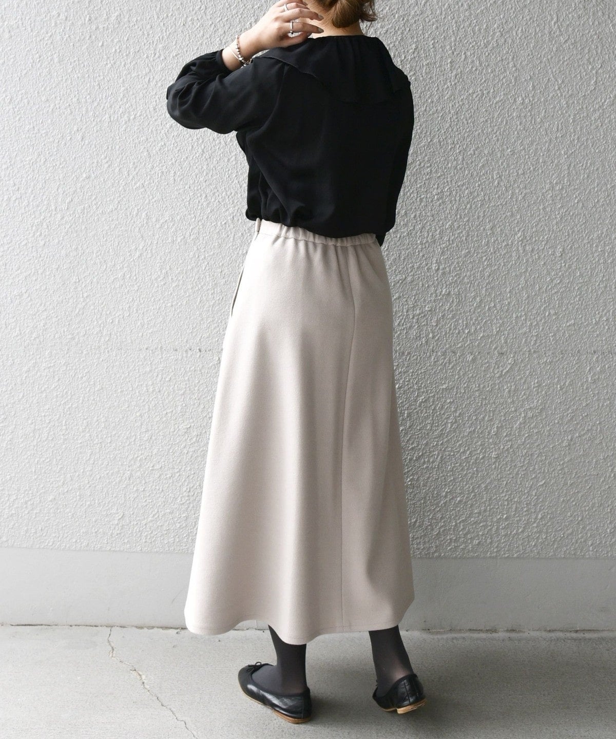 ウエスト部分はスッキリしていながら、裾周りがゆったりとしてフレアが入って広がりがあり、着用時のラインが綺麗なスカートです。