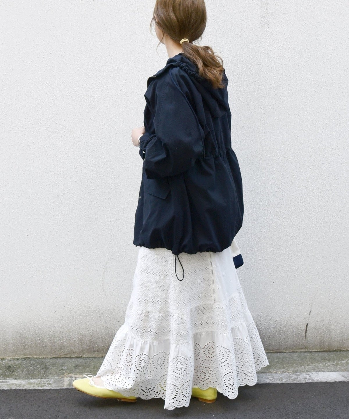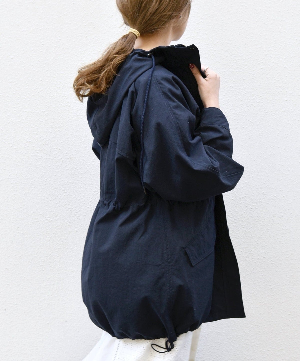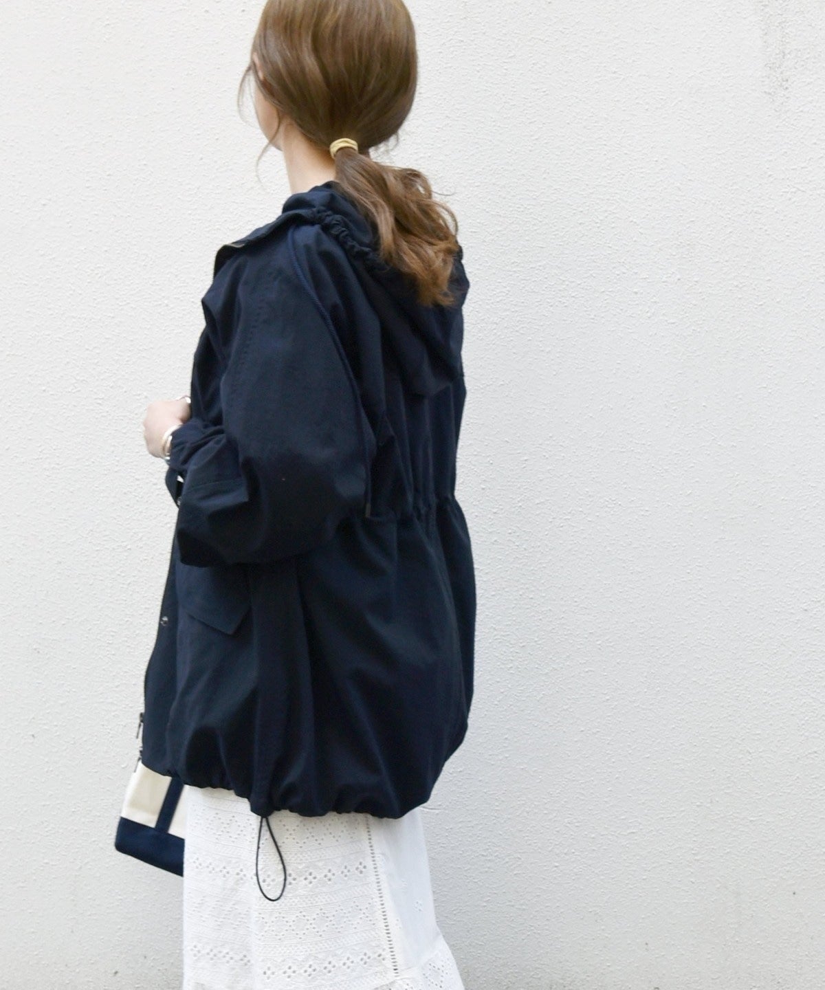 フード口やネック周りのドロストギャザーがアクセントになるブルゾンです。