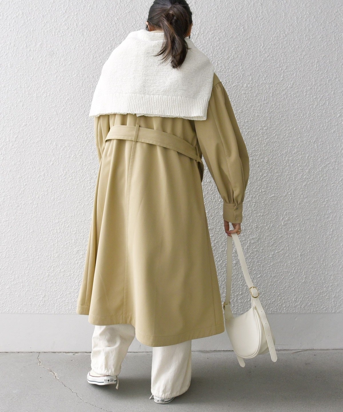 トレンチコートをイメージした大きめの襟は、顔回りをすっきりと見せてくれます。