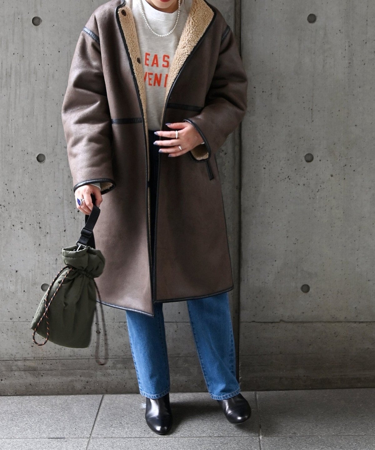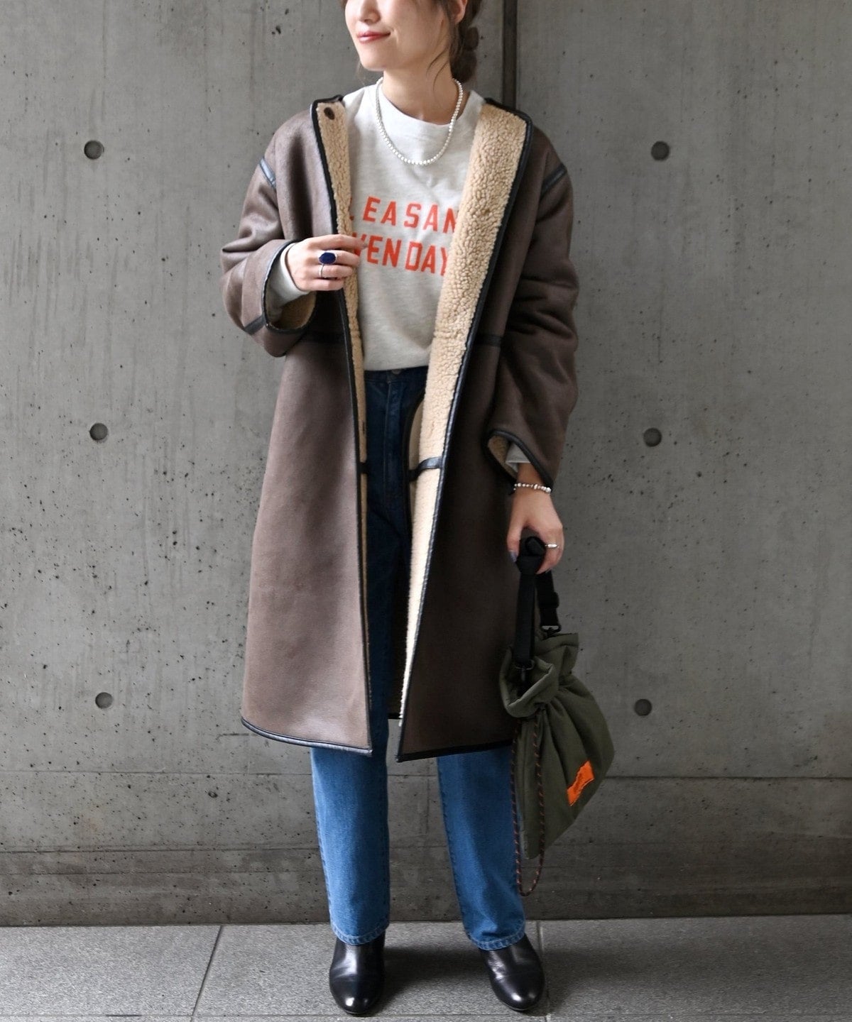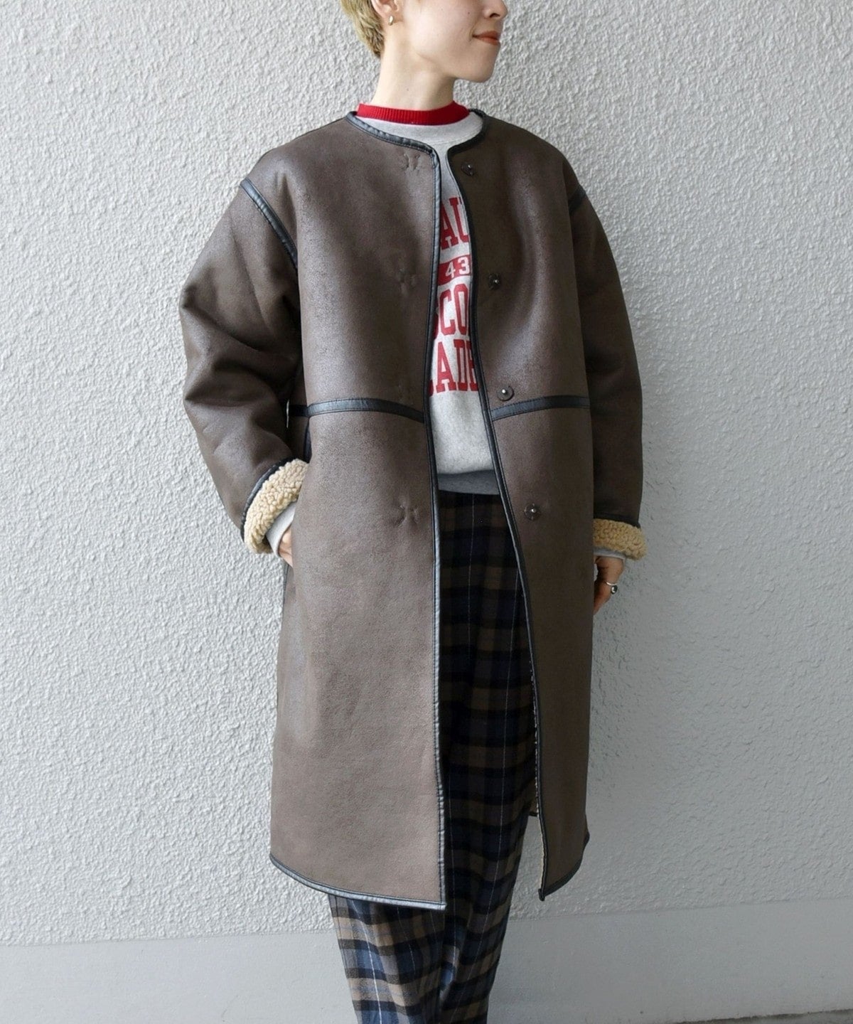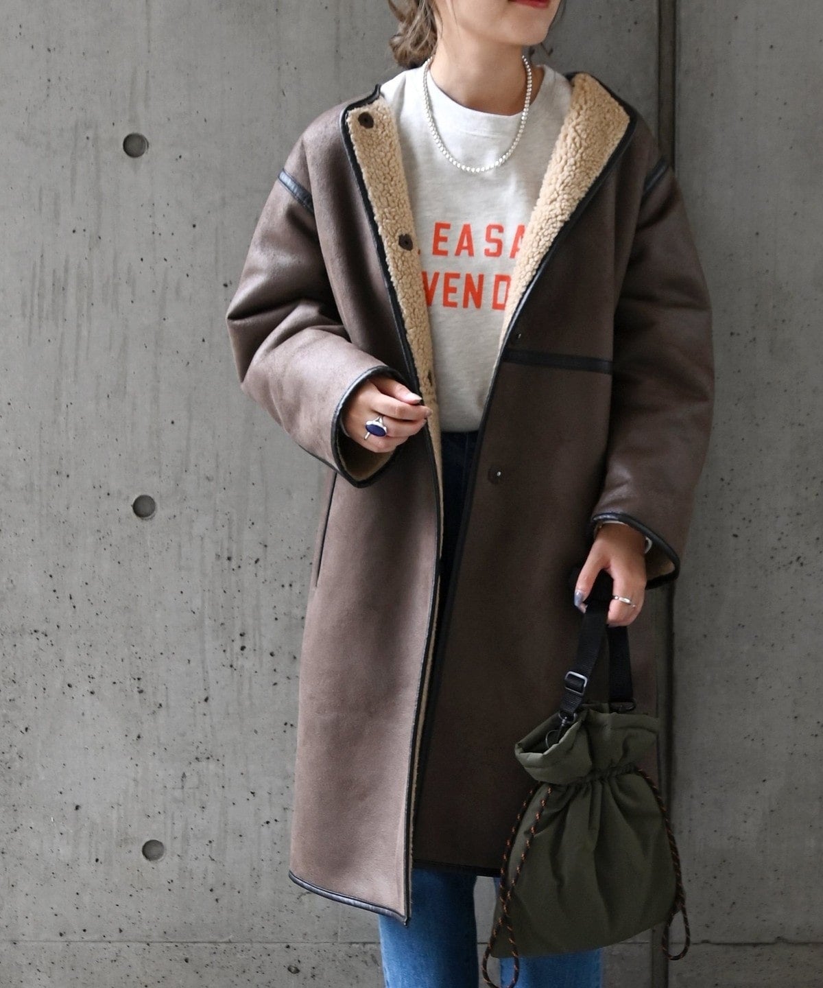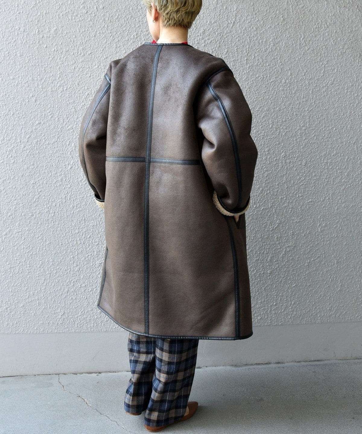 SHIPS any: フェイクムートン ノーカラー ロングコート