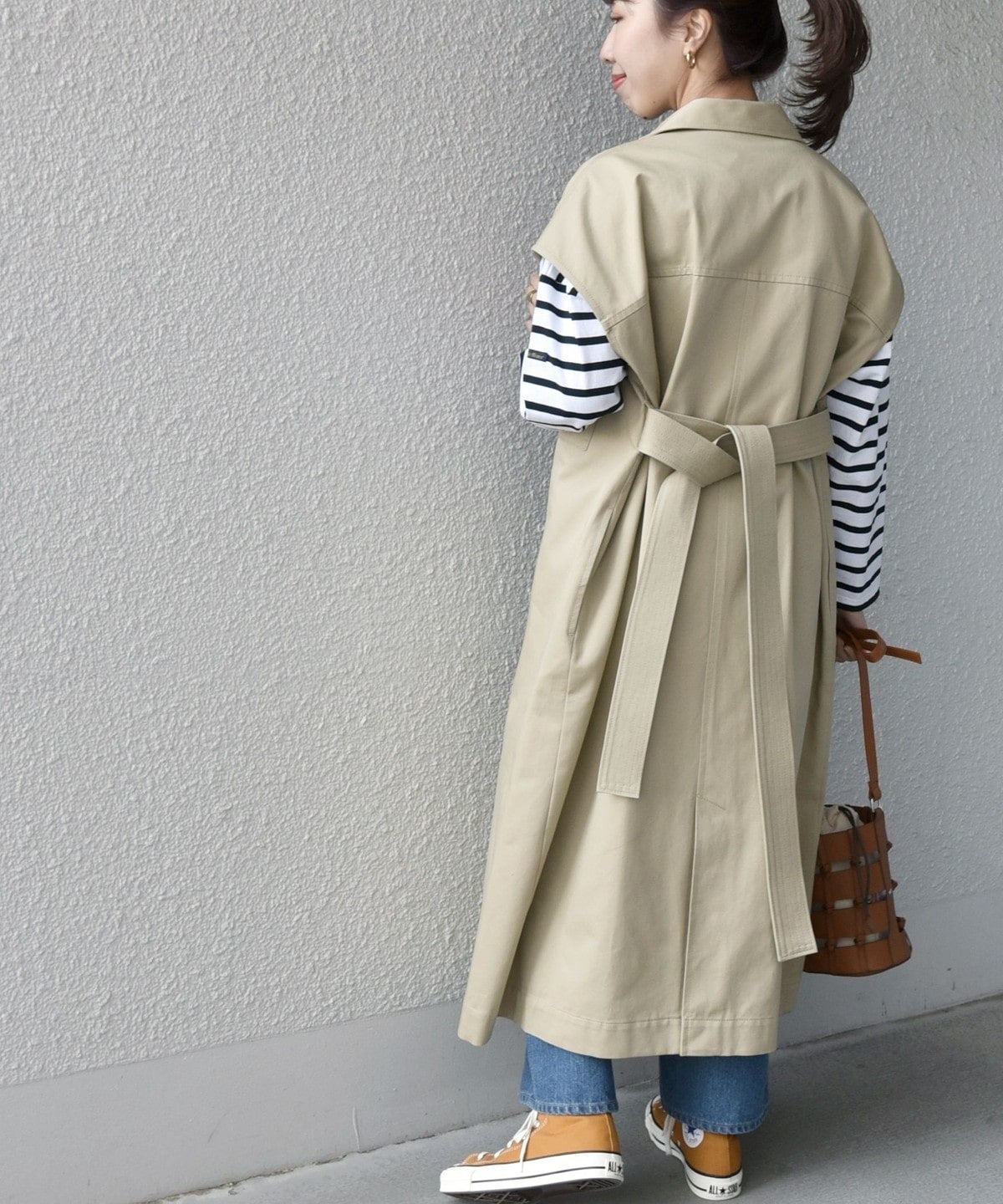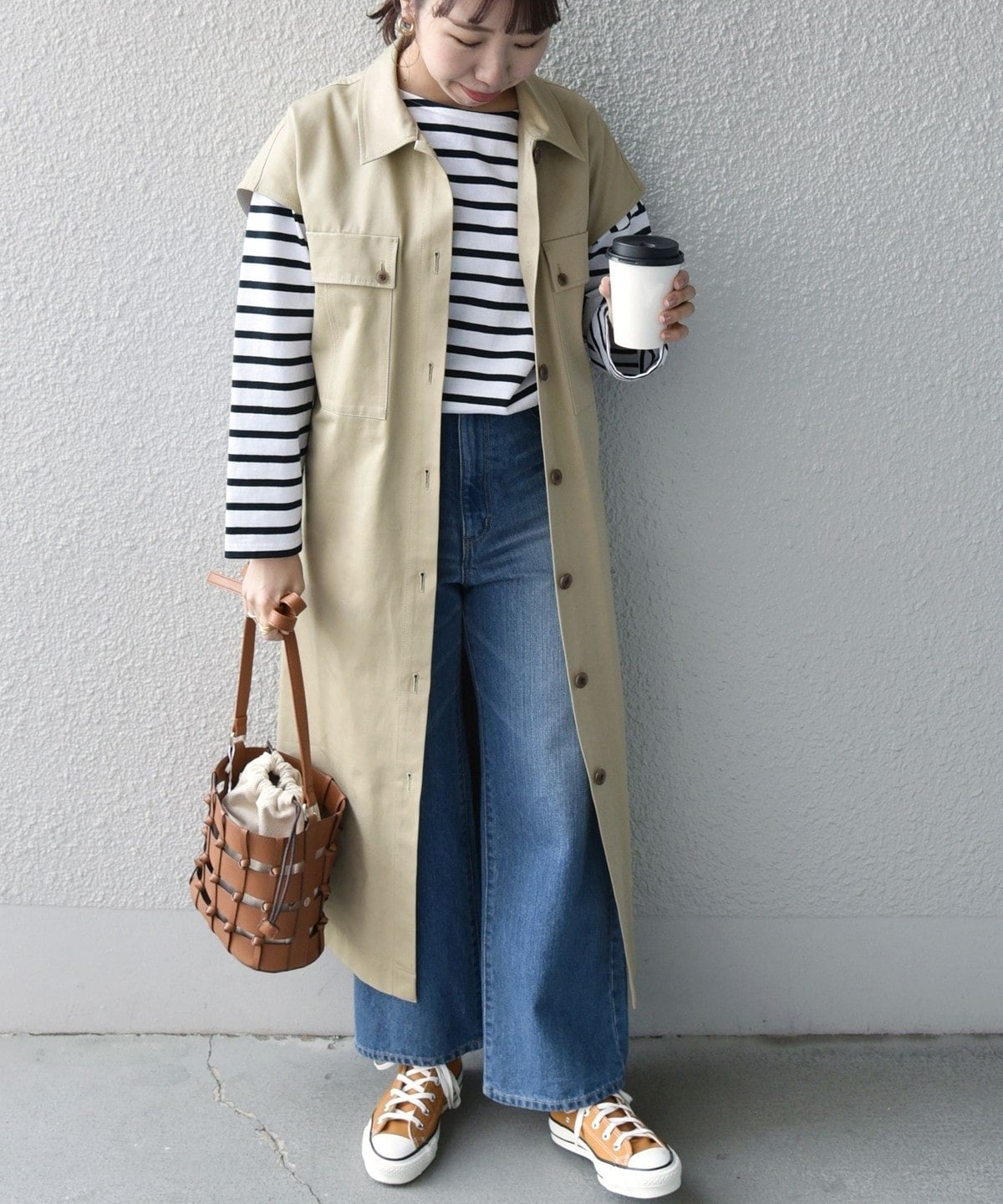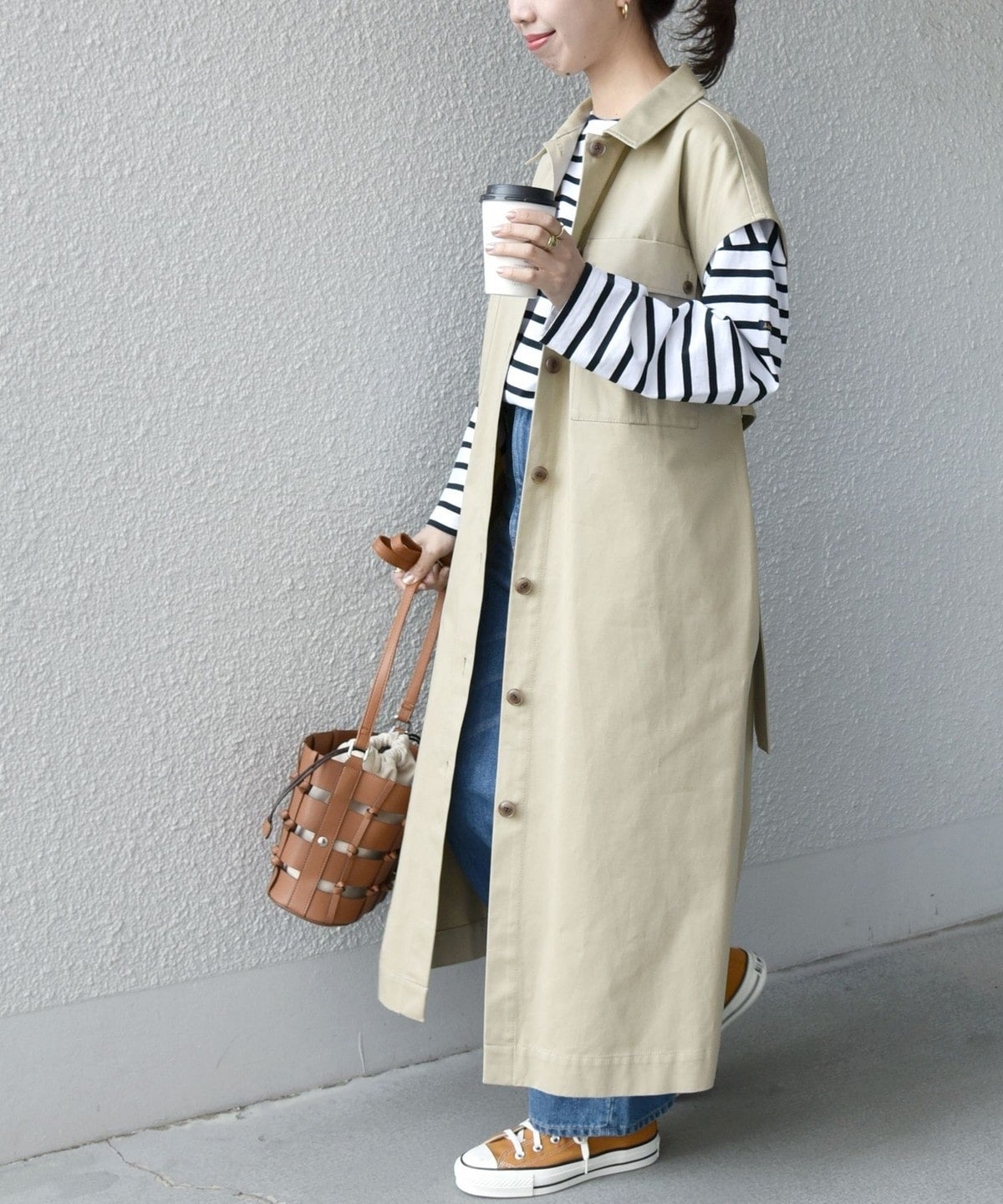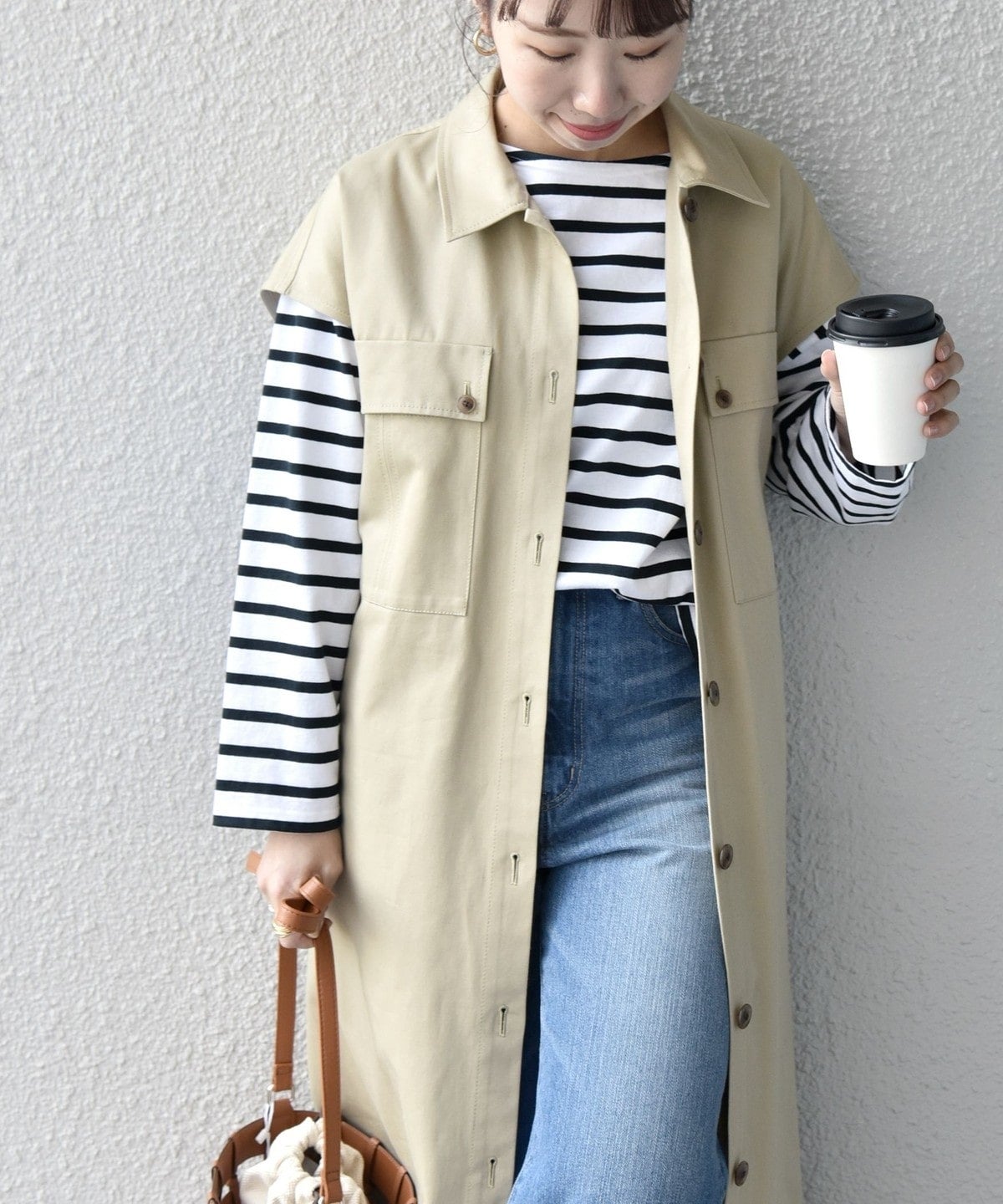 裾のボタンは開けてデニムや柄ボトムを見せて着るスタイリングもおすすめです◎