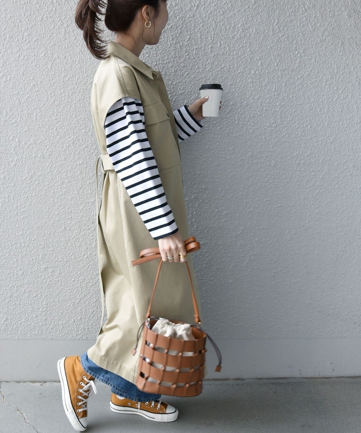 肌寒い日はタイトなハイネックのニットを合わせ、春先はカットインナーやレースブラウスなど、中に着るアイテムを変えて長く楽しめる一枚です。