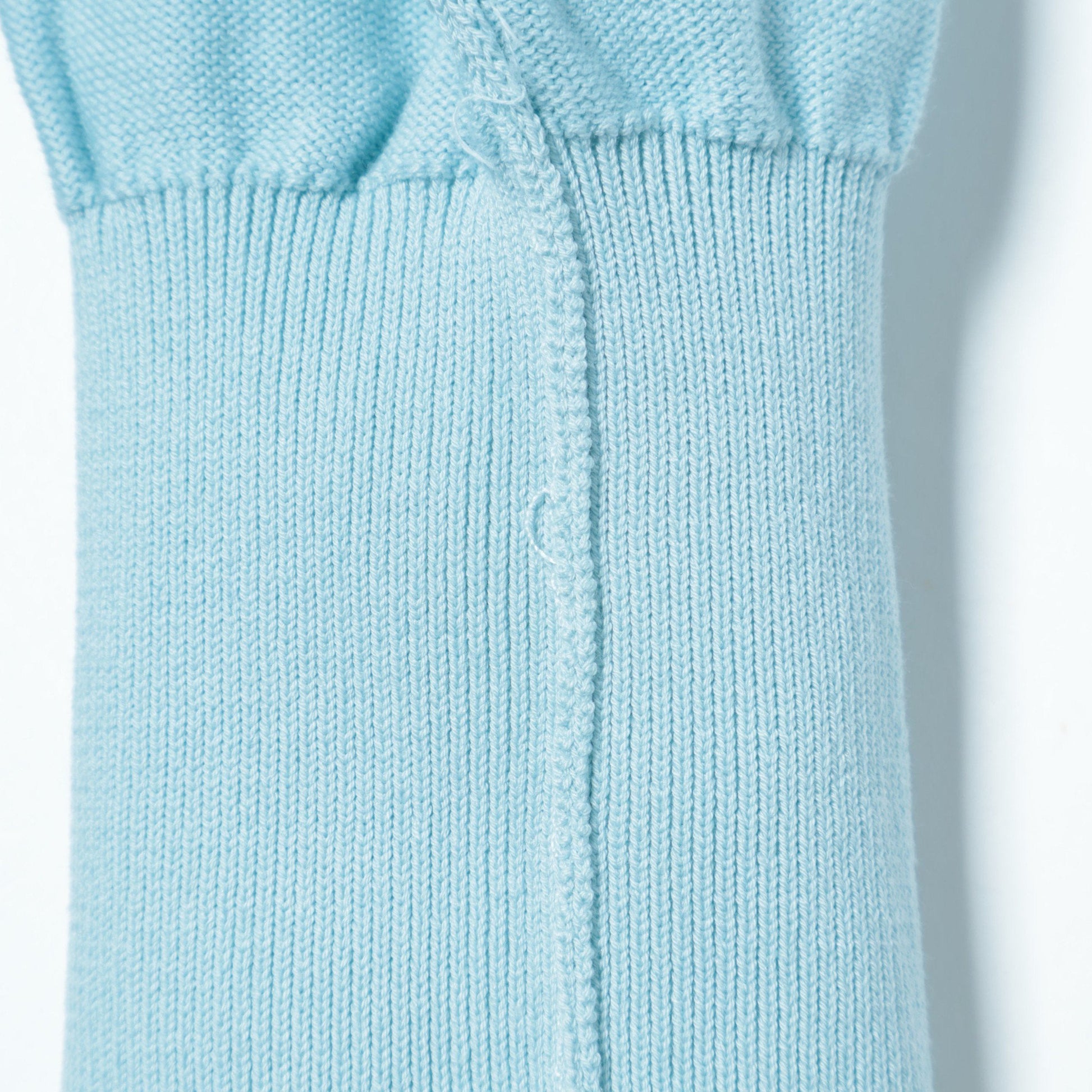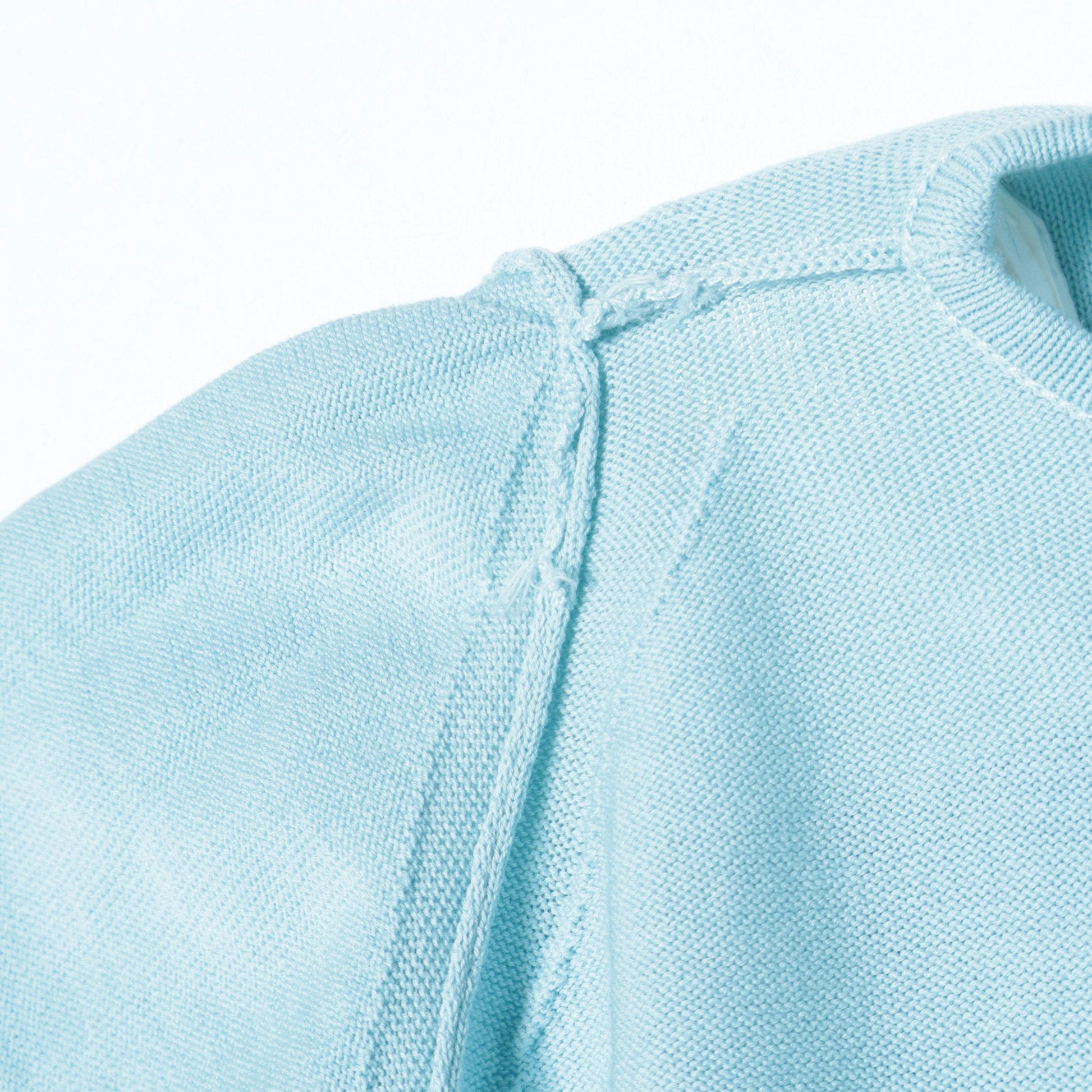 強撚のドライなタッチと綿特有の温かみのバランスが絶妙な素材感のニット。透けないように裏に極細の綿糸を一緒に編み、程良い肉感に仕上げました。ドルマンスリーブのプルオーバーは一枚でさまになり、オンオフ活躍してくれます。肩幅は狭めにすることでカジュアルすぎない印象になるようにこだわりました。ご自宅でお手入れも可能なのでデイリーに着まわせるアイテムです。
