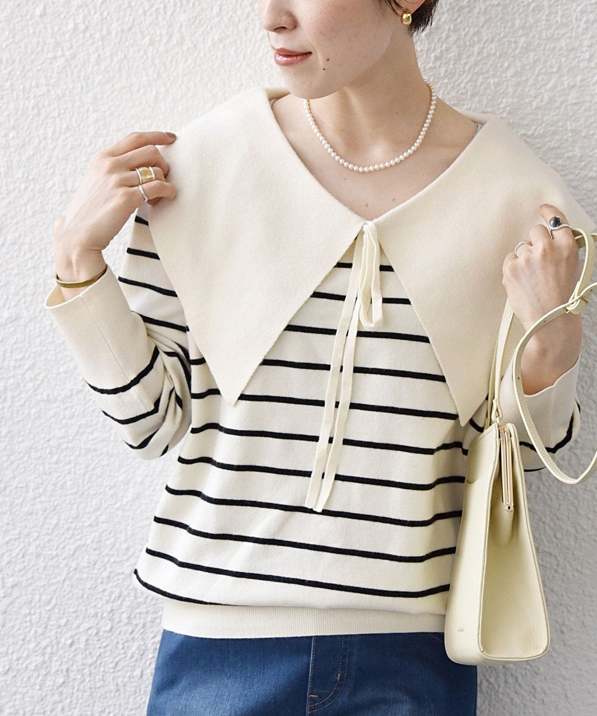 トレンドのビッグカラーが付いたニットプルオーバーが小顔効果も抜群!