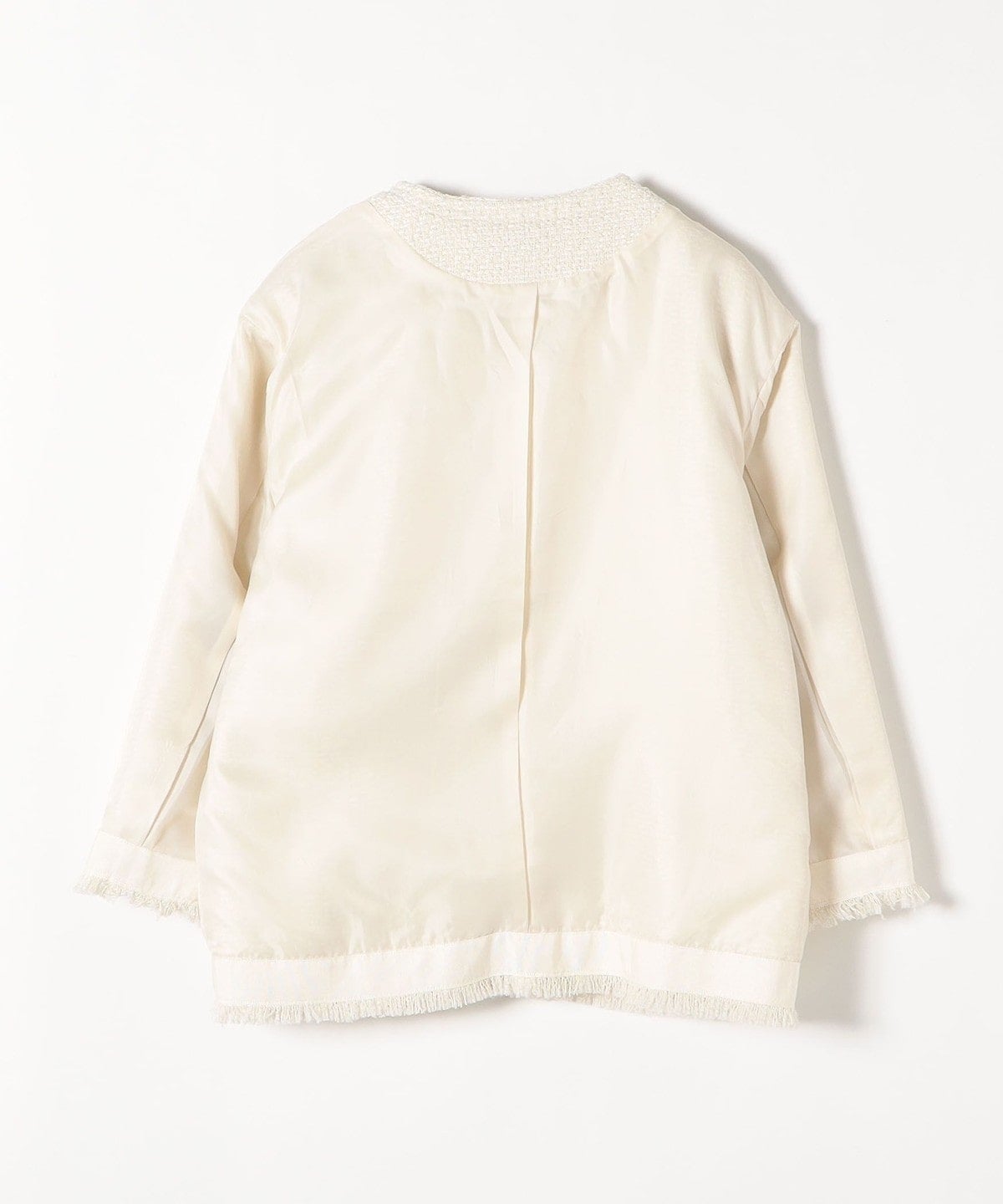 衿ぐり、裾、袖口やポケット口はフリンジを装飾し、ゆったりとした身幅や肩幅なので、カジュアルに着ていただけるジャケットに仕上げています。